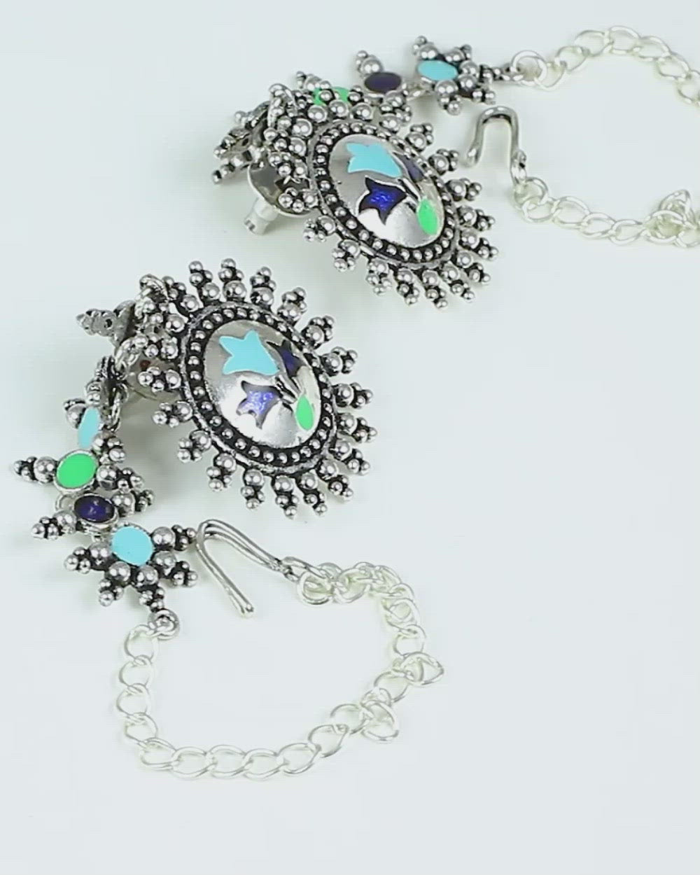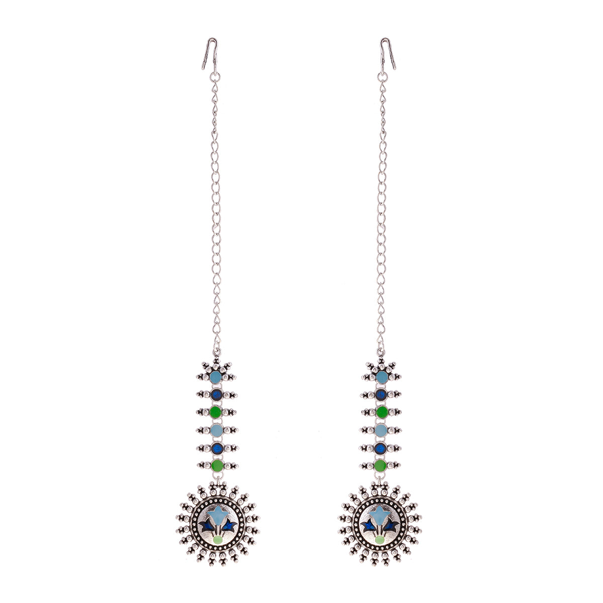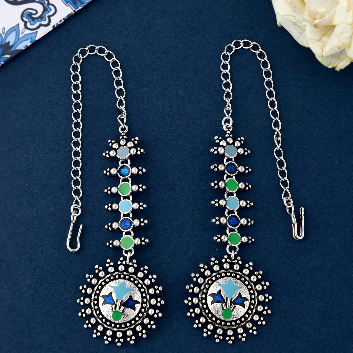 Refreshing pastel coloured circles earrings are inspired by the Sanganeri block printing. The base material is nickel free brass which is hand painted with beautiful enamelling. Wear with a formal ethnic outfit.