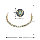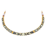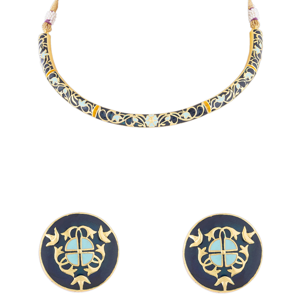 A classy, minimalistic necklace set, inspired by the traditional Rajasthani artform of Pichwwai. Featuring bird and floral motifs, the enameled choker and stud earrings have been fashioned out of brass. Pair the yellow gold plated set with a formal gown.