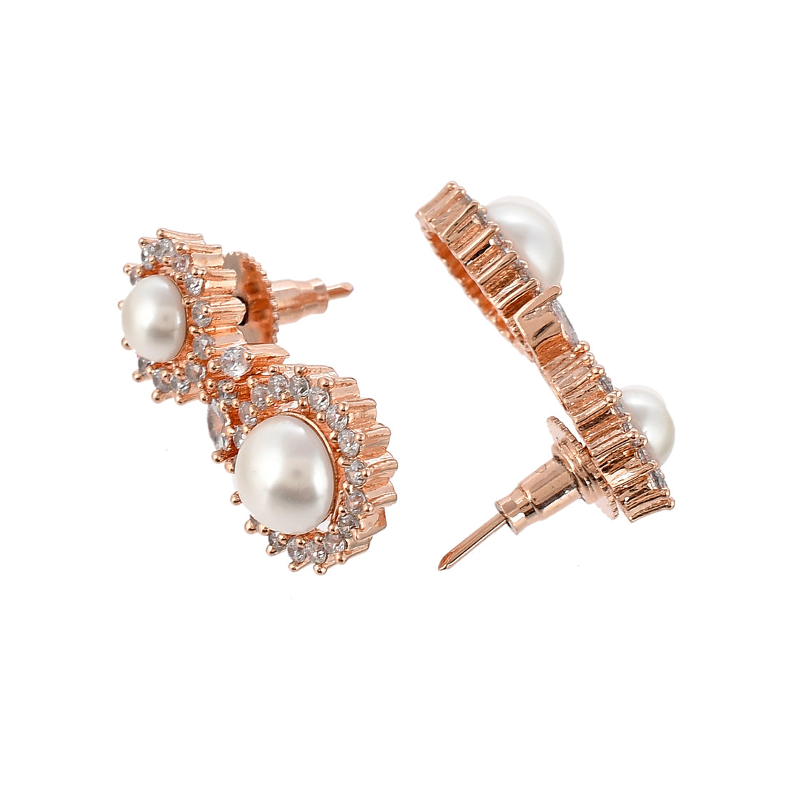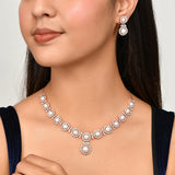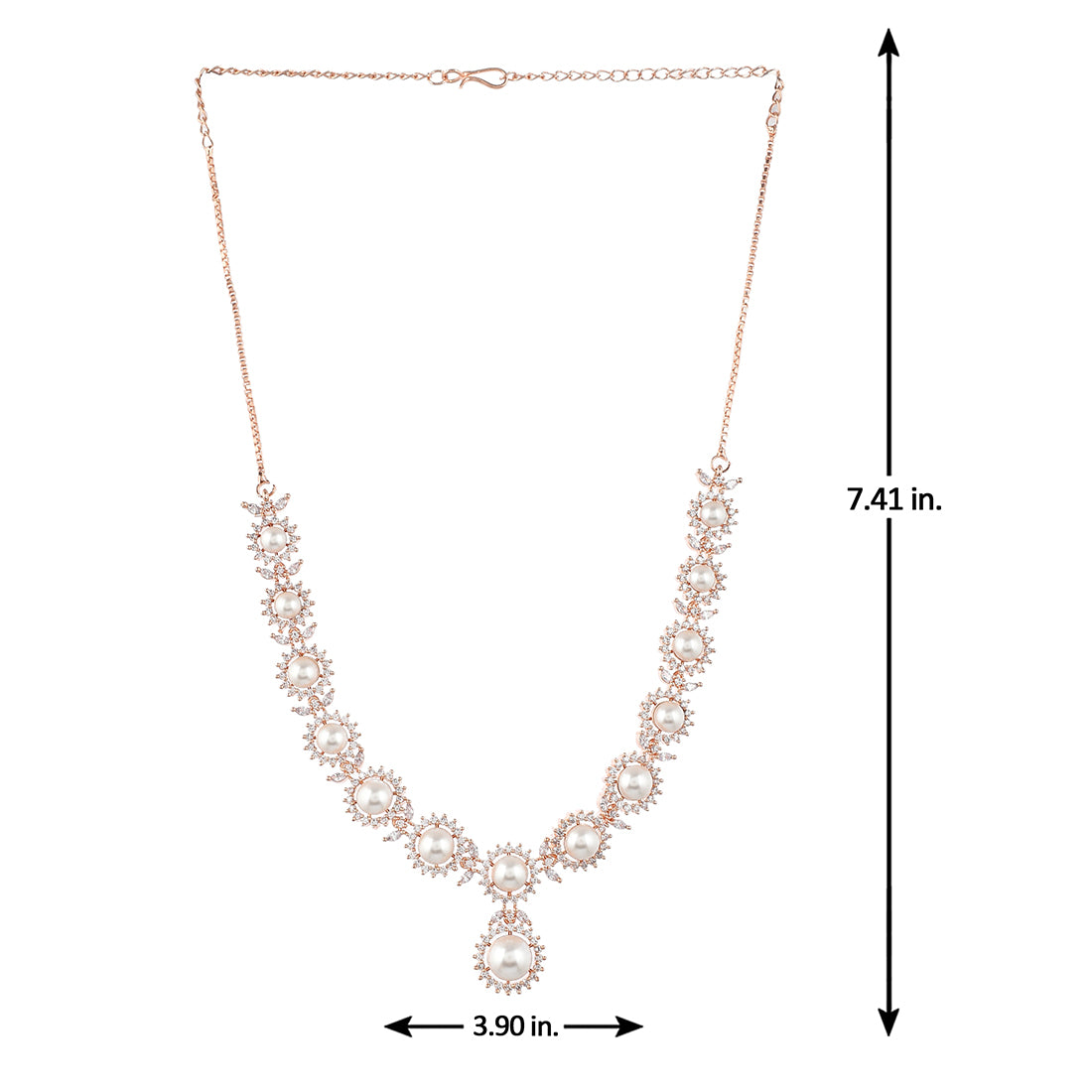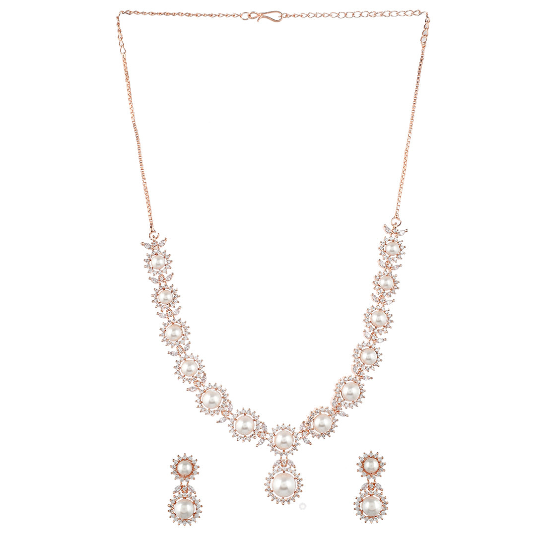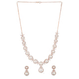 The rose plated necklace set from CZ collection is a stunning piece of jewellery that is sure to make a statement. Made of brass with a rose gold finish, the necklace features a large white stone pendant that is surrounded by sparkling CZ stones, adding a touch of glamour to the piece. This set is perfect for special occasions and will complement any outfit, making it a must-have for any jewellery collection.