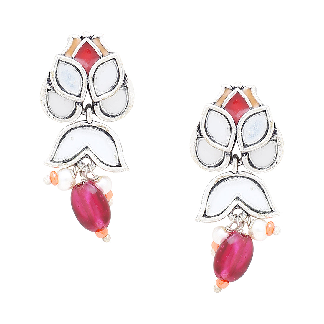 Brass earrings featuring tiny lotus flower motifs, inspired by Thikri, a traditional Rajasthani art form associated with luxury and opulence. Oxidised silver plated and enameled, the pair has been embellished with mirror and stone details. Good for casual ethnic looks.