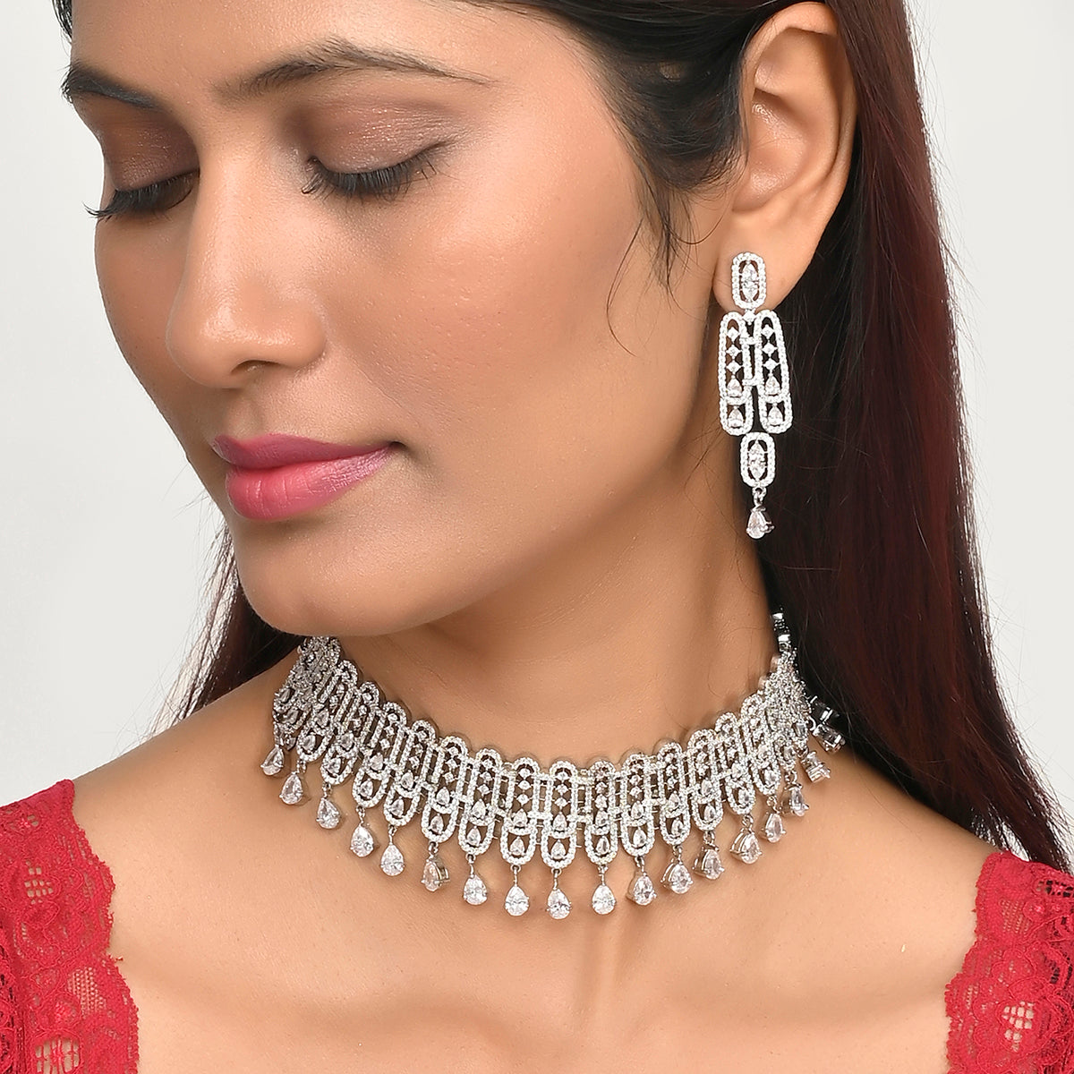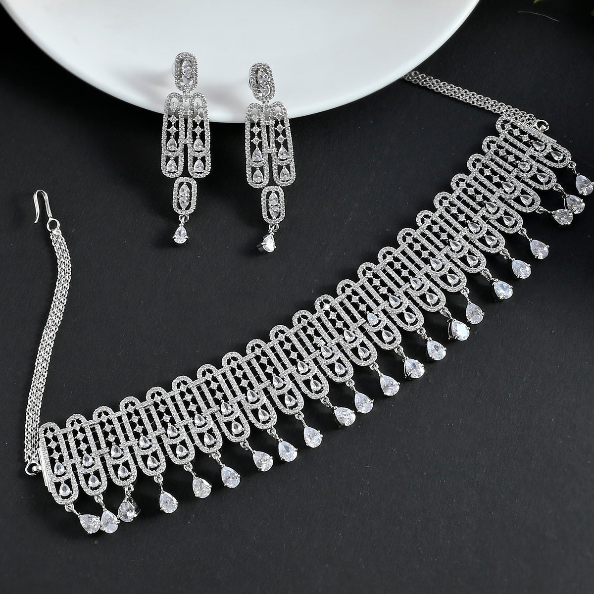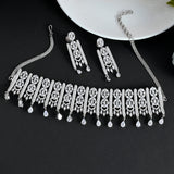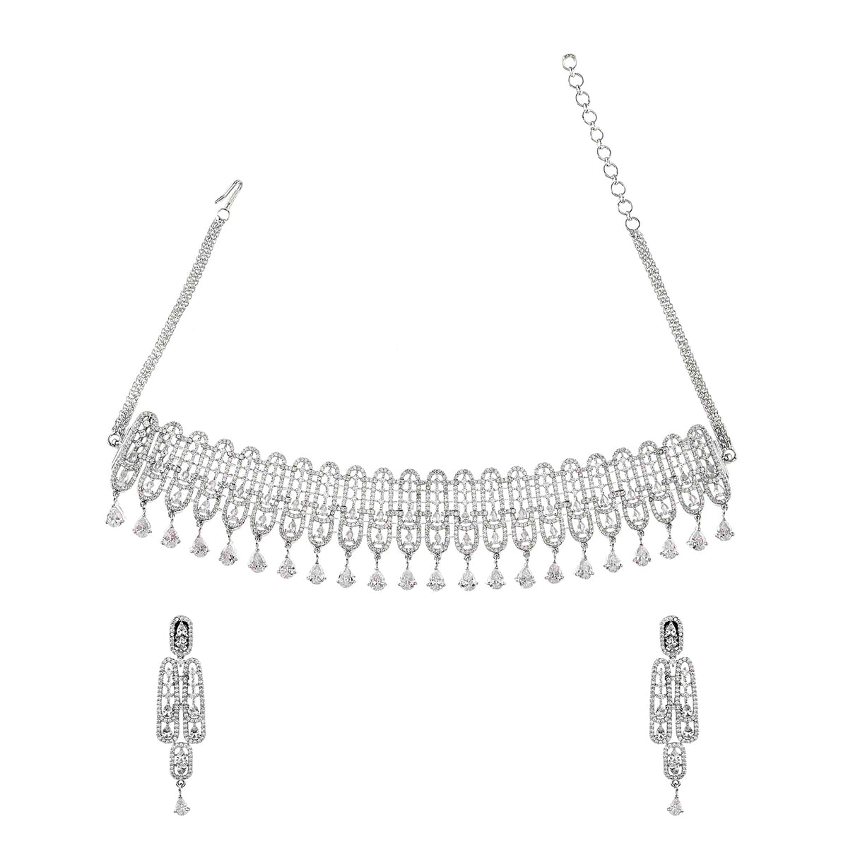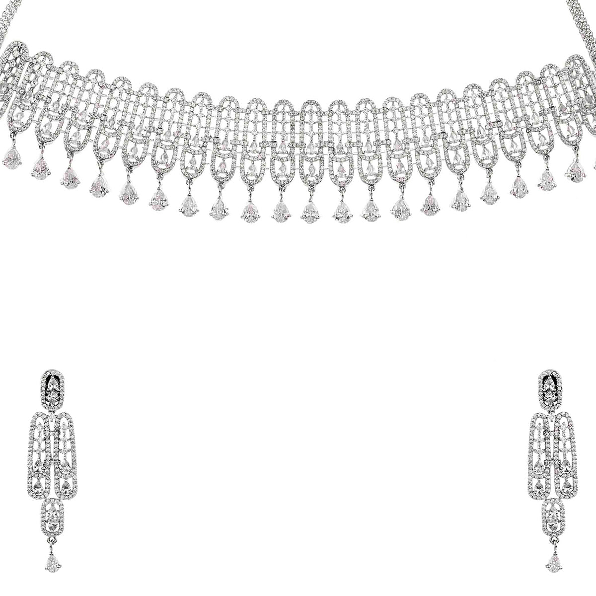 Pear cut zircons jewellery set, made from brass and features a lovely silver plating. Lightweight, comfortable and versatile, the set can be paired with just about everything.