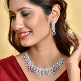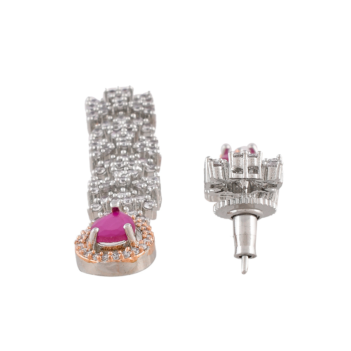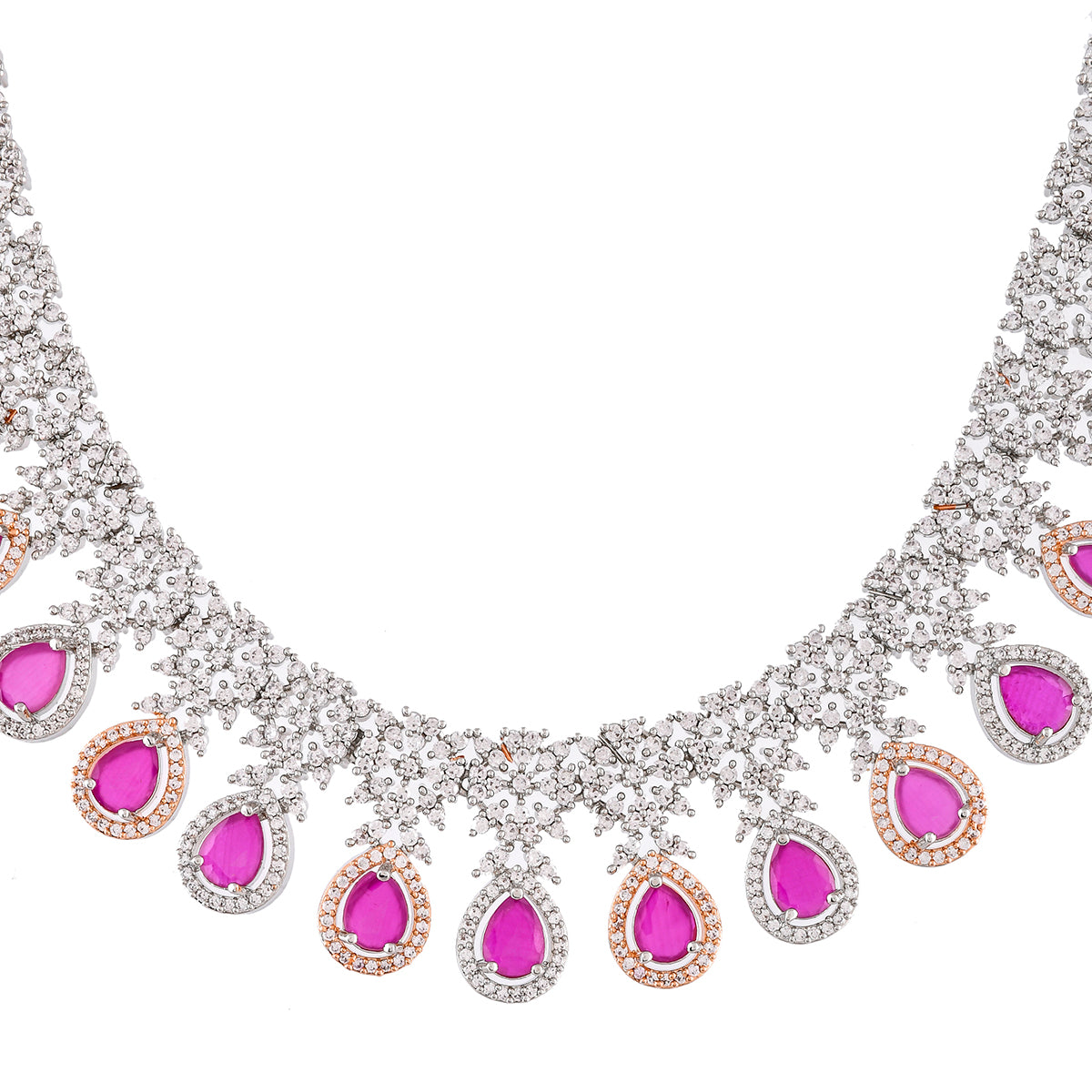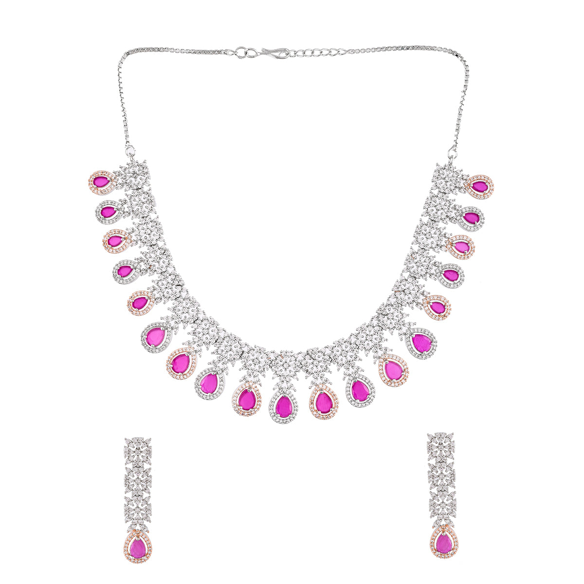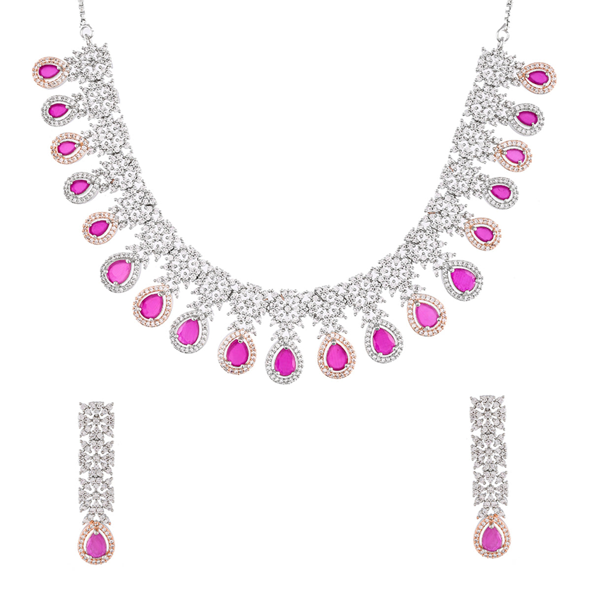 Pink teardrop cut zircons and white cluster setting zircons adorned brass jewellery set with two tone plating. Designed for style and comfort.