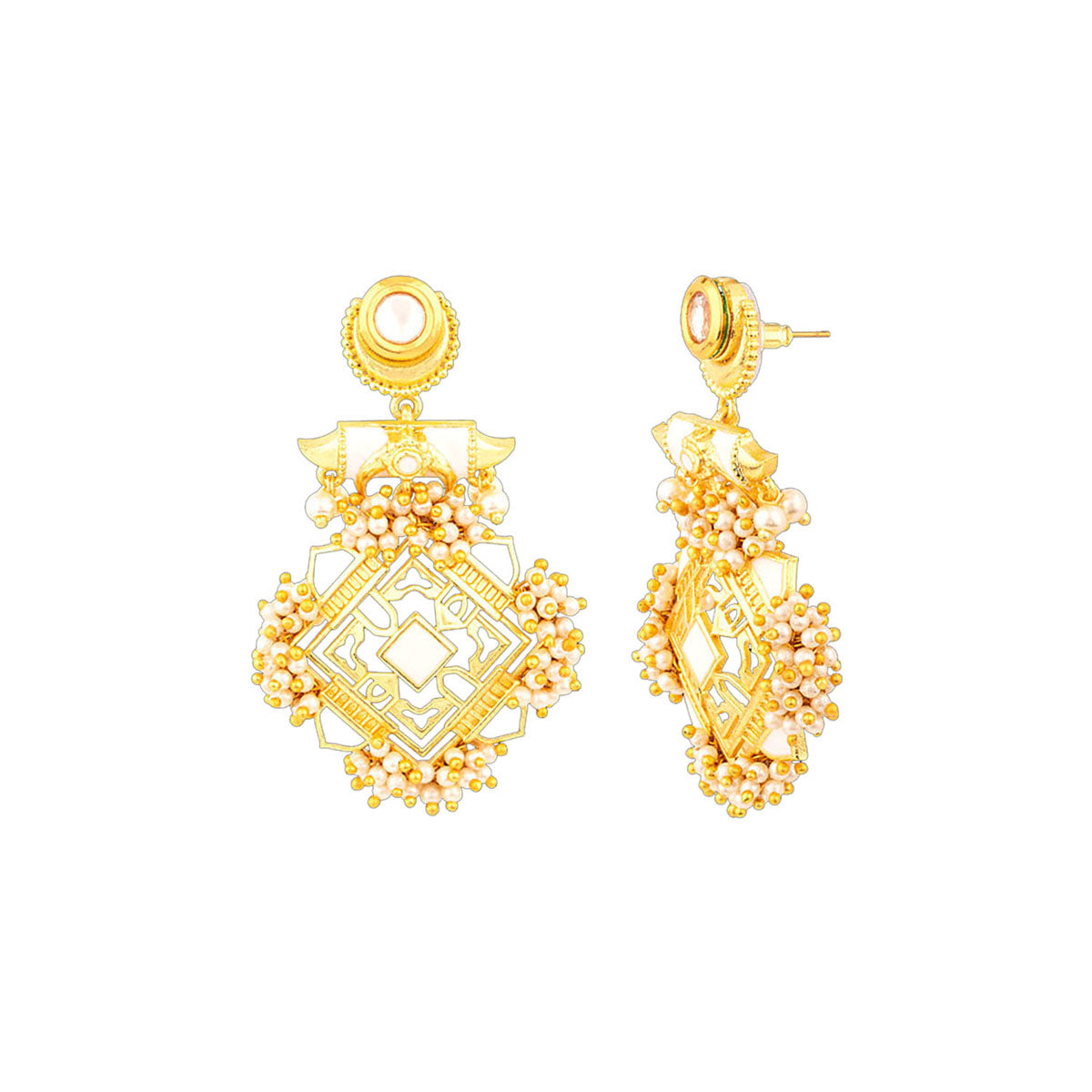 Embellished with faux pearls and light enamel details, these drop earrings have been fashioned out of quality brass. Silver plating adds to their rustic charm. Pair the earrings with a saree, kurta and jeans outfit or even an ethnic skirt.Caring...