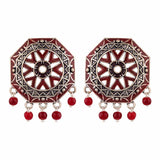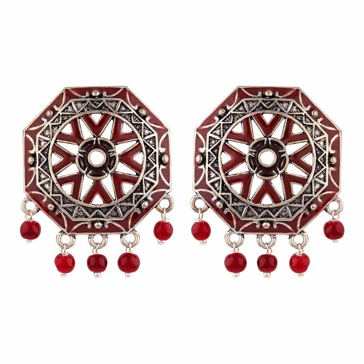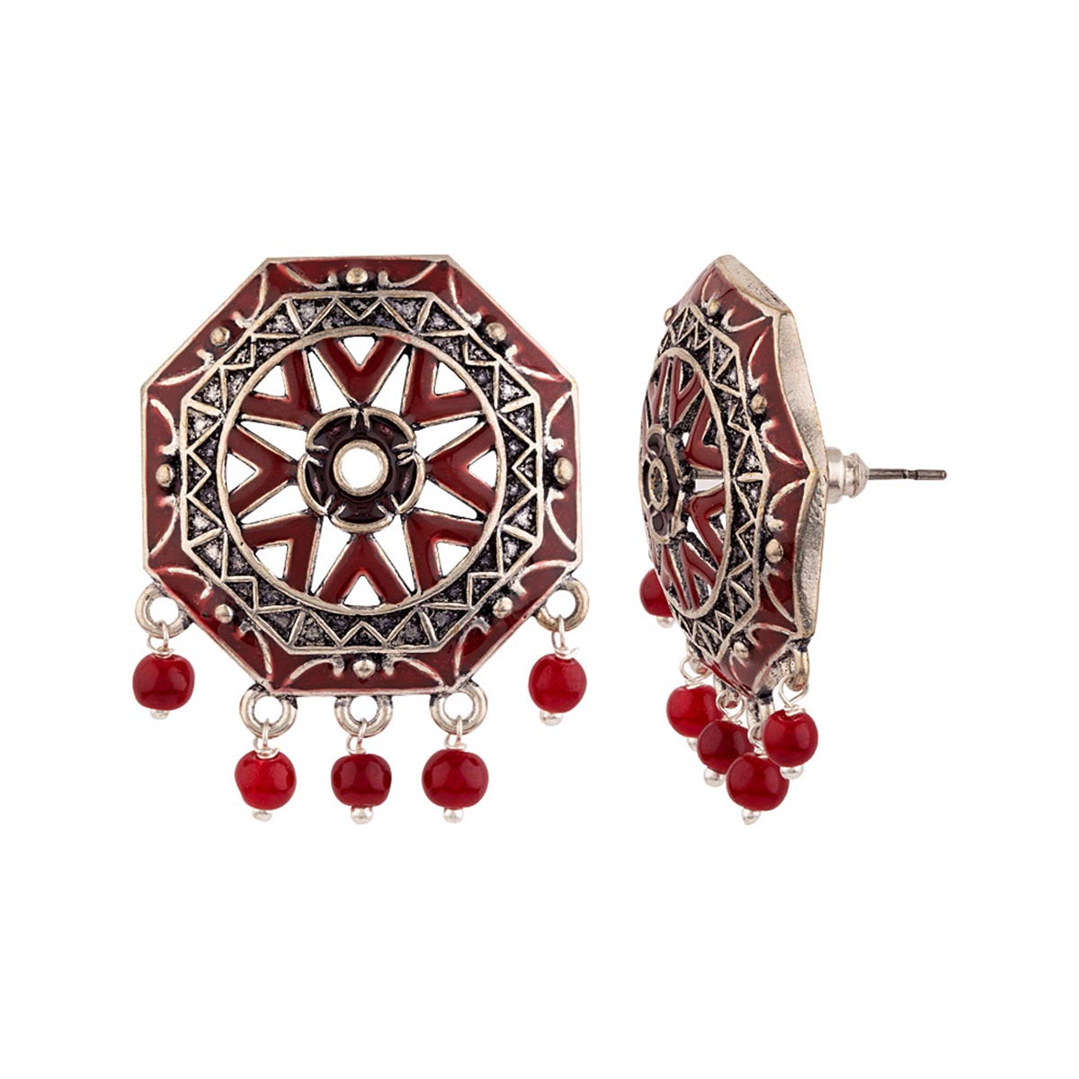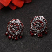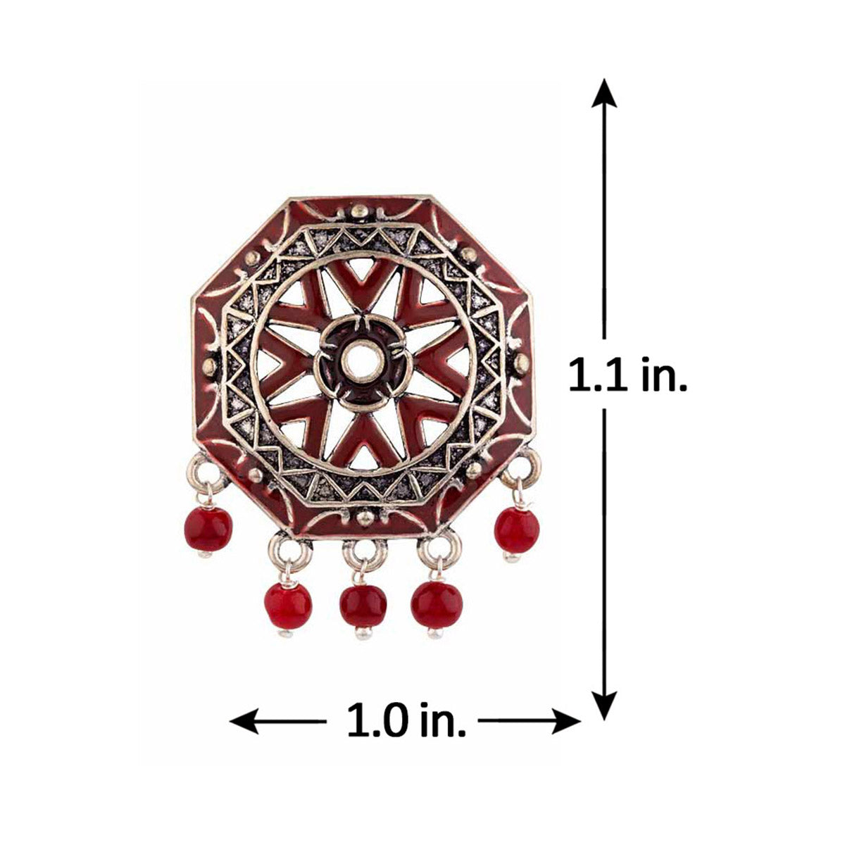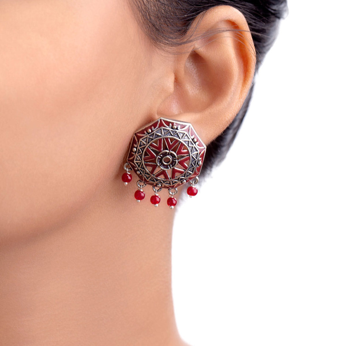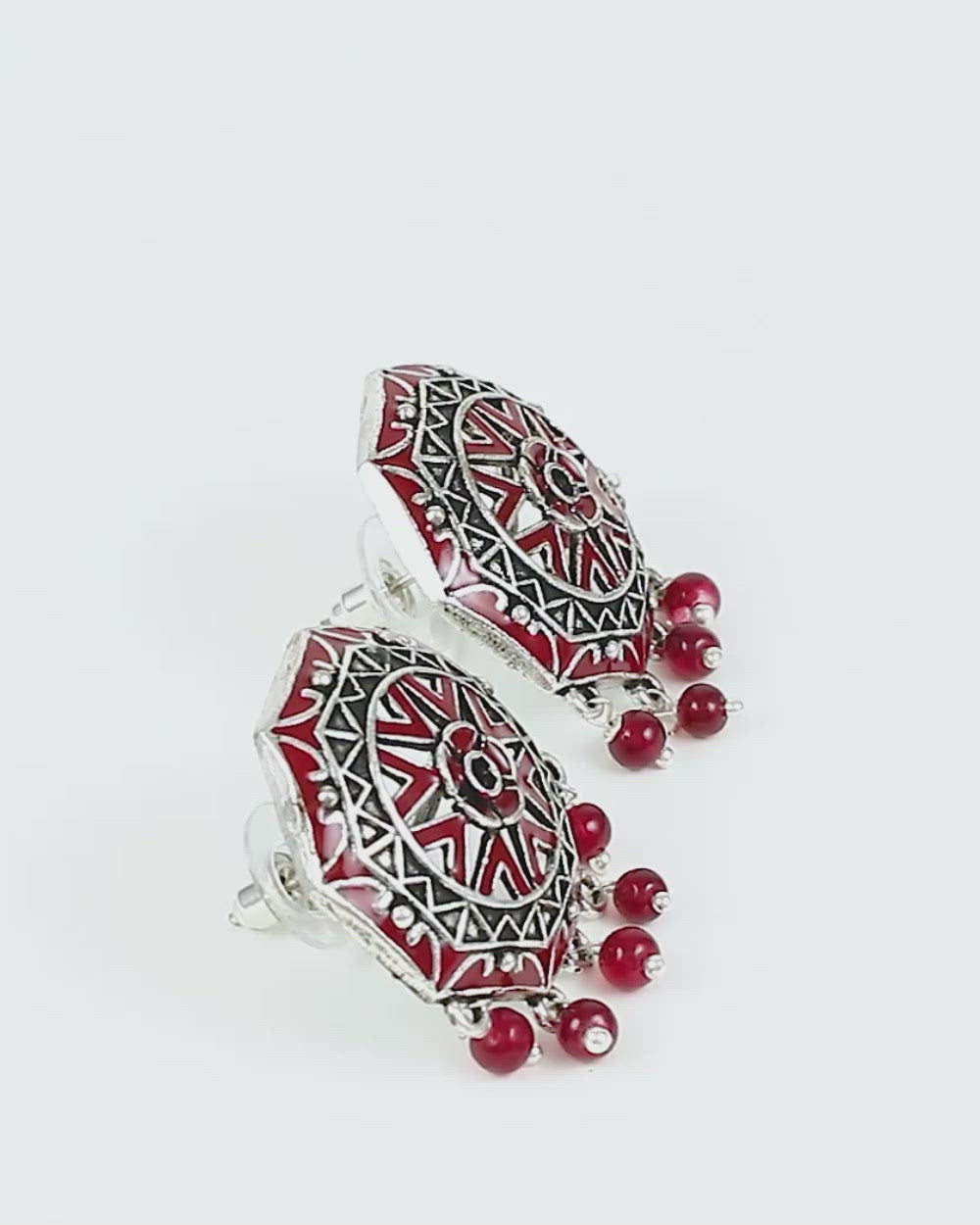 Disc earrings with maroon embellishments. Made from brass and oxidized silver plated Pair with a casual kurta.