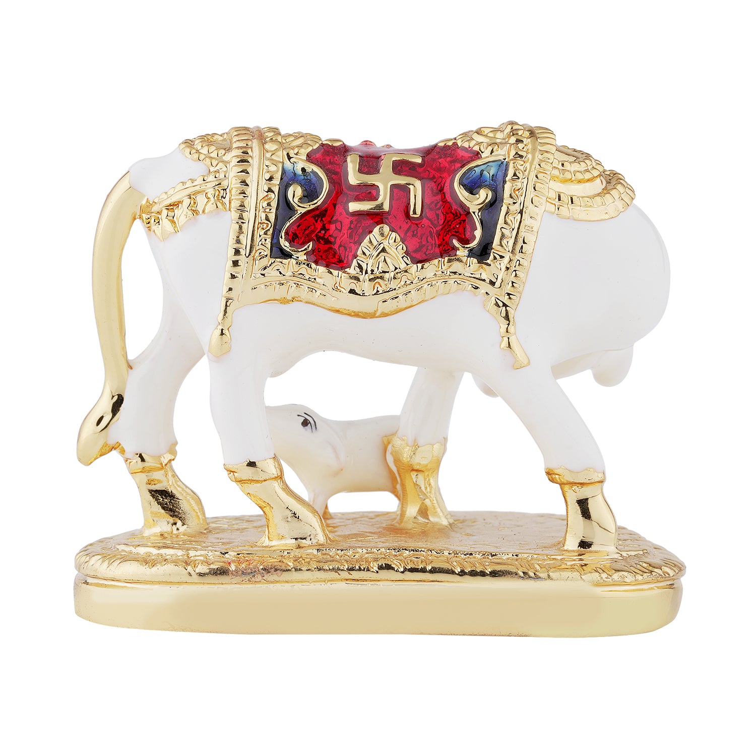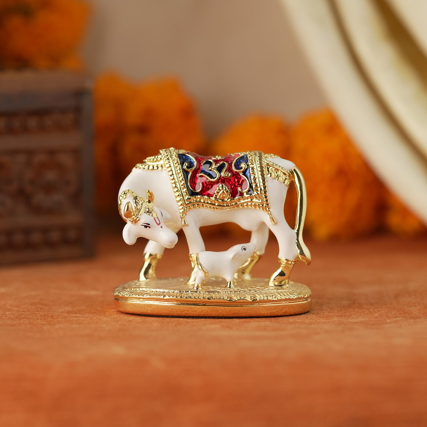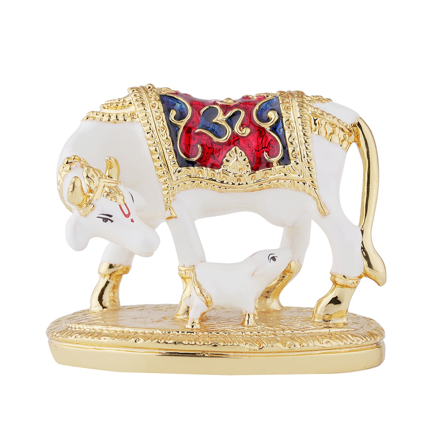 Voylla's exquisite cow festive idols are meticulously crafted from premium resin, showcasing intricate detailing and vibrant colors. The idols feature a serene cow adorned with golden and white hues, exuding a divine presence. The detailed craftsmanship highlights delicate features such...