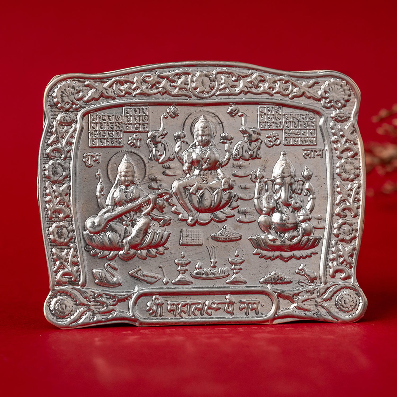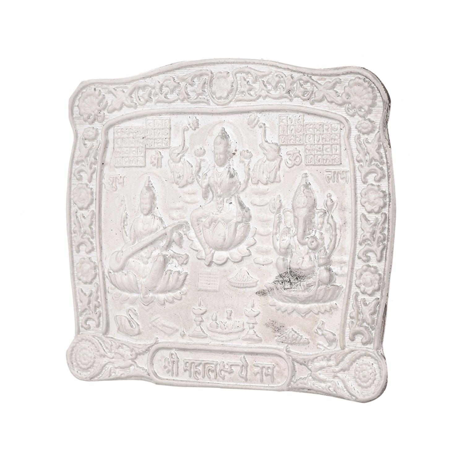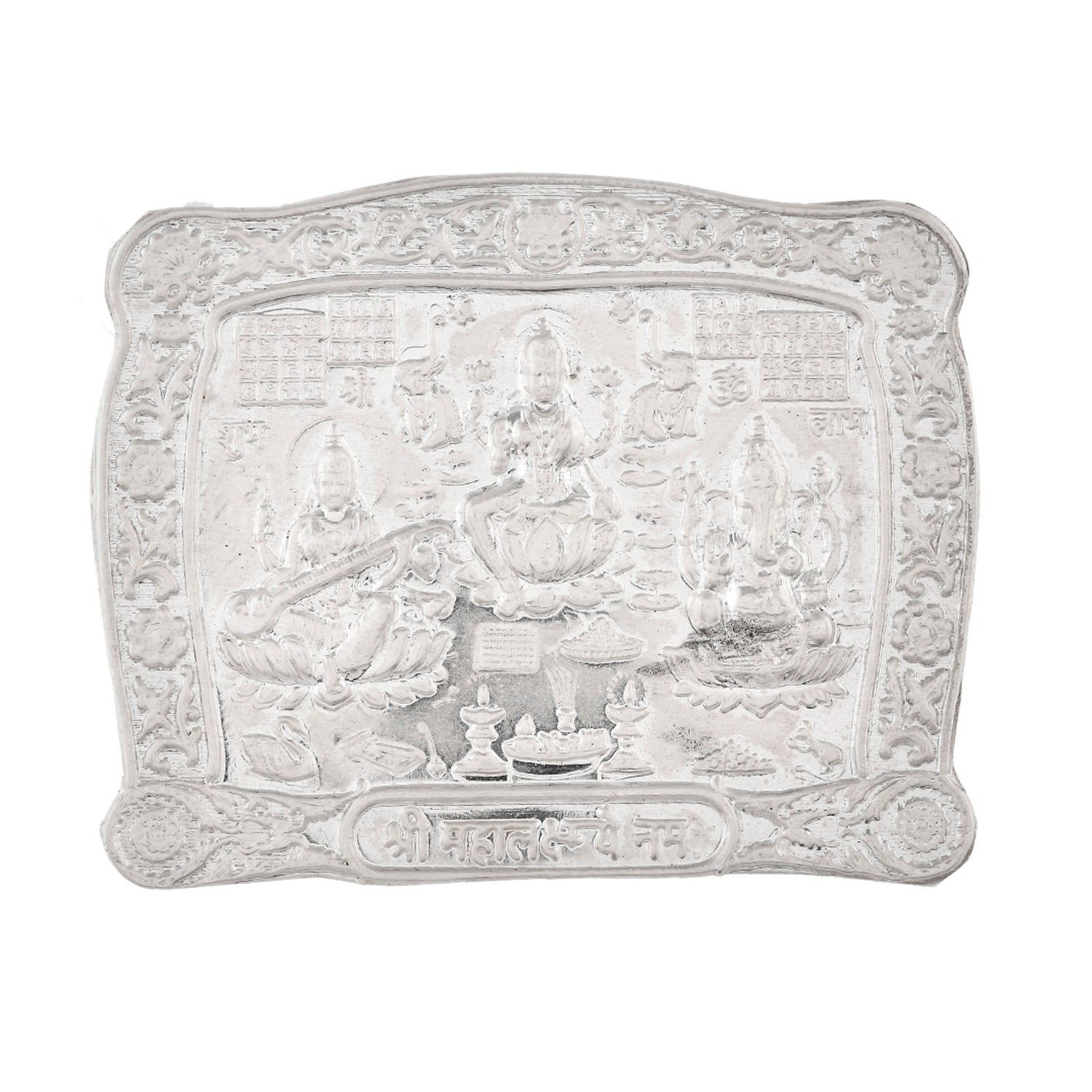 Invoke divine blessings with the Voylla 92.5 sterling silver Lakshmi Ganesh Saraswati Patra, beautifully embossed with Goddess Lakshmi, Lord Ganesh, and Goddess Saraswati. Crafted in hallmarked sterling silver with intricate detailing, this auspicious silver pooja plate is ideal for Diwali puja, Dhanteras rituals, Navratri celebrations, Grihpravesh ceremonies, weddings, anniversaries, and housewarming gifts. Representing prosperity, wisdom, and success, the Patra is perfect for placing in your home temple, pooja room, or office desk as a symbol of positive energy and divine protection. Highly revered in Indian tradition, this Lakshmi Ganesh Saraswati silver patra also makes a thoughtful and everlasting silver gift for festive occasions, spiritual rituals, and corporate gifting. Its sacred design and premium silver purity make it a cherished keepsake, blending tradition, spirituality, and elegance in one timeless piece.