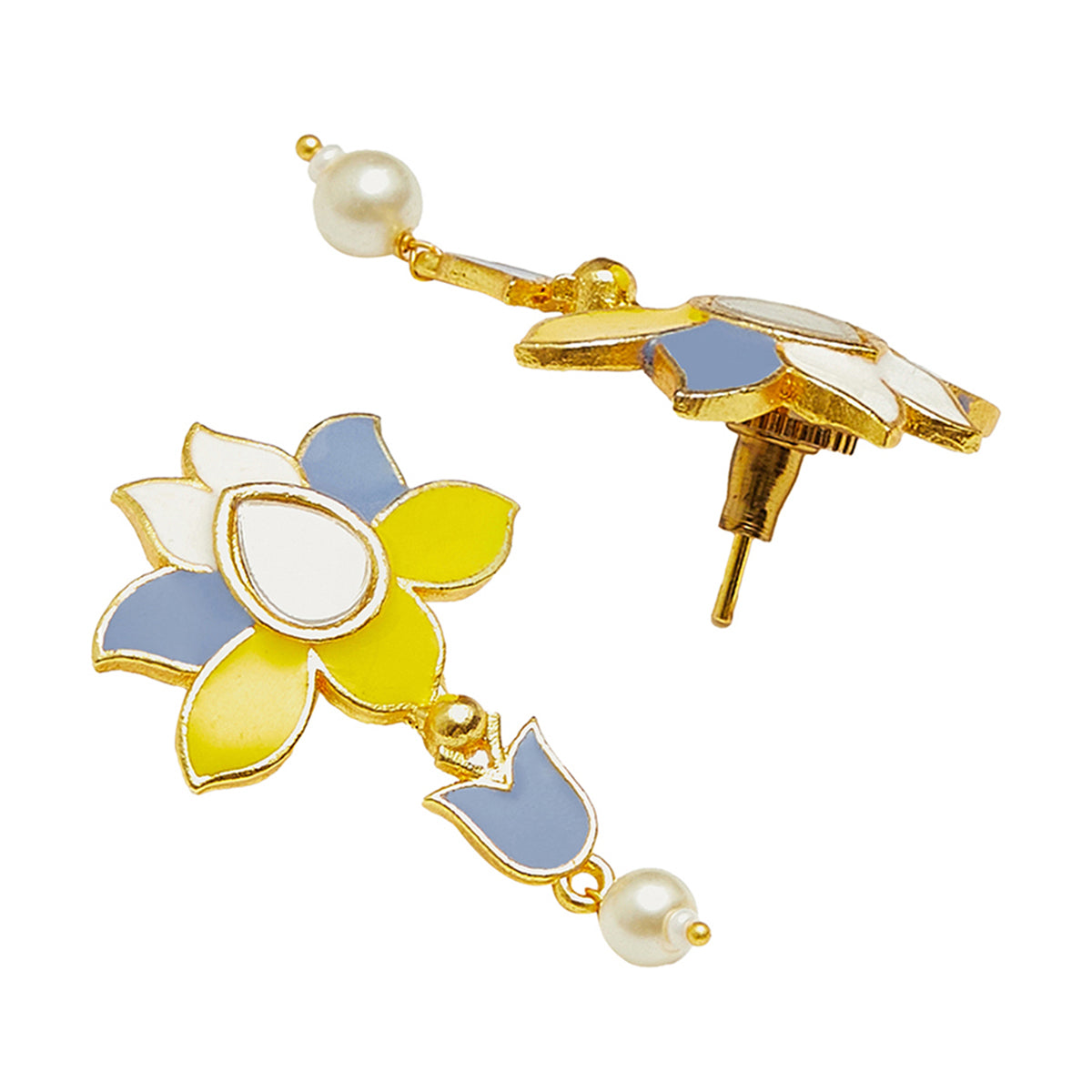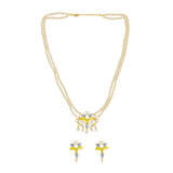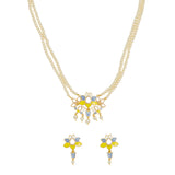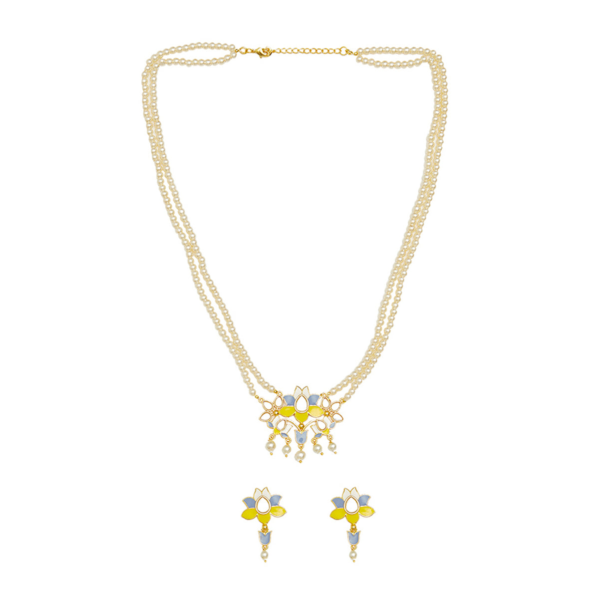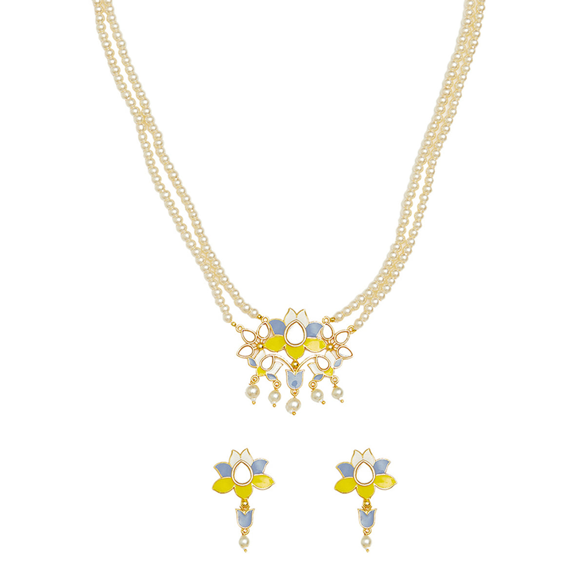 Embellished with white faux pearls and enamel details, this jewellery set has been fashioned out of quality brass. Featuring floral inspired motifs, the necklace and earrings have been given a yellow gold plating. Pair the set with a silk saree or Indo-Western gown.