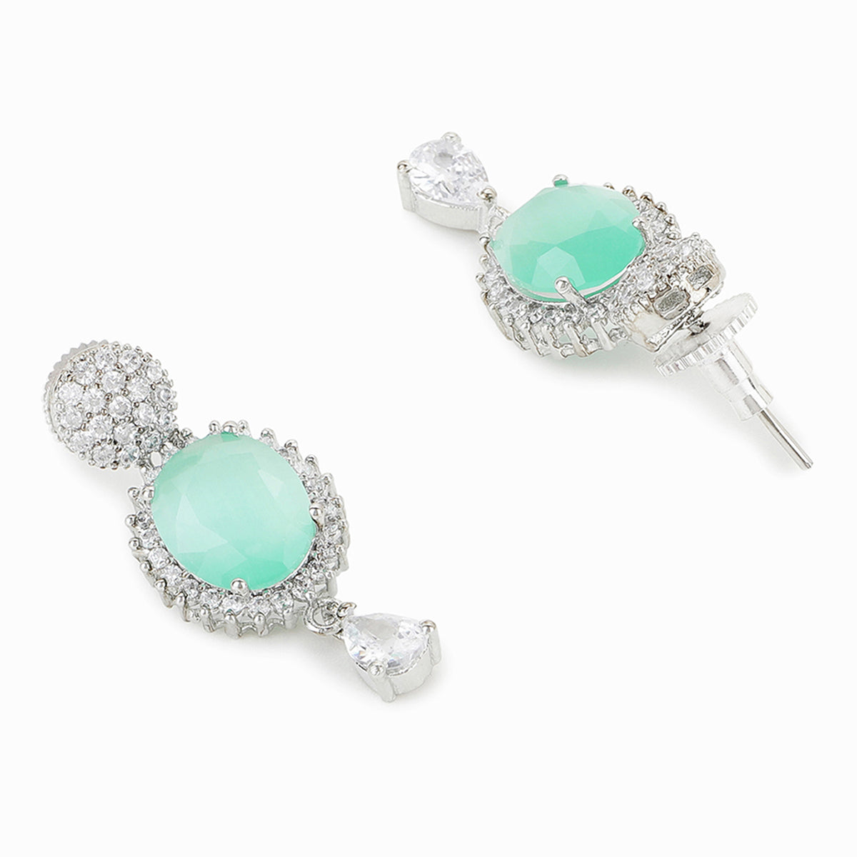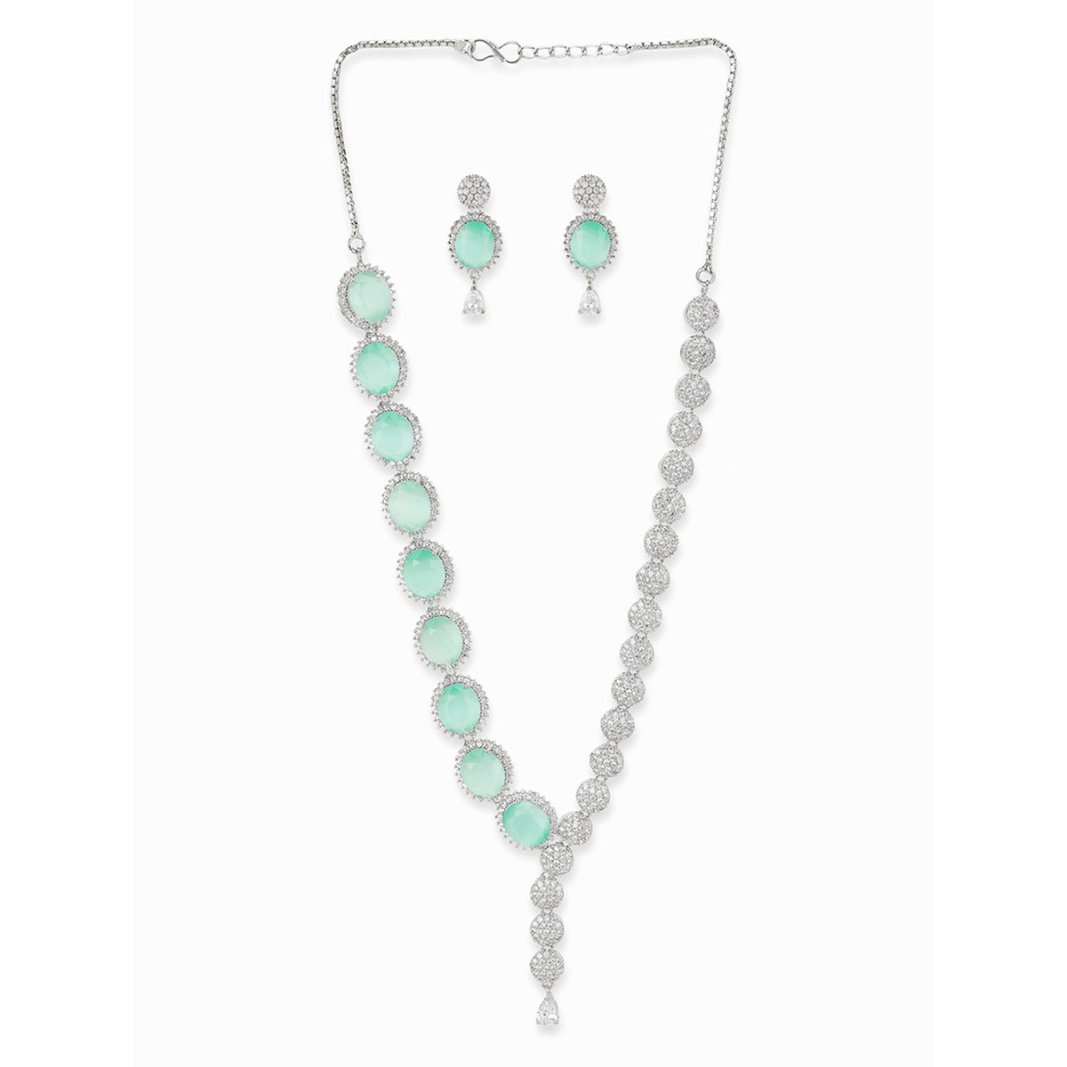 Green and White Triangle Cut CZ Adorned Brass Silver Plated Jewellery Set