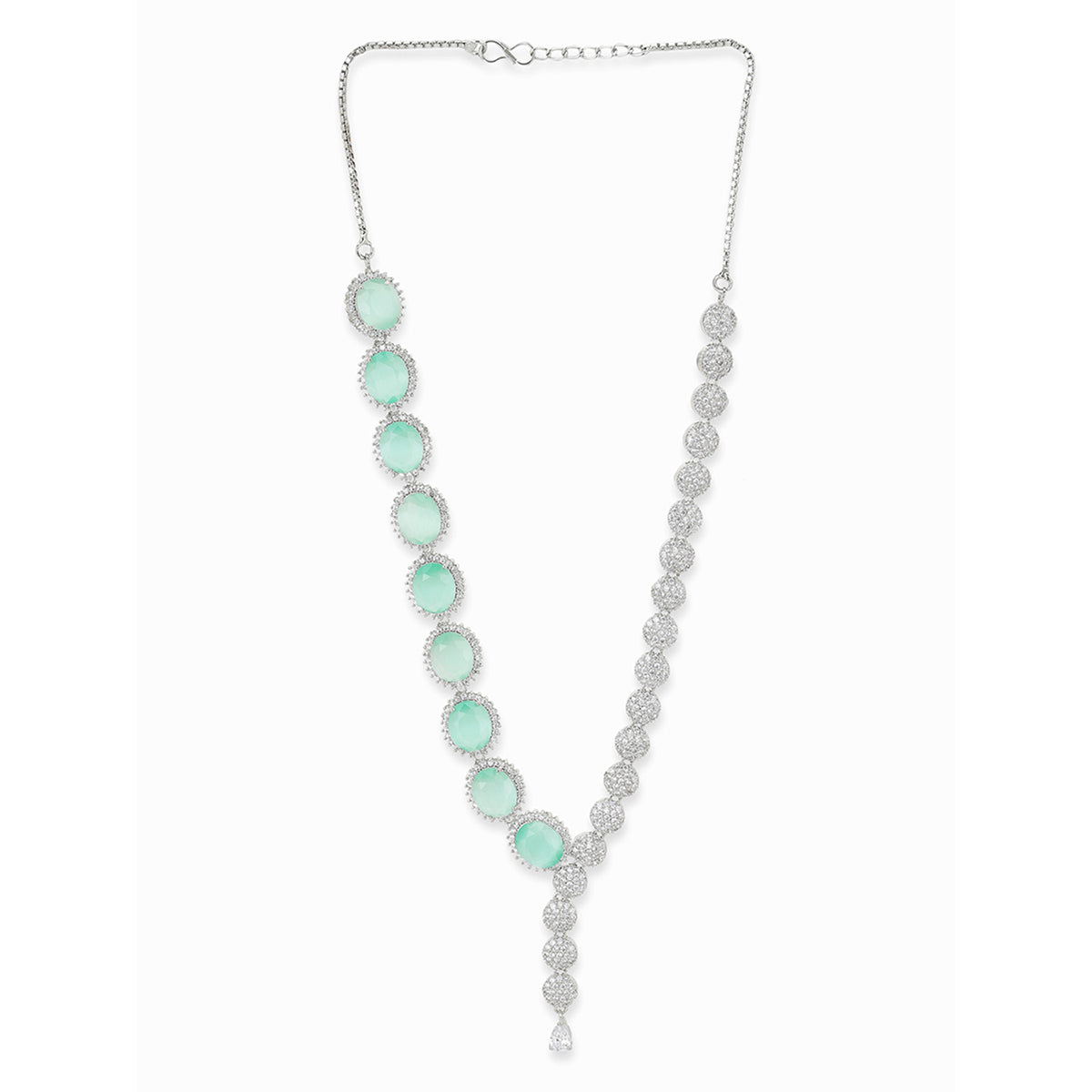 Silver plated brass jewellery set with green and white zircons gemstones in a classic cluster setting. Pair with a designer saree.Caring for your fashion jewelry: We, at Voylla, take care of every piece of jewelry so that you don't spend...