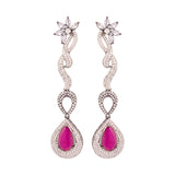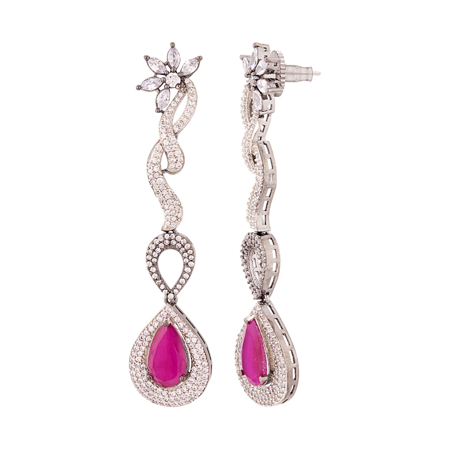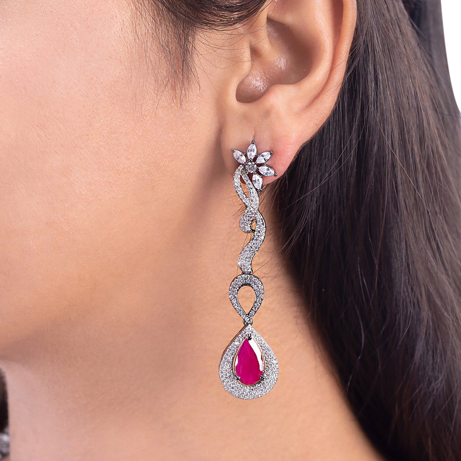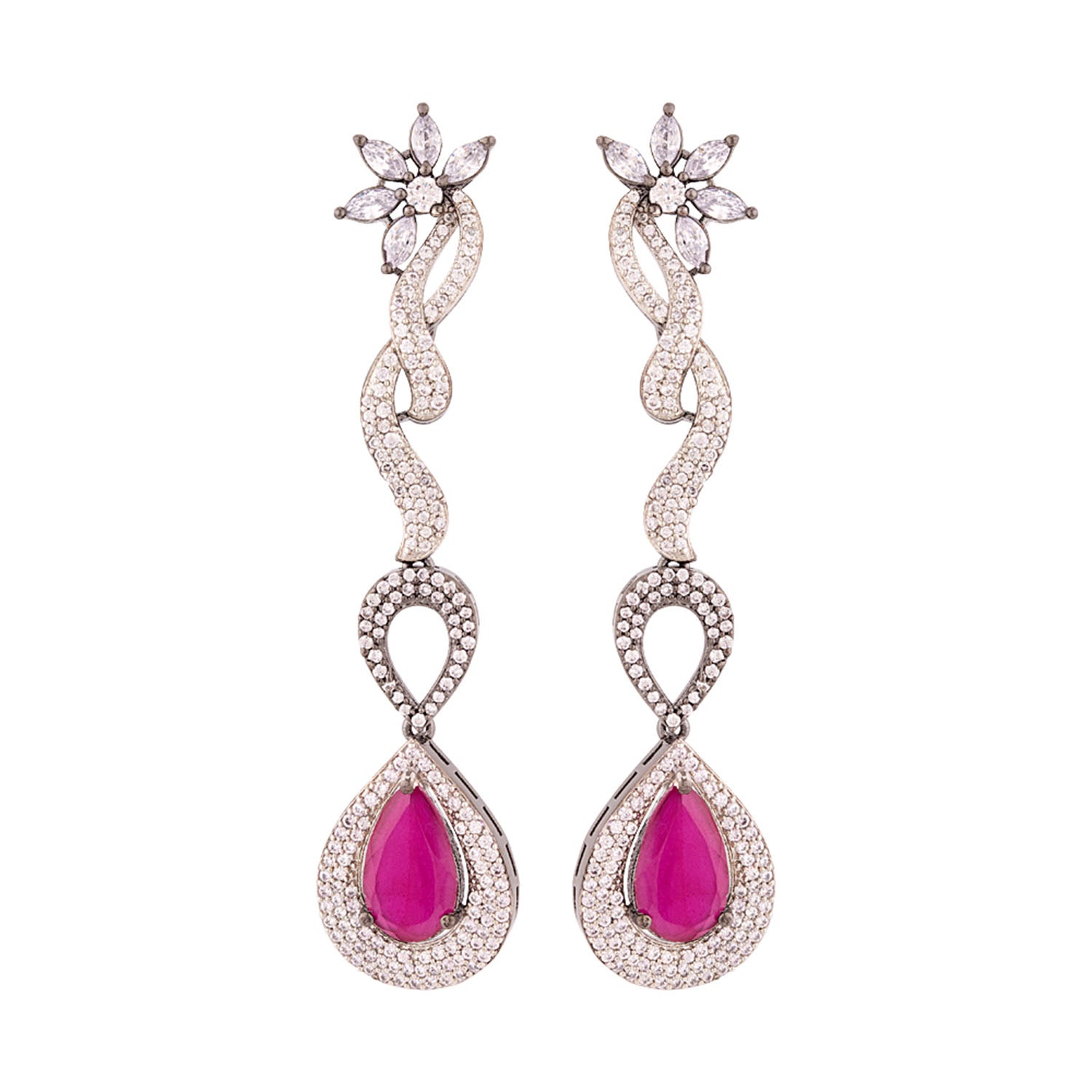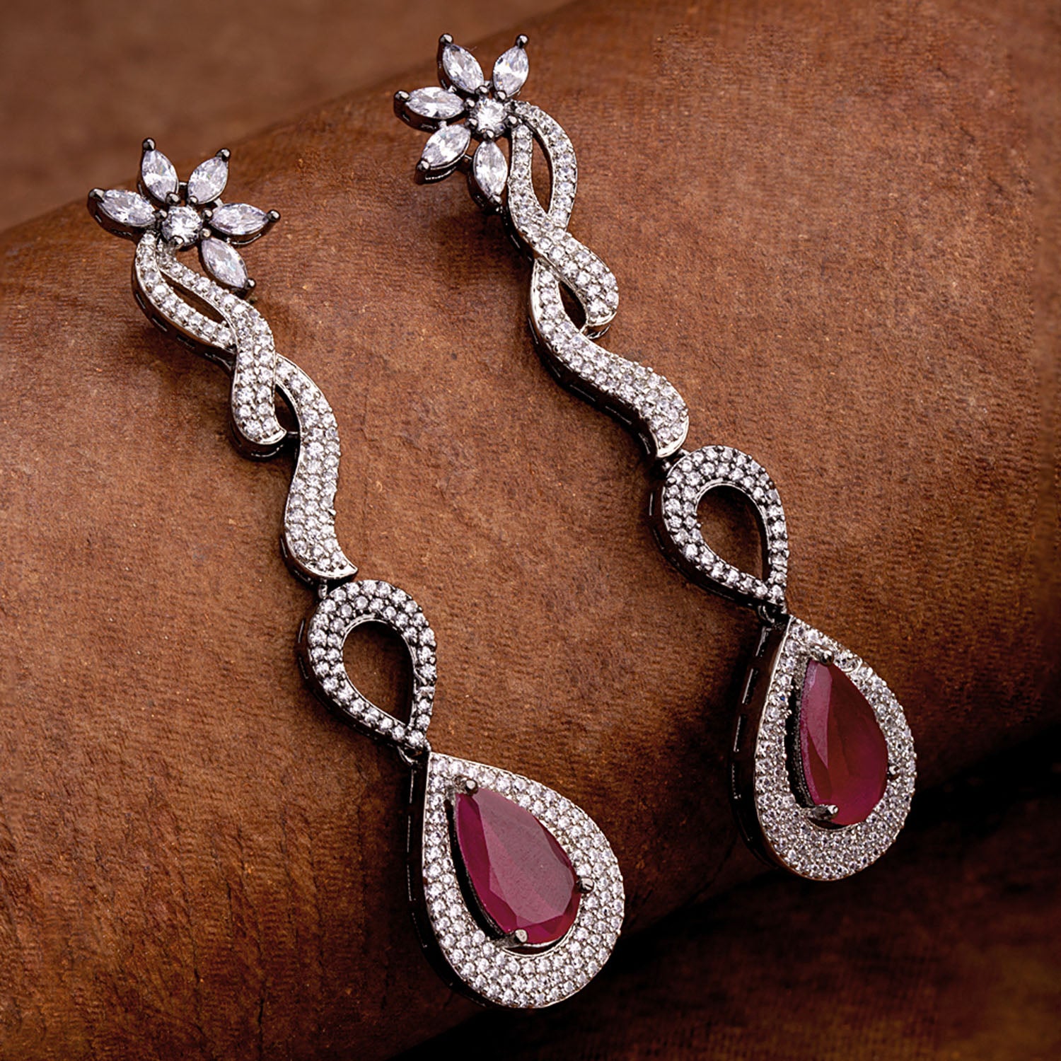 Statement earrings with floral motifs, made from brass and black rhodium plated. American Diamond gems embellished. Good for formal looks.