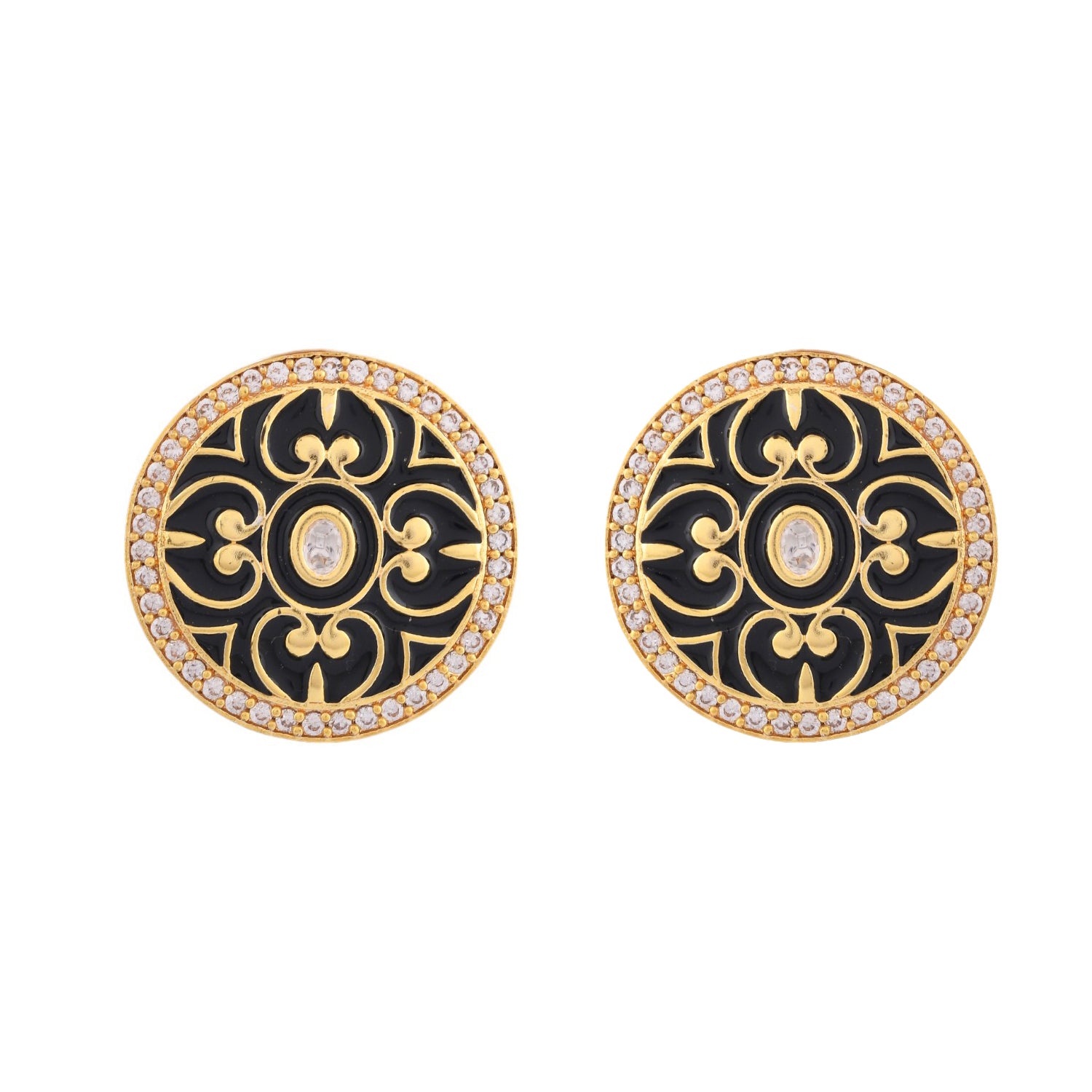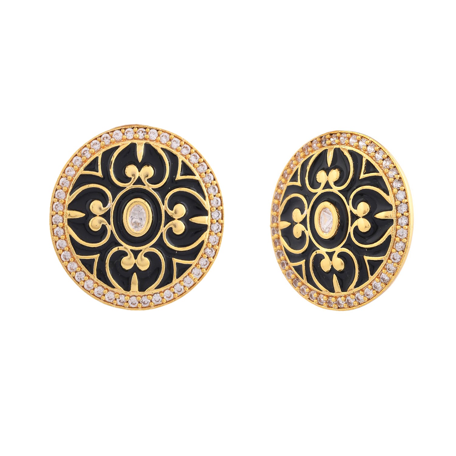 Inspired by the beauty and grace of the Taj Mahal, and fashioned into an edgy design, these round earrings have been crafted from brass of the highest quality. Embellished with zirconia gemstones in a cluster setting and white pearls, the...