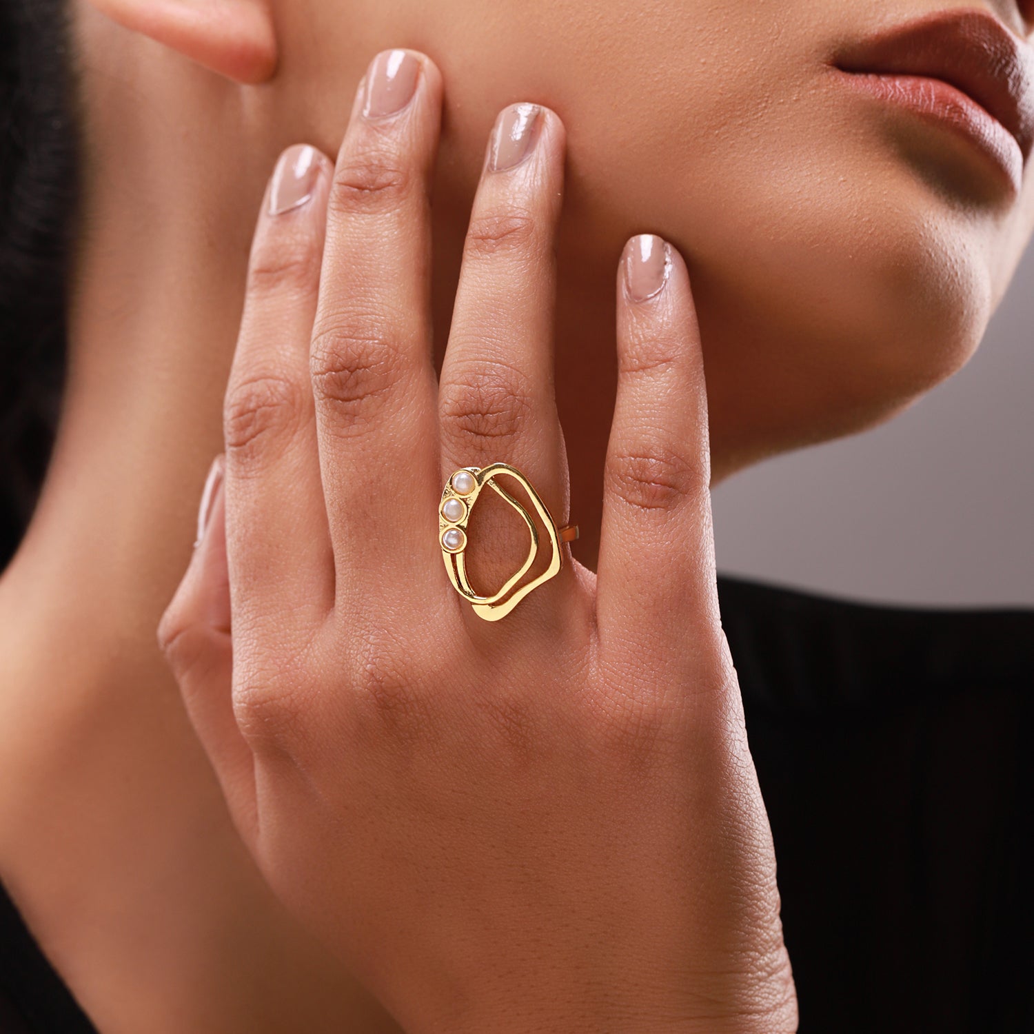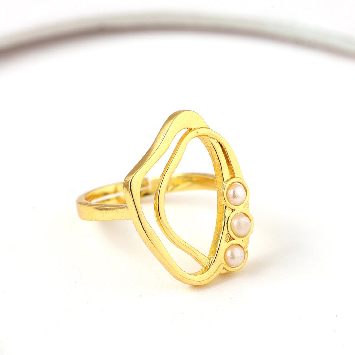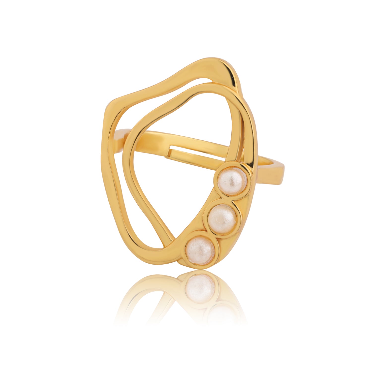Inspired by the effortless rhythm of ocean currents, the Voylla Flow Tide Coral Pearl Statement Ring is a sculptural expression of fluid elegance. Designed under the Flow Tide collection, this ring celebrates organic silhouettes and natural movement, reflecting the beauty of flowing water meeting golden shores. Its asymmetrical open structure creates a bold yet graceful visual impact, making it a perfect modern statement piece for women who embrace individuality and confidence. Crafted in high-quality brass and finished with rich yellow gold plating, the ring radiates warmth and sophistication. The soft golden sheen enhances the flowing contours of the design, while three delicate pearl accents add a refined, feminine touch. The pearls are thoughtfully placed along the curved frame, resembling ocean droplets resting on a golden coral formation, bringing balance, texture, and dimension to the overall structure. The open-frame design keeps the ring lightweight and comfortable for extended wear while maintaining a strong statement presence. The smooth inner finish ensures ease of wear, making it suitable for daily styling as well as special occasions. Its artistic structure blends contemporary western aesthetics with subtle elegance, making it versatile enough to complement dresses, office wear, festive outfits, or evening ensembles. Whether worn solo as a statement accessory or paired with minimal gold jewellery for a layered look, this stylish women’s ring transitions effortlessly from day to night. It is an ideal choice for Valentine’s Day rings, anniversary celebrations, propose day gifts, or thoughtful surprises for your lover, girlfriend, wife, or partner. The flowing design symbolizes connection and continuity making it a meaningful and stylish gift for her.