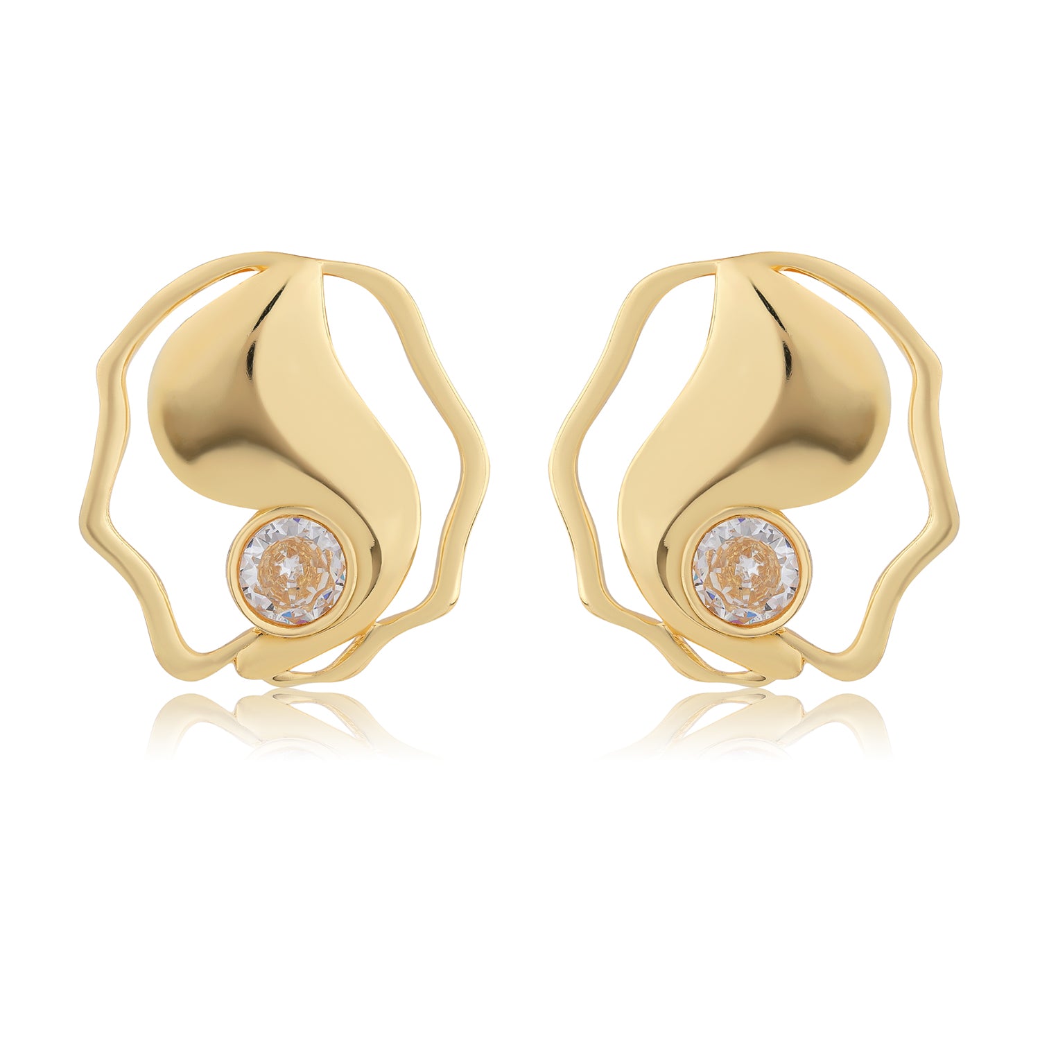 Inspired by the serene beauty of coastal waters and gentle ocean movement, the Flow Tide Marina Stud Earrings bring together fluid form and refined sparkle. Part of Voylla’s Flow Tide collection, these earrings draw from the natural rhythm of tides meeting the shore, translating soft curves and organic shapes into a modern, sculptural stud design. Crafted from high-quality brass and finished with a radiant yellow gold plating, these stud earrings feature a flowing, wave-like silhouette framed by an irregular organic outline. A centrally set cubic zirconia stone adds a subtle shimmer, evoking light dancing on water, while enhancing the overall elegance of the design. The polished gold surface reflects light beautifully, offering a luxurious yet wearable finish. Designed for comfort and everyday versatility, the secure stud fastening ensures ease of wear throughout the day. The balanced proportions make these earrings suitable for long hours, whether styled with western outfits, workwear, casual looks, or evening ensembles. They can be worn solo for a refined statement or paired with other Flow Tide jewellery for a cohesive, contemporary aesthetic. Elegant and meaningful, the Flow Tide Marina Stud Earrings make a thoughtful Valentine’s Day gift, anniversary gift, or romantic gesture for your girlfriend, wife, or someone special. Inspired by the calm and continuity of ocean tides, they symbolise flow, connection, and timeless beauty, perfect for women who appreciate jewellery that feels modern, artistic, and effortlessly graceful.