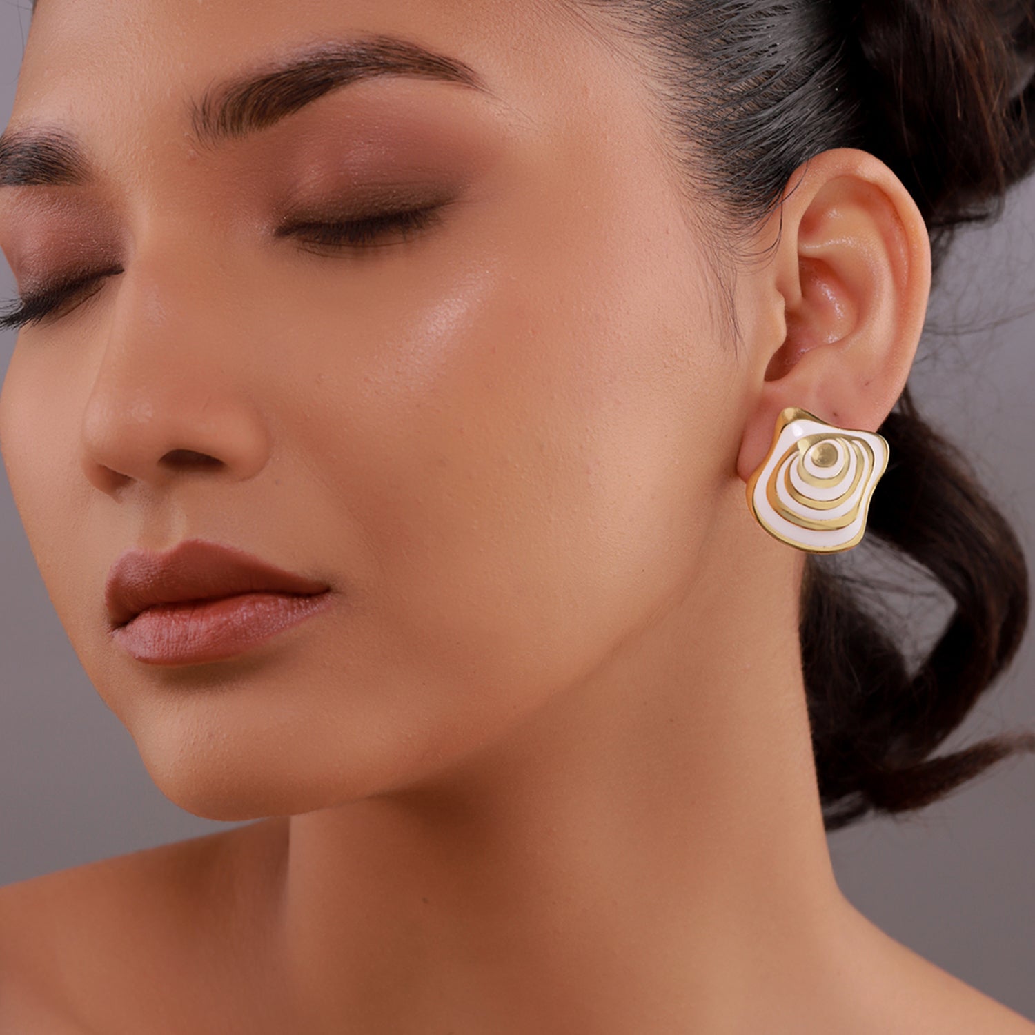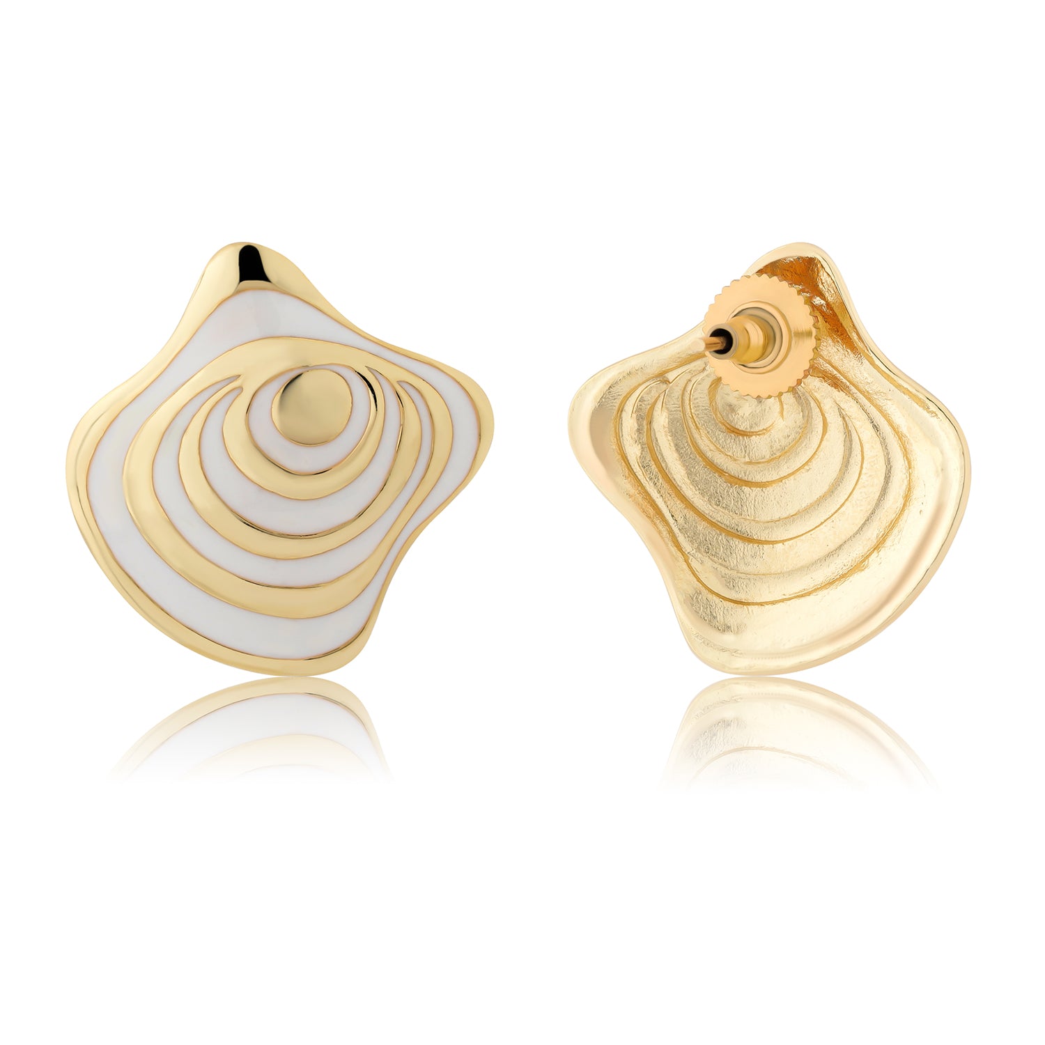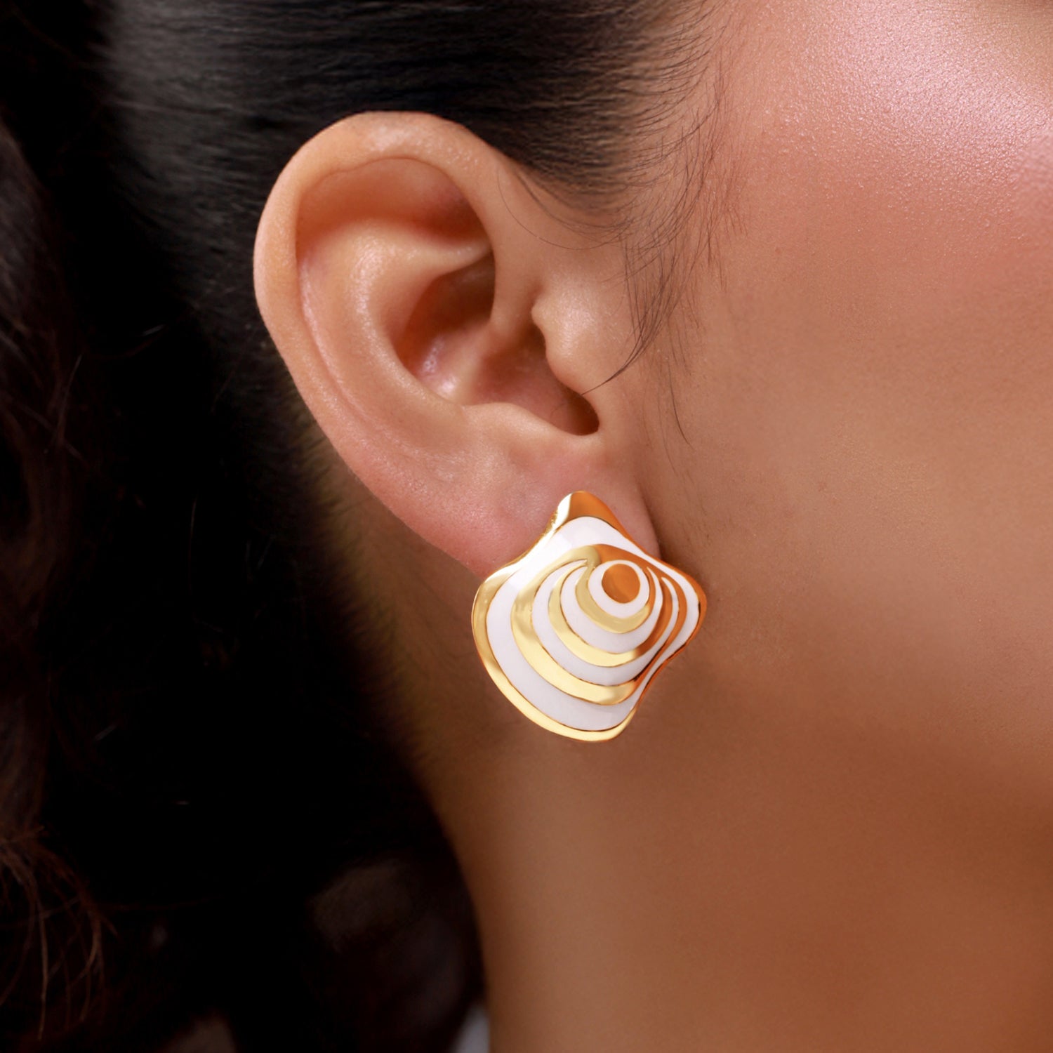 Inspired by the tranquil beauty of ocean layers and the gentle rhythm of waves, the Flow Tide Oceanic Grace Stud Earrings are a refined expression of fluid form and modern elegance. Part of Voylla’s Flow Tide collection, these earrings capture the essence of water in motion soft, layered, and endlessly graceful translated into a contemporary stud design. Crafted from high-quality brass and finished with a radiant yellow gold plating, these stud earrings feature an organic, wave-inspired silhouette highlighted with smooth white enamel detailing. The layered enamel pattern evokes ripples on the ocean’s surface, while the polished gold contours add depth, warmth, and a refined finish. The contrast between the luminous white enamel and gold edges creates a look that is fresh, elegant, and effortlessly stylish. Designed for everyday comfort, the secure stud fastening ensures a snug fit, making these earrings suitable for long hours of wear. Their balanced proportions make them versatile enough to pair with western outfits, workwear, casual ensembles, and evening looks. Wear them as a subtle statement on their own or style them with other Flow Tide pieces for a cohesive, contemporary jewellery story. Elegant yet expressive, the Flow Tide Oceanic Grace Stud Earrings make a thoughtful Valentine’s Day gift, anniversary gift, or romantic gesture for your girlfriend, wife, or someone special. Rooted in nature-inspired design and modern craftsmanship, they symbolise calm, flow, and timeless beauty, perfect for women who appreciate jewellery that feels artistic, wearable, and refined.
