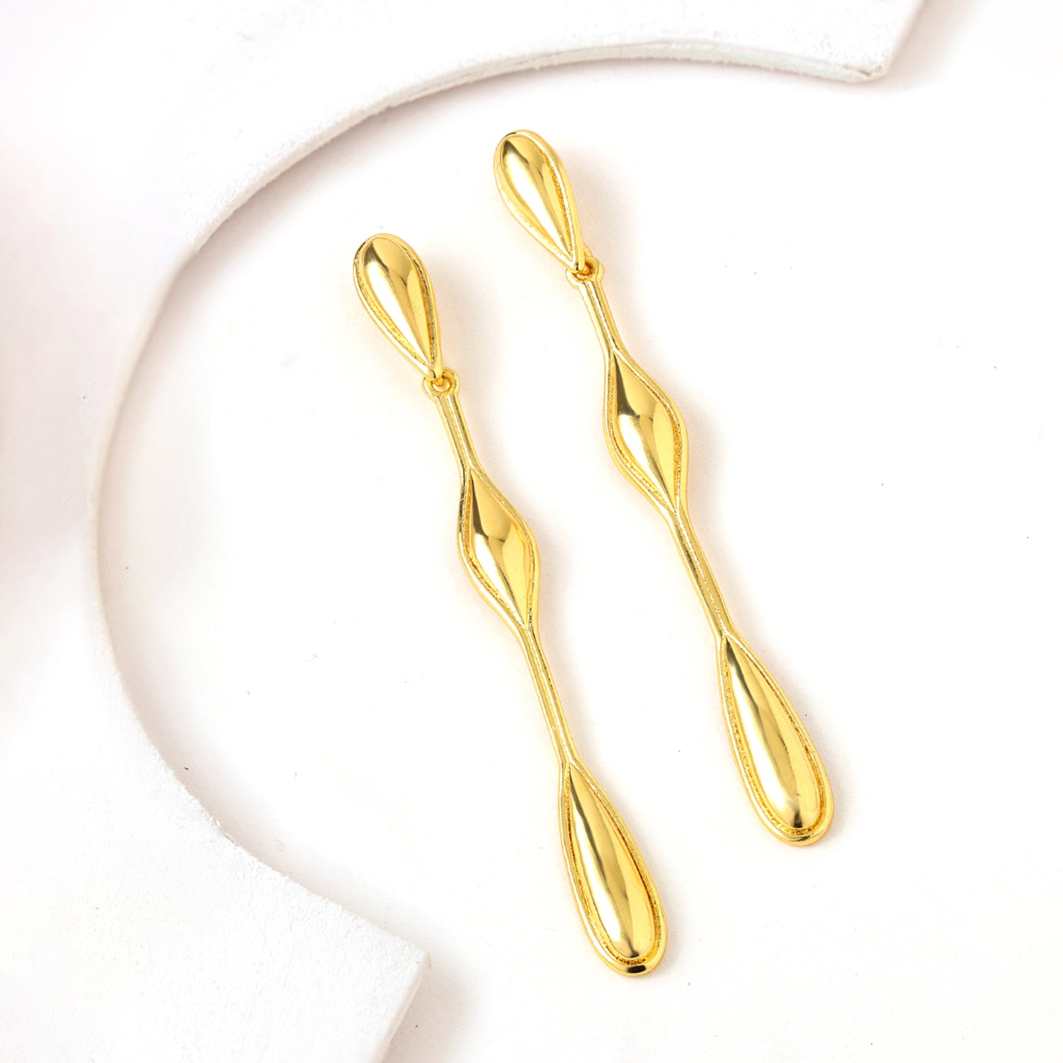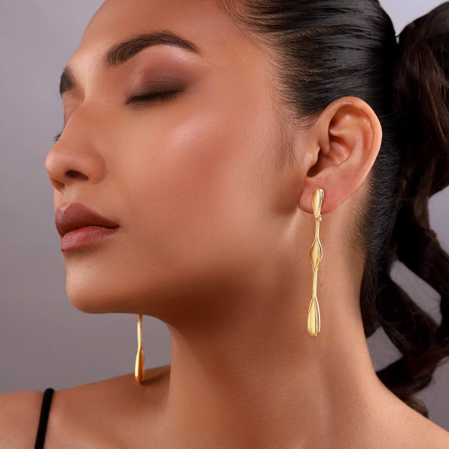 Inspired by the gentle ripples formed when water meets the shore, the Flow Tide Ripple Drop Danglers Earrings are a modern expression of fluid beauty and effortless elegance. Part of Voylla’s Flow Tide collection, this design draws from the natural rhythm of ocean tides, translating soft movement and organic flow into a sleek, elongated silhouette that feels calm, graceful, and contemporary. These long gold dangler earrings feature ripple-inspired drop elements that move beautifully with every step. The sculptural form creates a sense of vertical elegance, subtly elongating the neckline while maintaining a light and balanced look. Designed to feel expressive yet wearable, the earrings strike the perfect balance between statement and simplicity, making them ideal for both everyday styling and special moments. Crafted for comfort and long wear, these earrings are lightweight and easy to style through the day. Pair them with western outfits, workwear, dresses, or minimal evening looks to add a refined touch without overpowering your outfit. Whether worn solo as a standout accessory or styled alongside other Flow Tide pieces, they bring a sense of flow and harmony to your overall look. Thoughtfully designed for modern women, the Flow Tide Ripple Drop Danglers Earrings are also a beautiful gifting choice. Their fluid design symbolises continuity, movement, and connection, making them a meaningful Valentine’s Day gift, anniversary gift, or a thoughtful present for your wife, girlfriend, or someone special. Elegant, versatile, and timeless, these earrings are perfect for women who appreciate jewellery that feels inspired by nature and designed for real life.