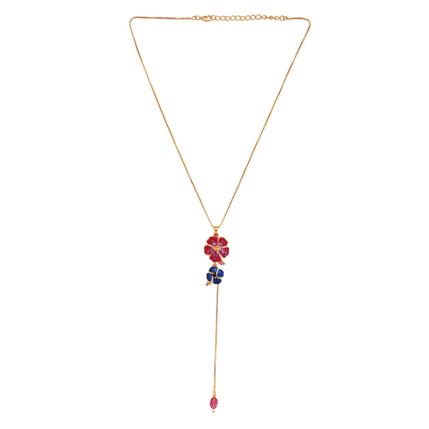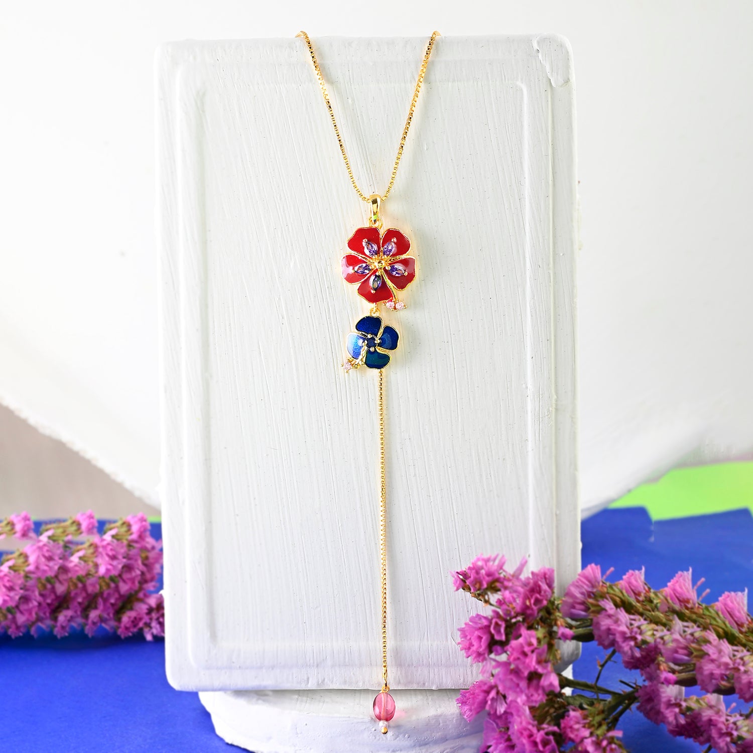 Embrace elegance with our Azure Petals Long Pendant. Crafted from brass with a radiant gold plating, this pendant features intricate floral designs in captivating blue and magenta hues. Elevate your style with a touch of natural beauty and sophistication!