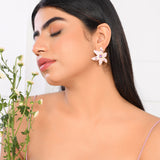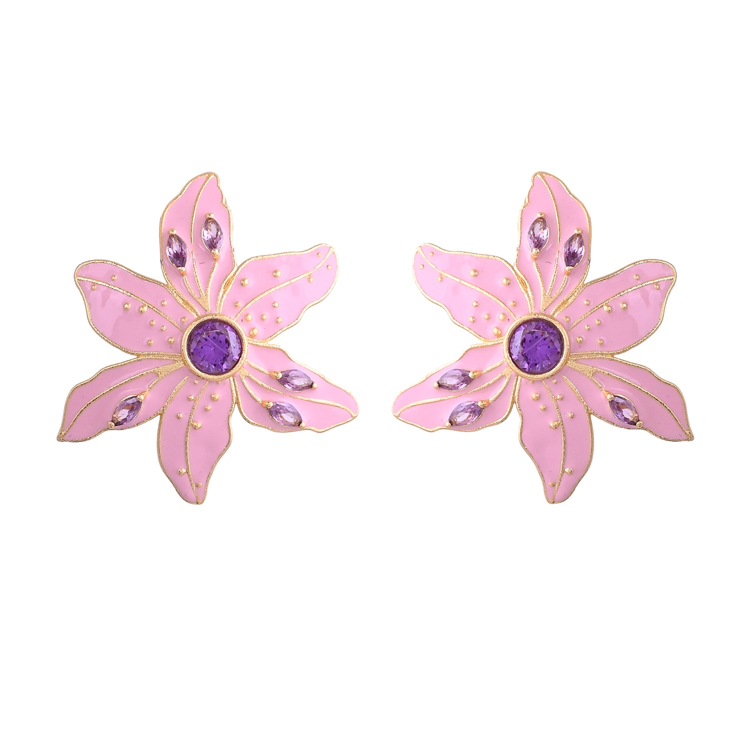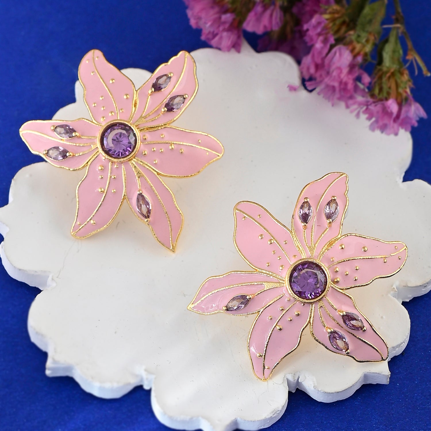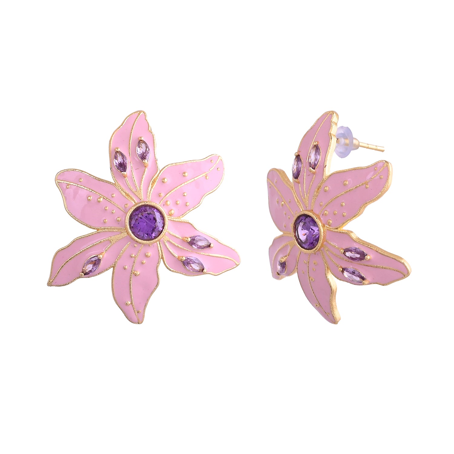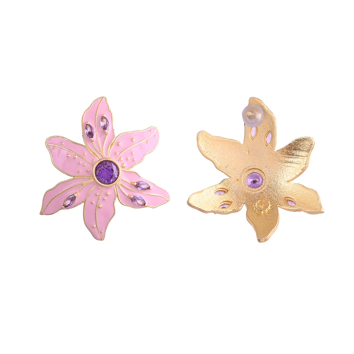 Indulge in elegance with our Pink Petals earrings. Crafted from brass with a radiant gold plating, these big studs feature charming pink floral designs adorned with sparkling purple CZ accents. Elevate your style with a touch of floral sophistication and allure