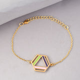Inspired by the Benzene ring structure, this fun and quirky casual bracelet has been fashioned out of brass. Gold plating and enamel add to the charm of this versatile and lightweight piece.