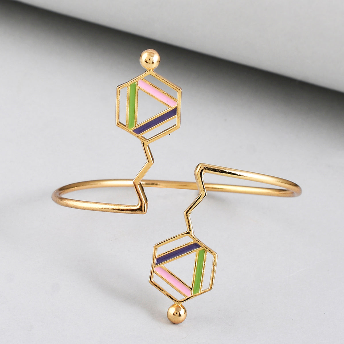 Hexagons cuff bracelet, inspired by the hexagonal molecular structure of Benzene. Made from brass and gold plated, the enamelled bracelet is lightweight and comfortable. Versatile enough to be paired with a wide range of looks and outfits.