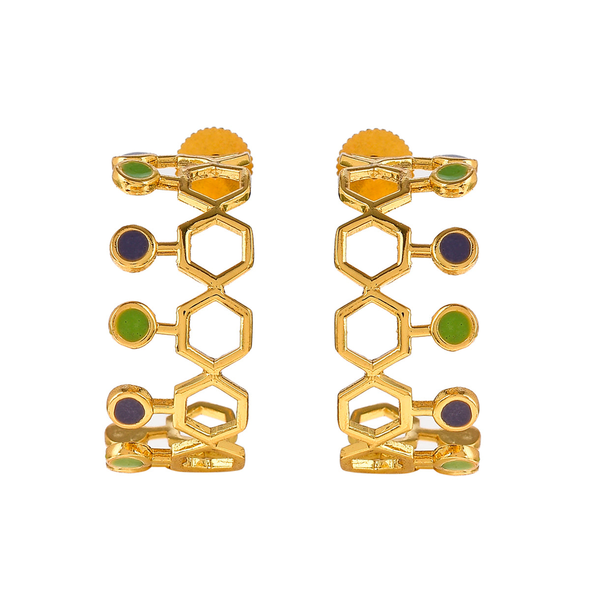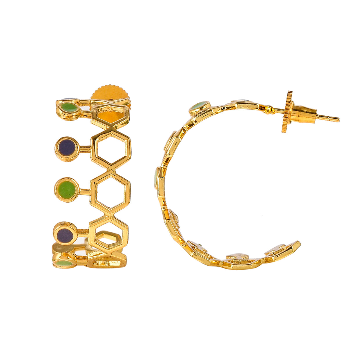 Geometric, half hoop earrings, inspired by the Benzene compound's hexagonal molecular structure. The enamelled pair has been fashioned out of brass. The gold plated earrings will look lovely with a classic summer dress.Caring for your fashion jewelry: We, at Voylla,...