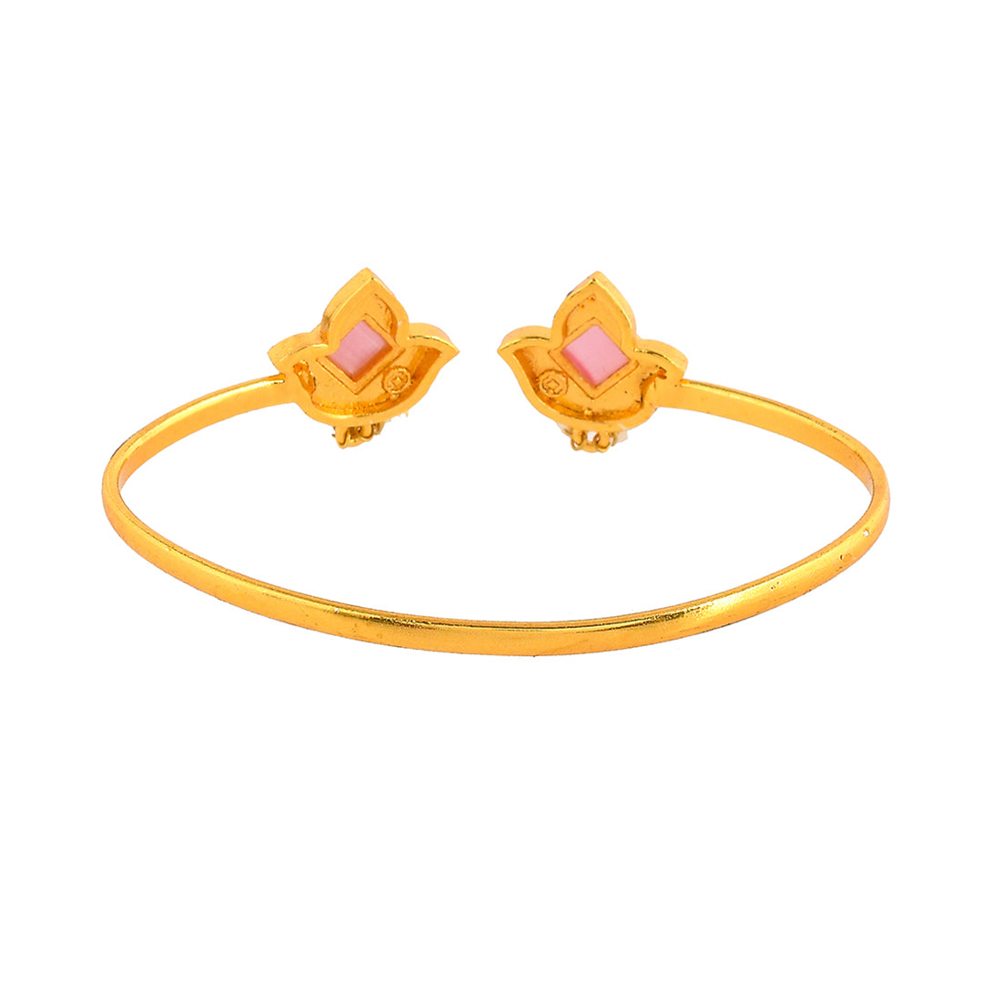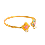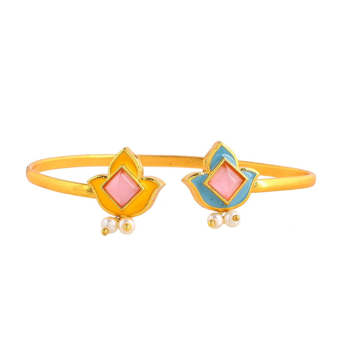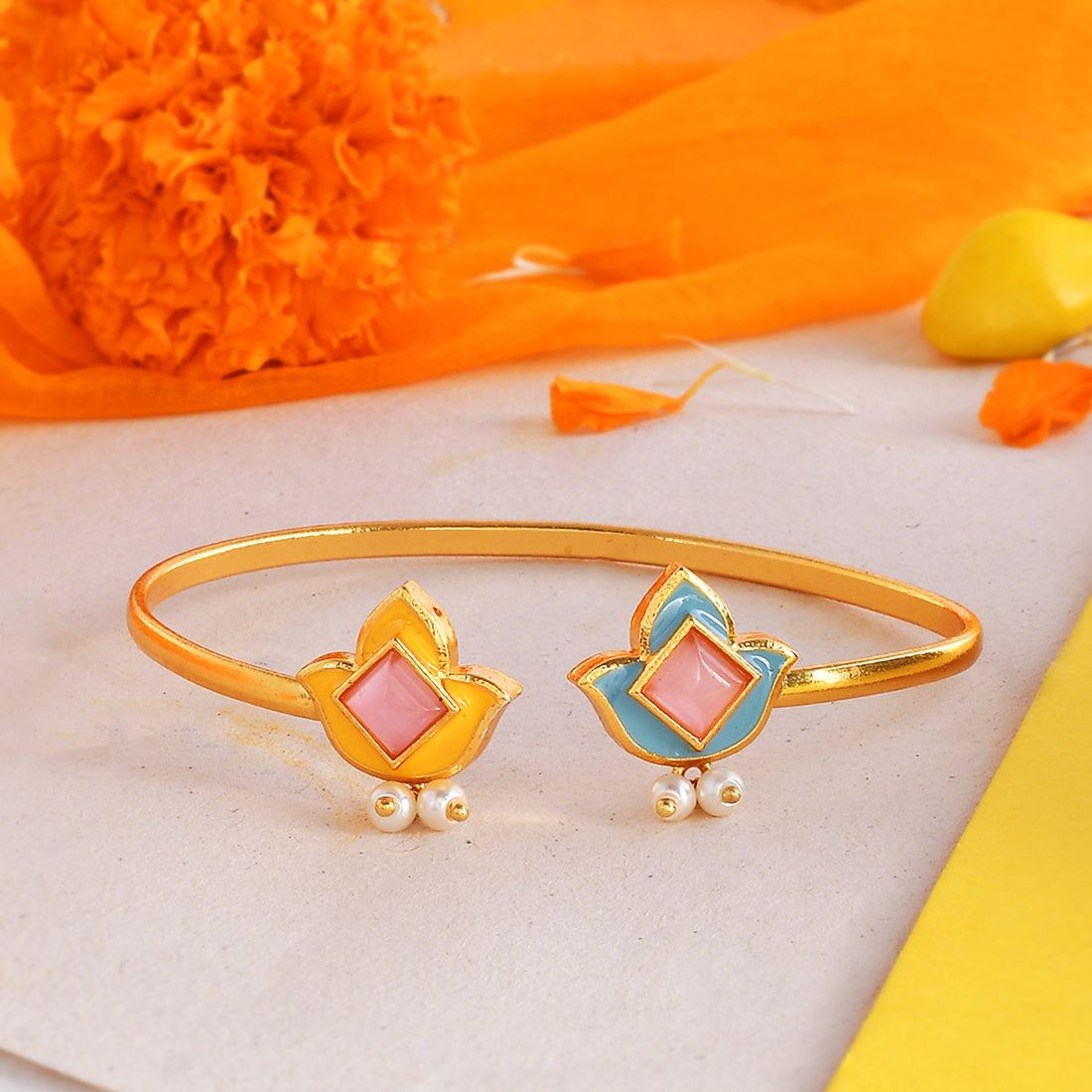 Enamelled tulips motifs cuff style bracelet. Made from brass and yellow gold plated, the bracelet has been embellished with white pearls. Pair with ethnic attire.