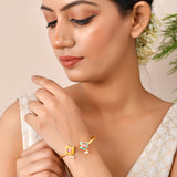 Brass cuff bracelet with yellow gold plating, embellished with pearls and green stones. The floral bracelet can be paired with ethnic and Indo-Western outfits.Caring for your fashion jewelry: We, at Voylla, take care of every piece of jewelry so that...