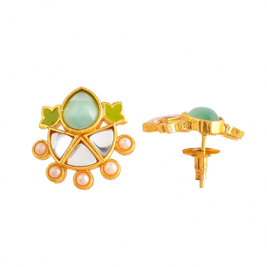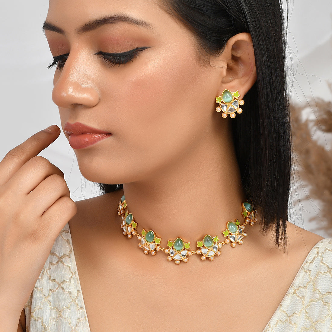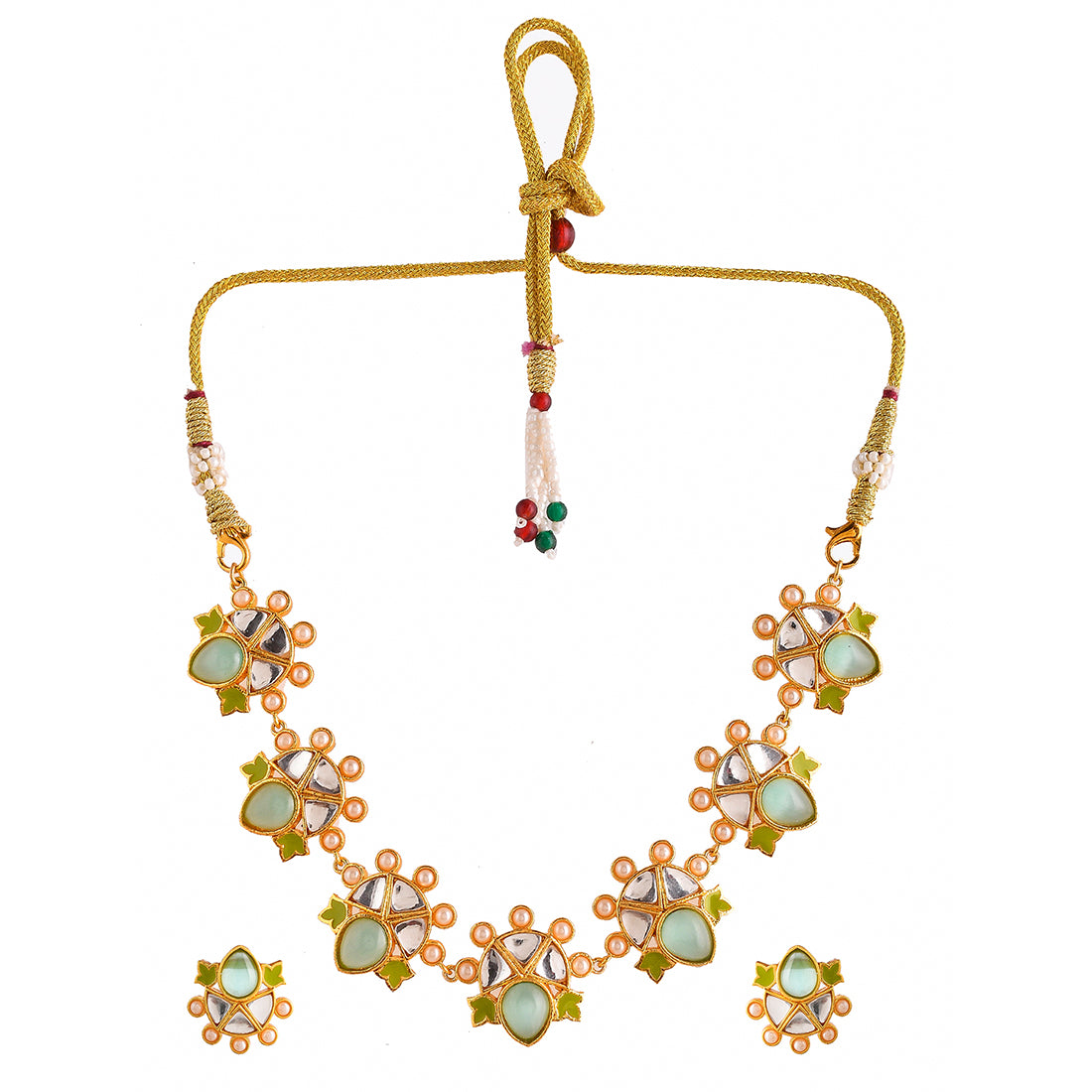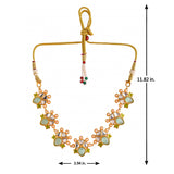 Brass jewellery set with yellow gold plating, embellished with pearls and green stones. The floral set can be paired with ethnic and Indo-Western outfits.