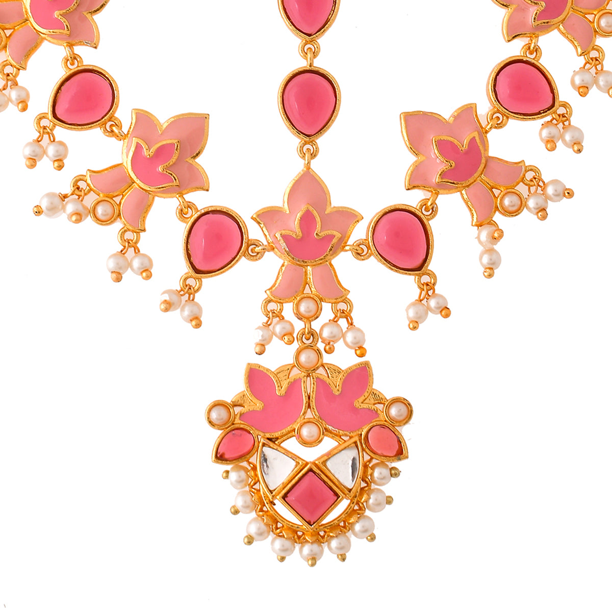 An exquisite, opulent jewellery set, made from brass and yellow gold plated. Embellished with pink stones and white pearls, the enamelled set will pair perfectly with formal Indian and Indo-Western looks.Caring for your fashion jewelry: We, at Voylla, take care...
