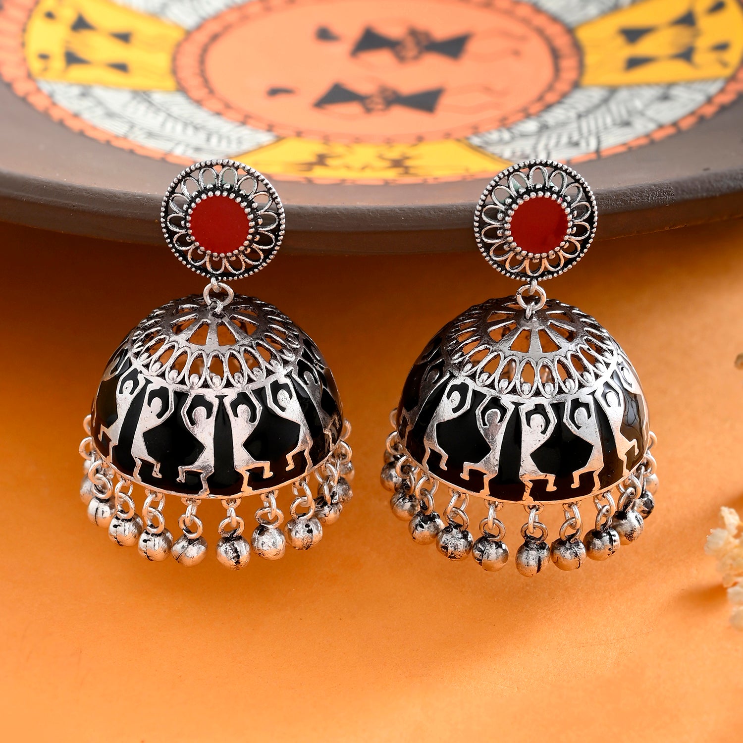 Seeped in art and tradition, these jhumka earrings, inspired by India's ancient Warli artform, have been crafted from brass. Enamelled and featuring metal ghungroo embellishments, the pair has been given a lovely silver plating. Pair with Indian attire.