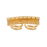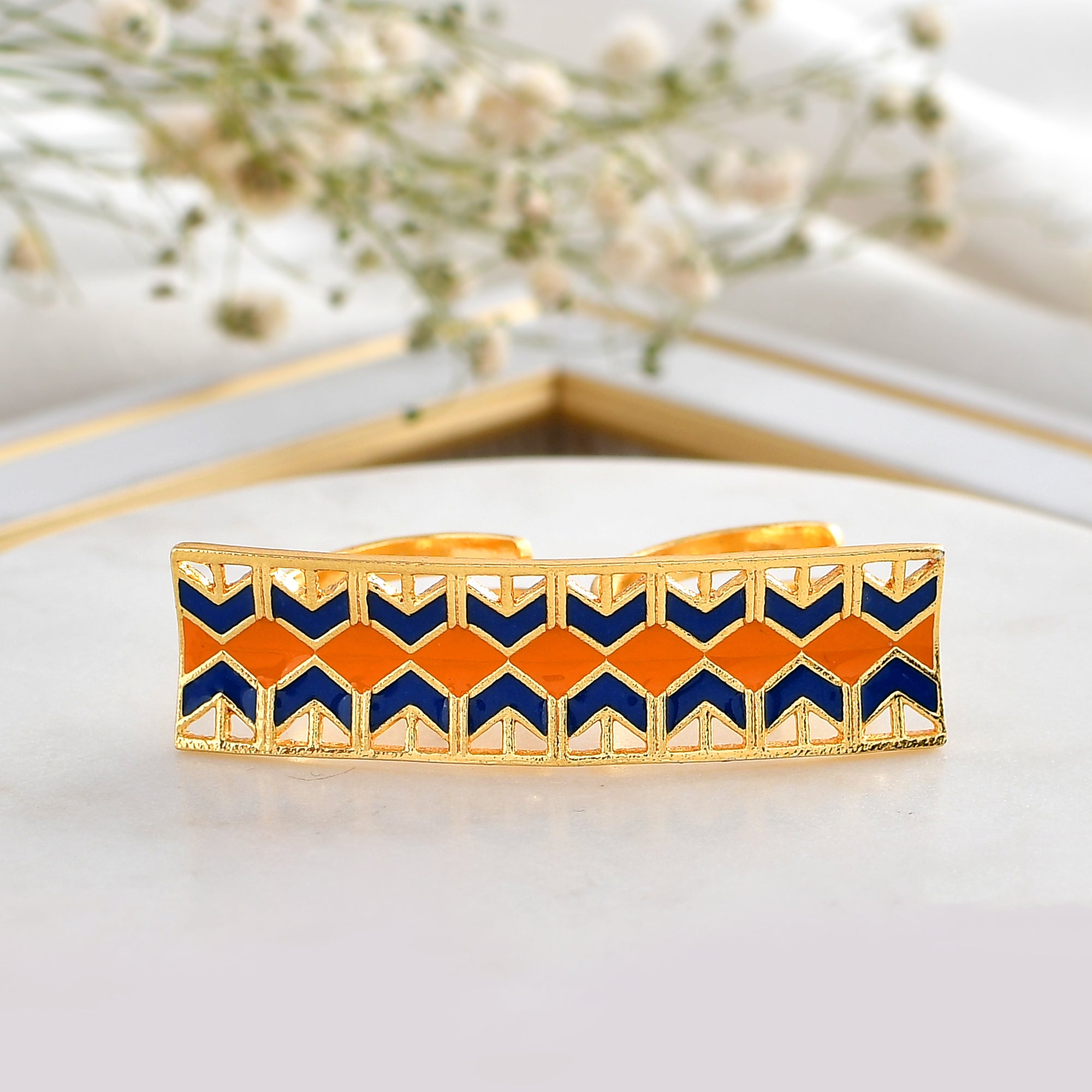 A fun, colorful and quirky three-finger ring, inspired by the African basket art of Zulu. Enameled and adjustable for maximum comfort, the ring has been fashioned out of brass and features a lovely yellow gold plating.