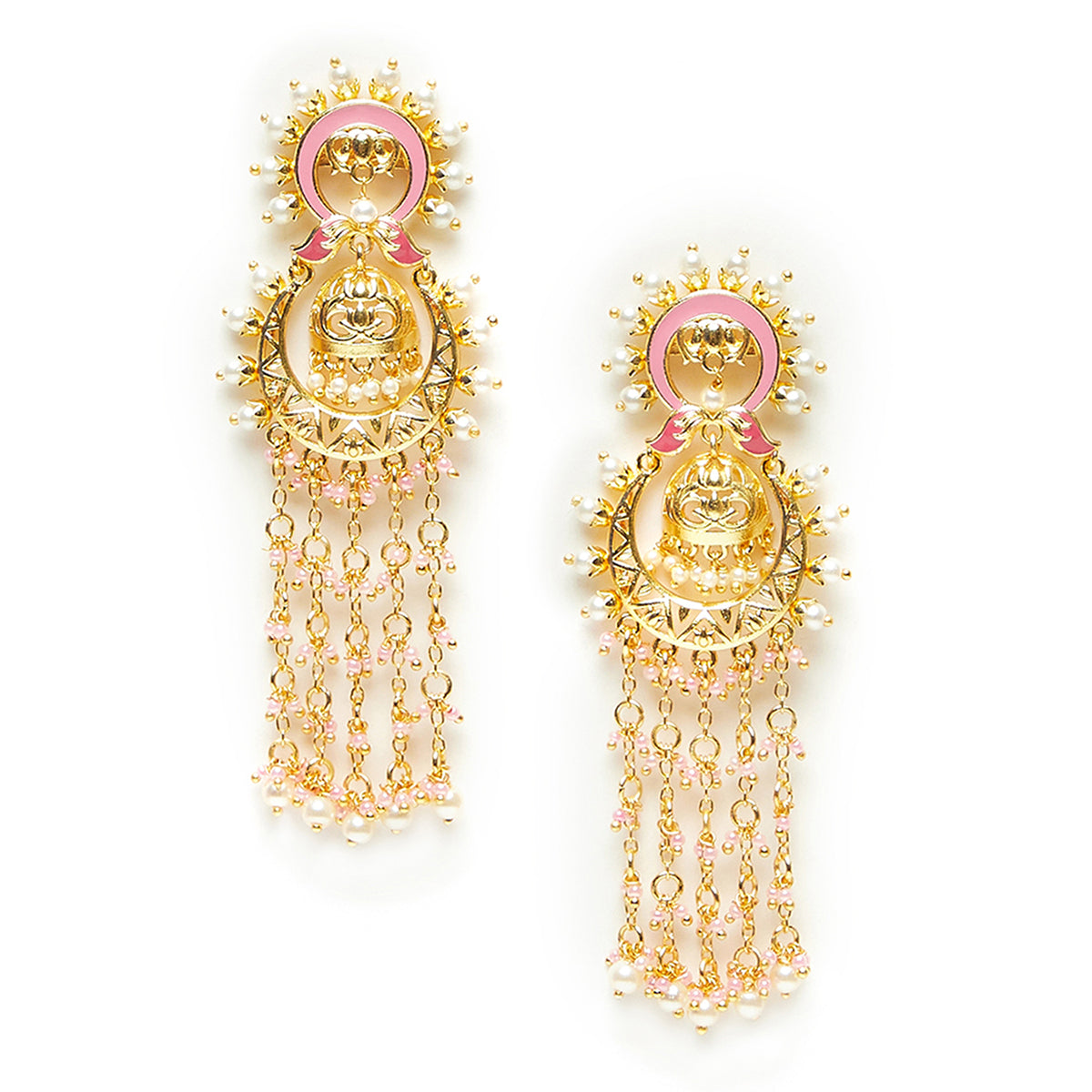 Traditional drop earrings, made from brass and featuring a lovely yellow gold plating. Embellished with faux white pearls, the layered pattern earrings are lightweight and comfortable yet exude an opulent charm. Wear the earrings with your favourite silk saree or ethnic gown.