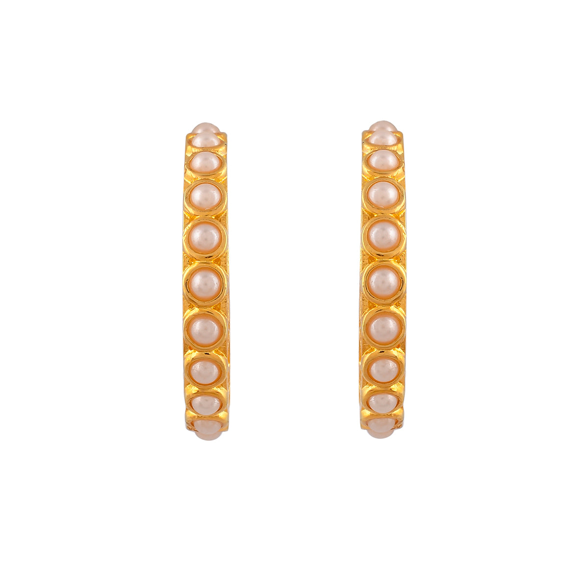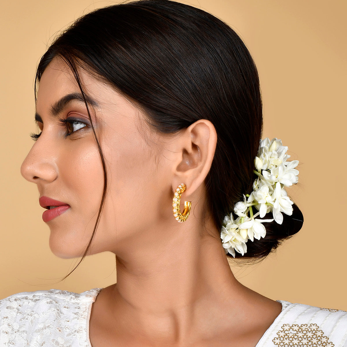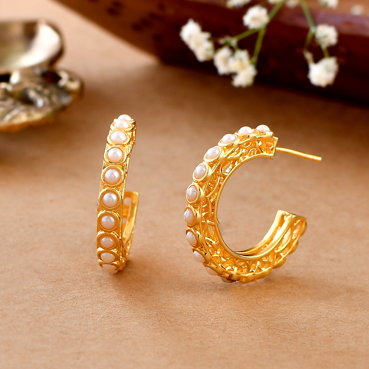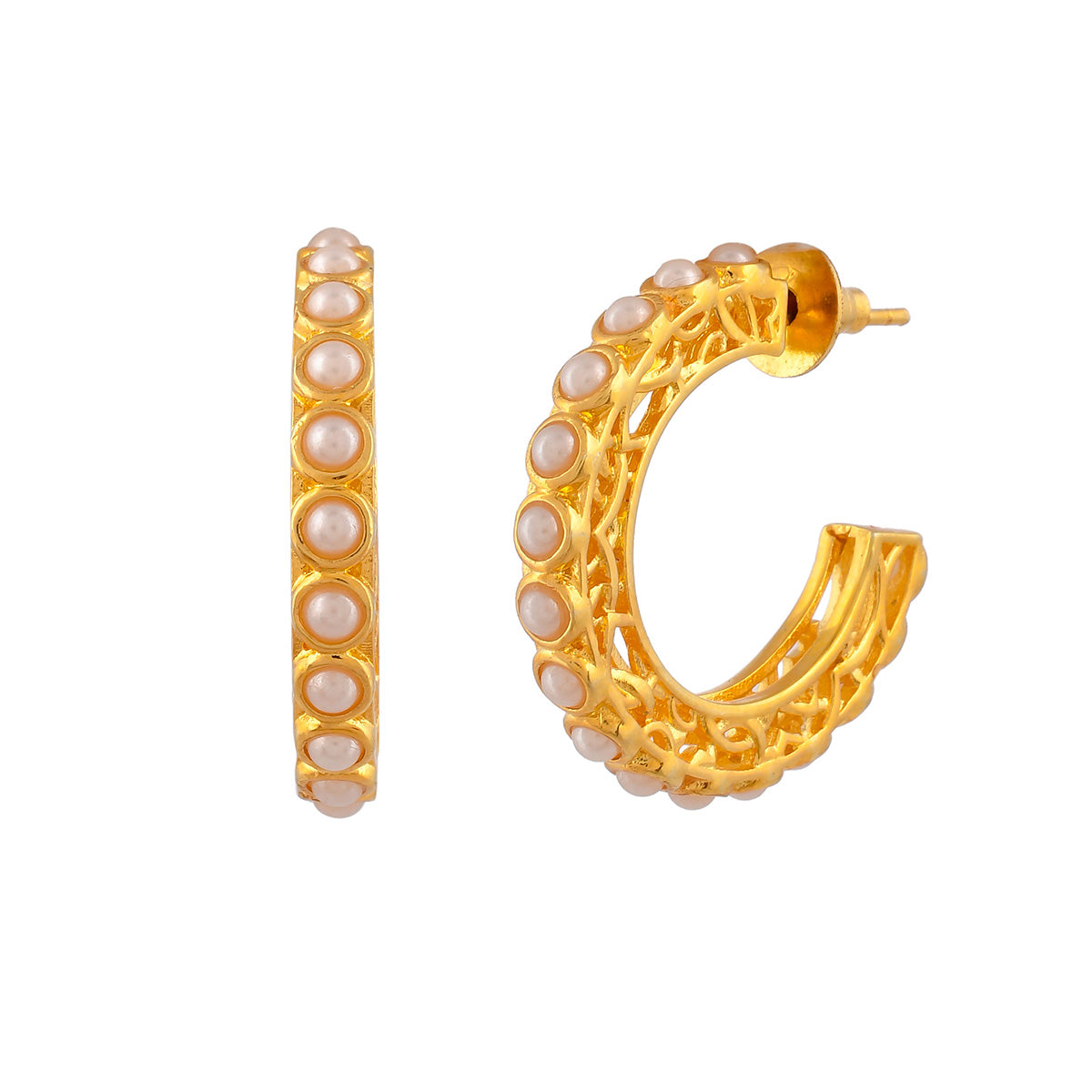 Inspired by traditional Arabesque designs, these gorgeous statements hoop earrings feature a delicate and intricate filigree design and white shell pearls. Made from brass, the gold plated hoops will add a sparkle to all your favorite traditional as well as Indo-Western looks.