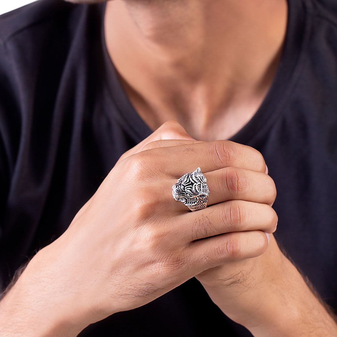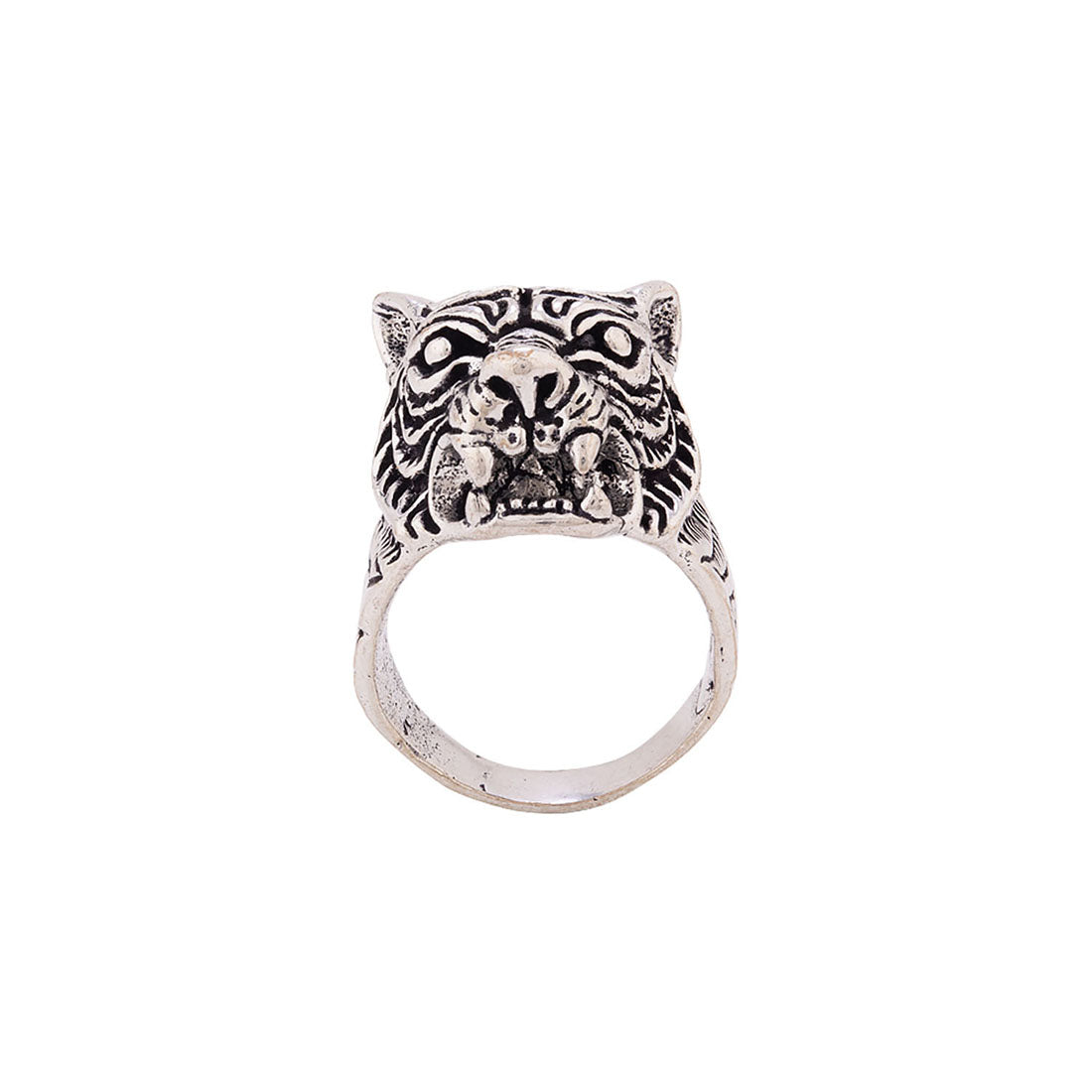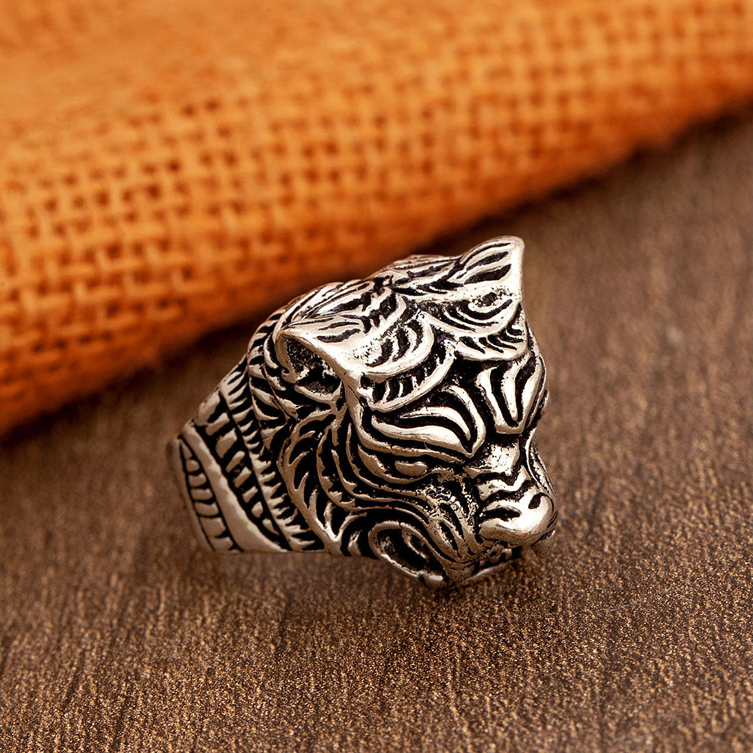 Tiger head ring for men, made from brass and oxidised silver plated. Wear with party attire. To make your accessories last longer avoid harsh chemicals and moisture. Keep dry, clean with dry cloth and wear with panache. "India?s largest fashion jewelry brand DARE, comes from the House of Voylla as a limited edition of handcrafted accessories for the modern Indian men. "