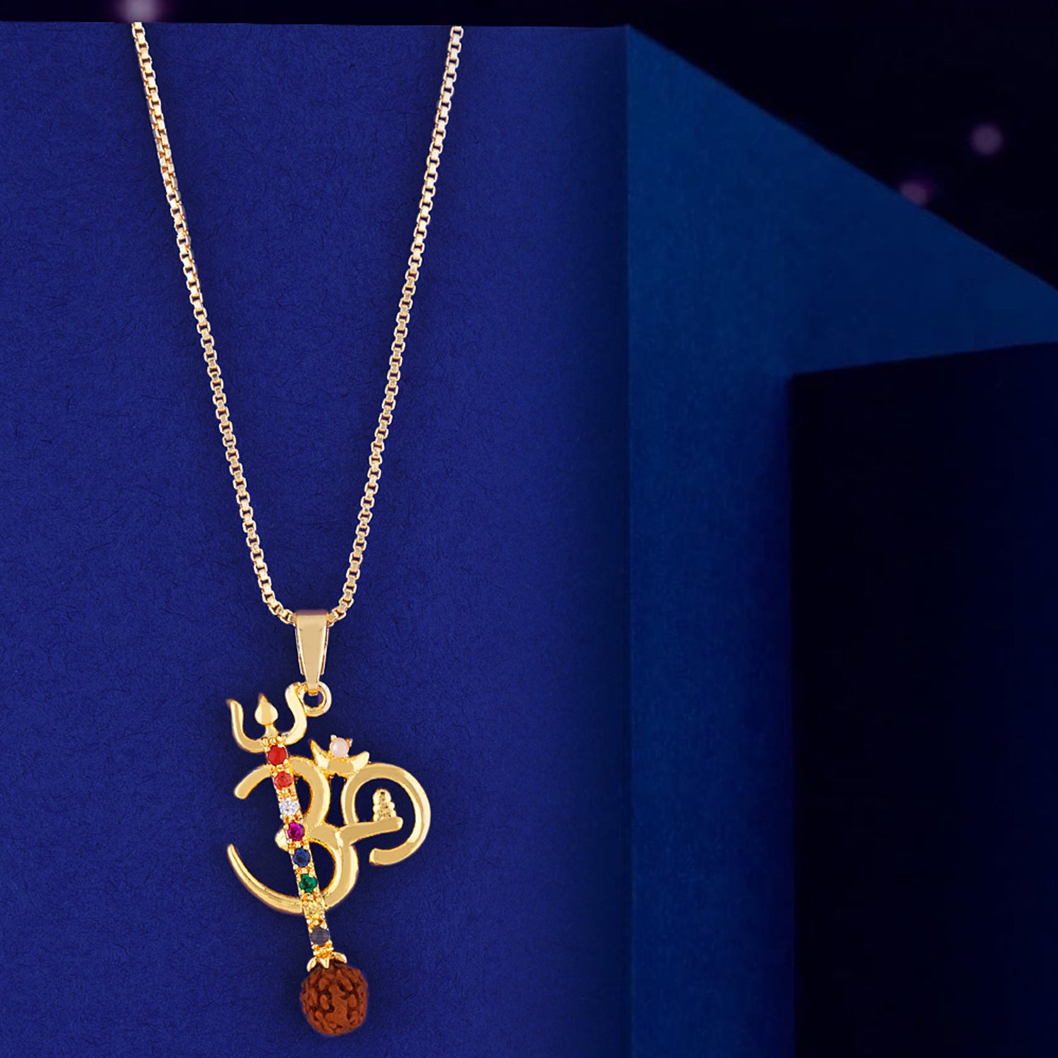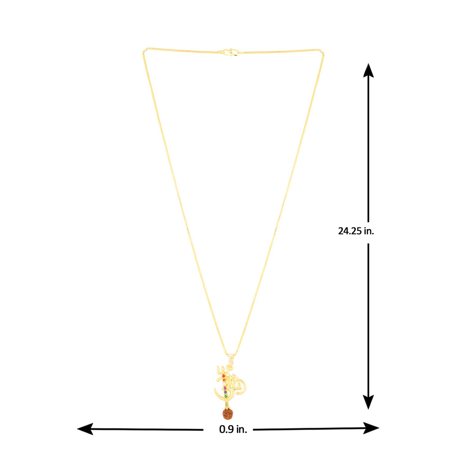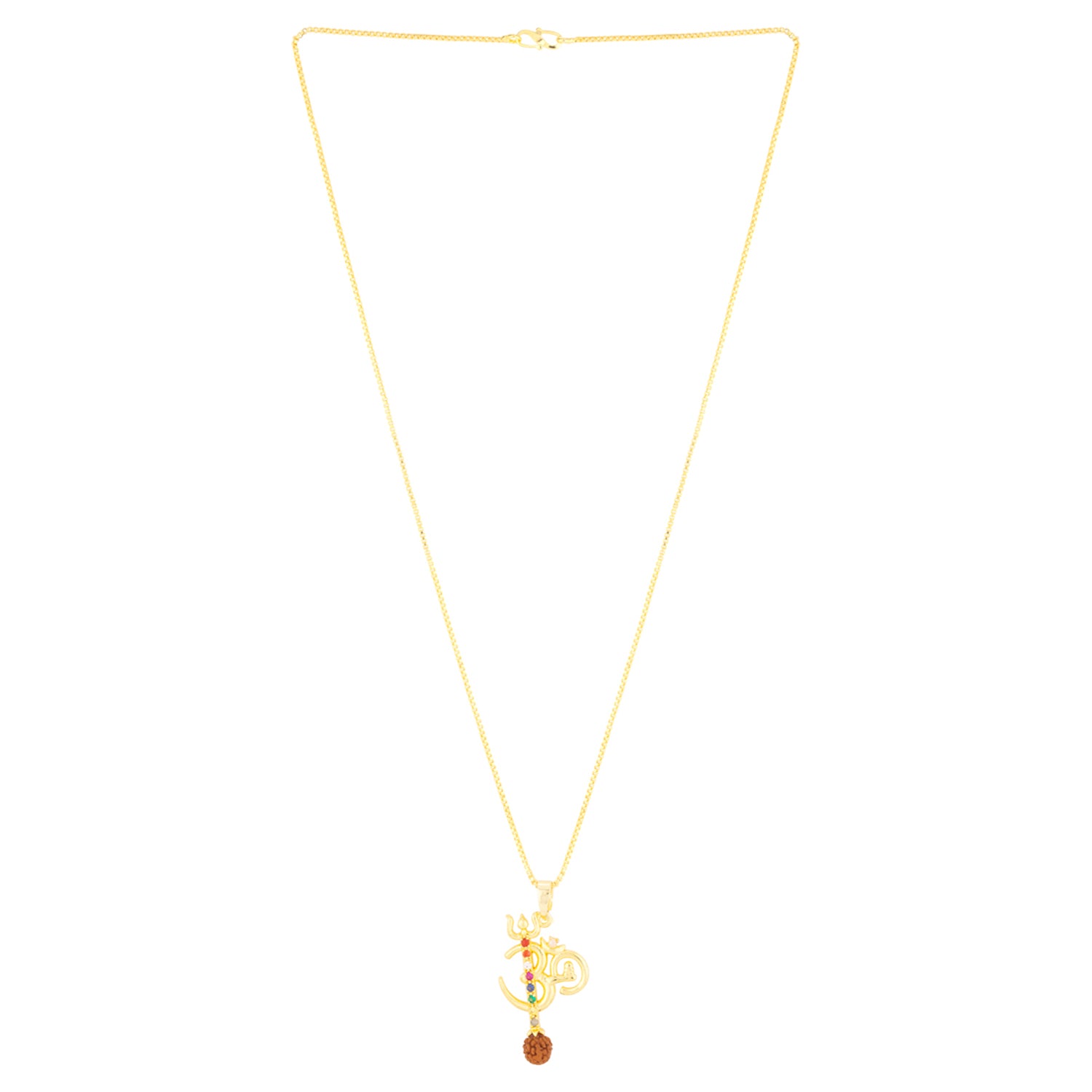 OM inscription pendant, featuring a Rudraksha bead. Made from brass and yellow gold plated. Pair with formal looks.