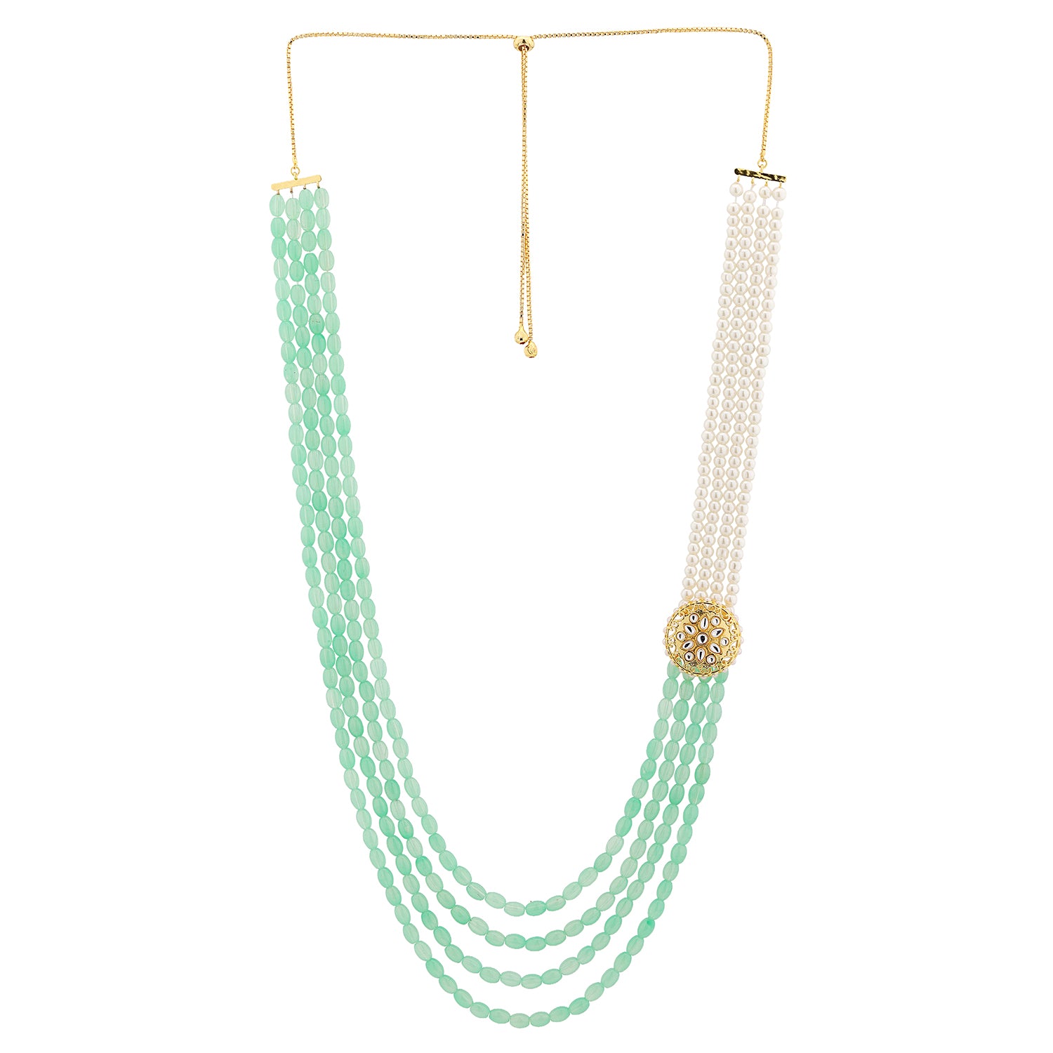 Inspired by the strength, dignity, and quiet authority of Rajasthan’s legendary warriors, the Kings of Rajasthan Yoddharaj Mala Necklace is a refined expression of royal masculinity. Part of the iconic Queens of Rajasthan collection, this mala reflects the ceremonial necklaces worn by Rajput kings during sacred rituals, royal gatherings, and wedding celebrations - symbols of honor, lineage, and timeless grace. Crafted in premium brass and finished with rich yellow gold plating, the Yoddharaj Mala features multiple strands of soothing green beads paired with luminous white pearl detailing and an ornate gold-toned centerpiece. The soft green hues evoke prosperity and balance, while the layered silhouette creates a commanding yet elegant presence. Designed to be lightweight and comfortable, this necklace for men sits effortlessly through long wedding rituals without compromising on impact. Perfect for modern grooms who appreciate heritage with subtle sophistication, this groom mala pairs beautifully with ivory, beige, pastel, emerald, and gold sherwanis. Whether worn on the wedding day or gifted as a meaningful keepsake, the Yoddharaj Mala stands as a symbol of strength, tradition, and royal legacy, making it an exceptional gift for groom and a timeless piece of mens jewellery.