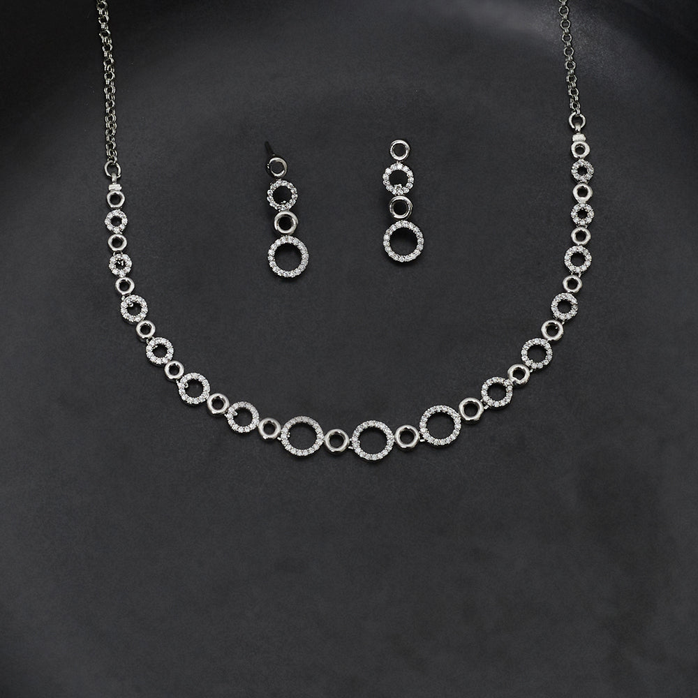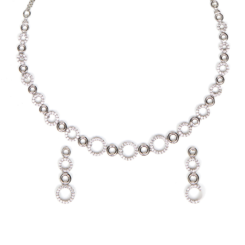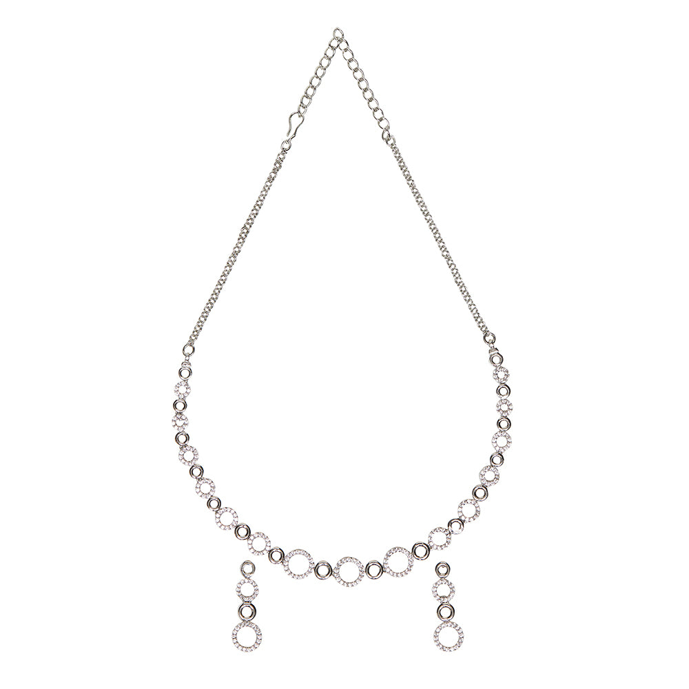 Brass necklace set with classic silver plating. Embellished with zircon gemstones. Good for formal looks.