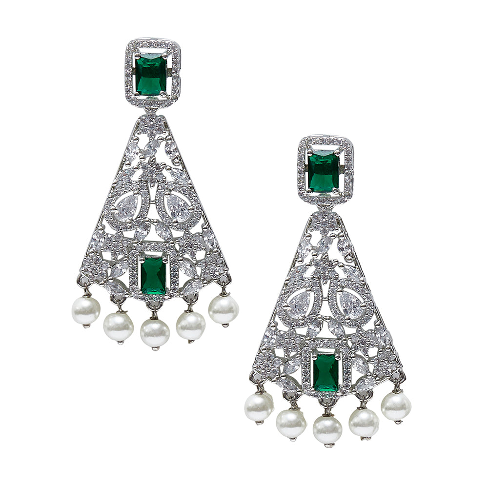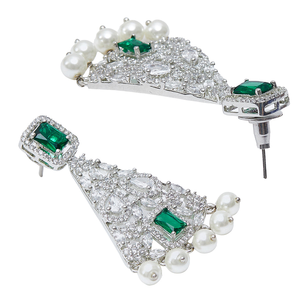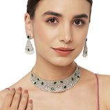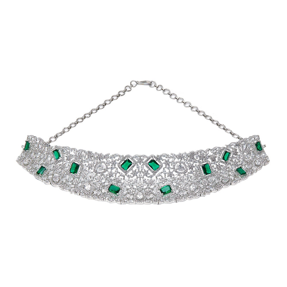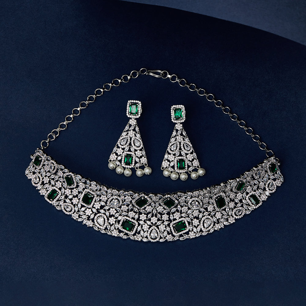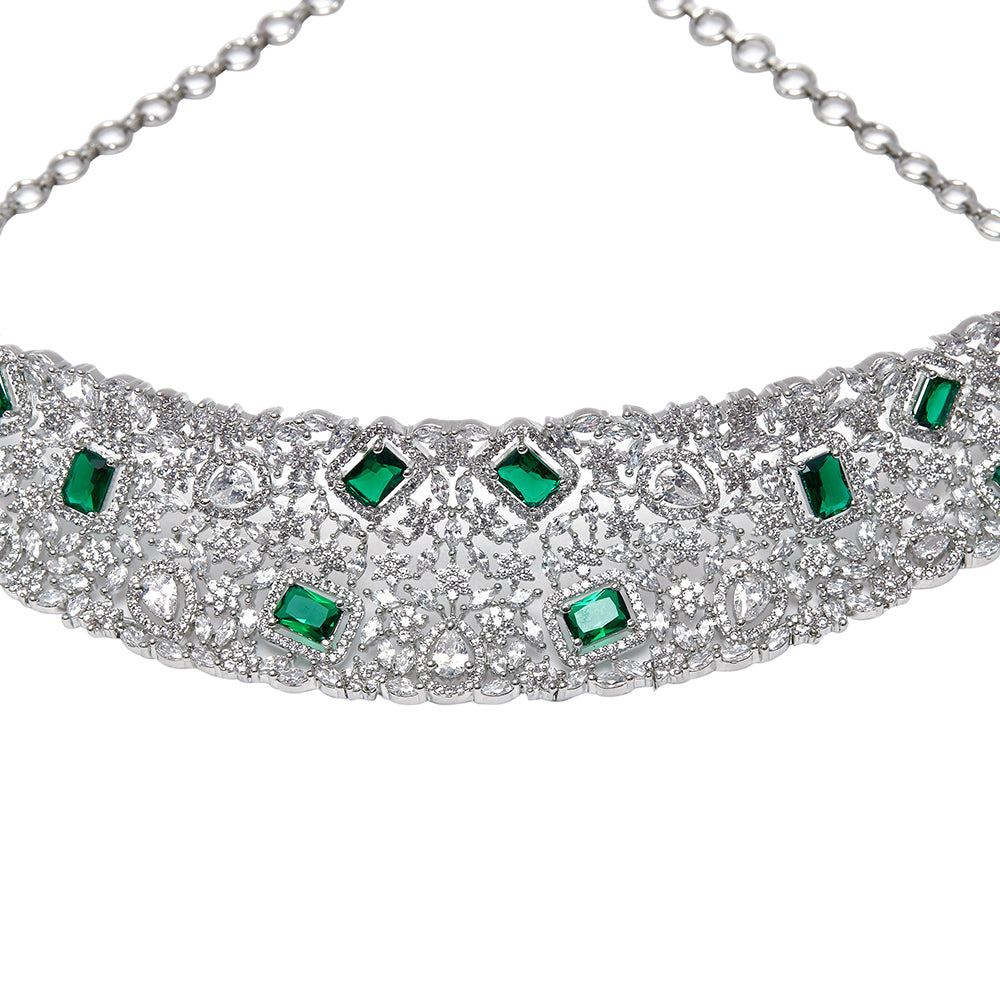 Green and white CZ gems embellished necklace set. Made from brass and silver plated. Good for formal looks.
