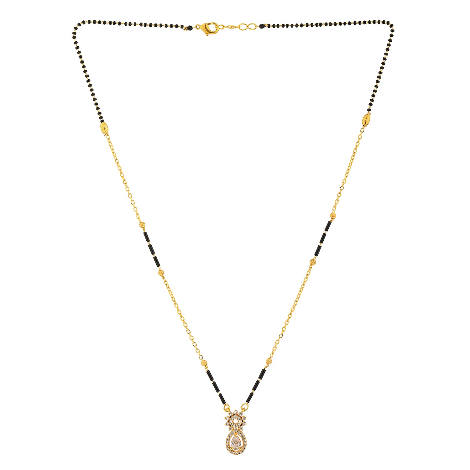 The Gold Essentials Zyra American Diamond Mangalsutra is a perfect fusion of traditional charm and modern elegance. Crafted with premium brass and finished with rich gold plating, it promises durability, shine, and comfort, ensuring it becomes a treasured part of your everyday style. At its center, the pendant features a floral-inspired motif paired with a pear-shaped drop, both encrusted with sparkling American Diamonds. This thoughtful combination symbolizes beauty, purity, and love, making Zyra a truly meaningful designer mangalsutra. The chain, detailed with classic black beads and golden links, stays rooted in cultural tradition while complementing the contemporary design of the pendant. Belonging to the Gold Essentials Collection, this mangalsutra is versatile enough for daily wear, office wear, or wedding wear. Whether styled with sarees and lehengas or paired with kurtis and formal wear, Zyra adapts beautifully to every occasion. It also makes a heartfelt choice as a gift for wife, wedding gift, Valentine’s Day gift, or anniversary gift.