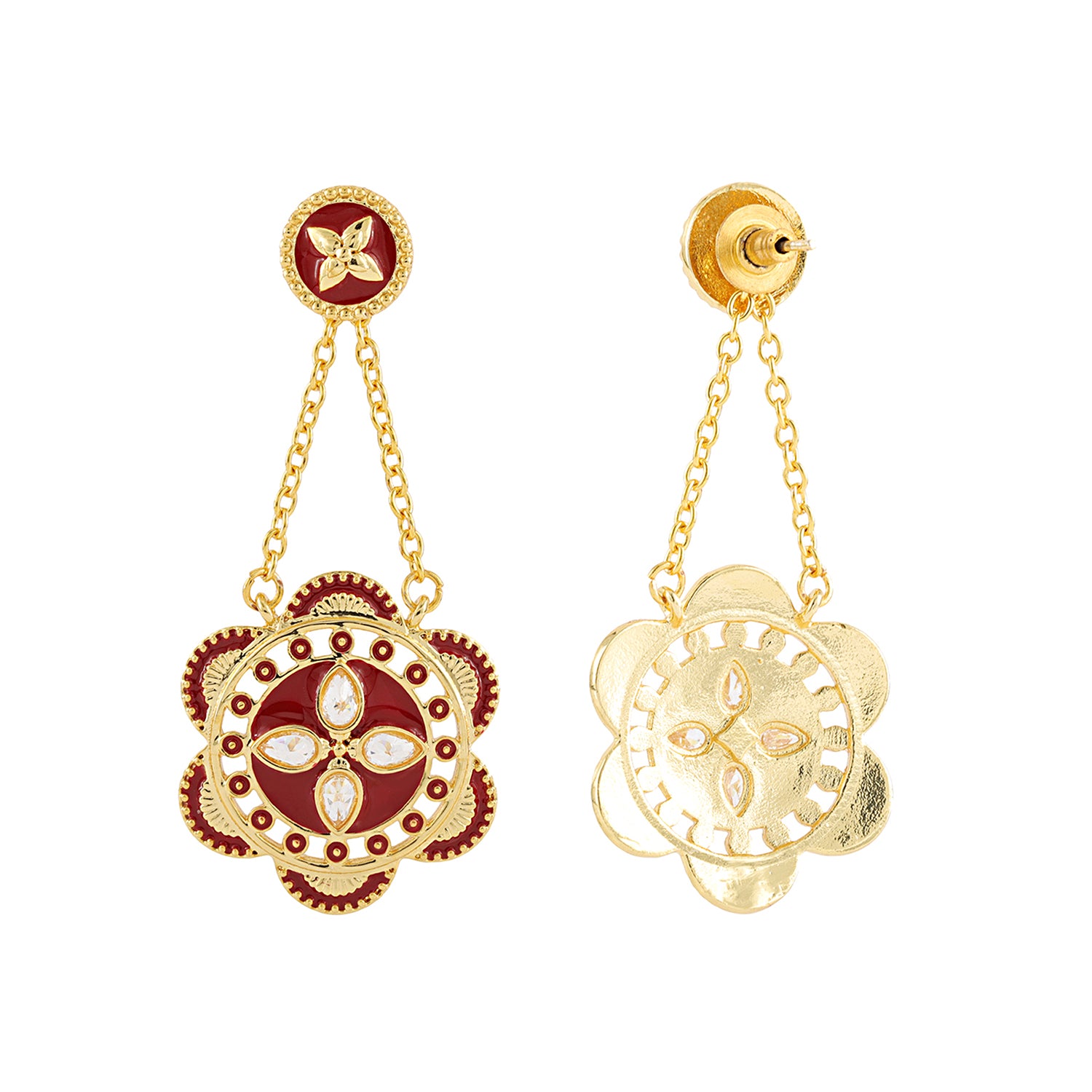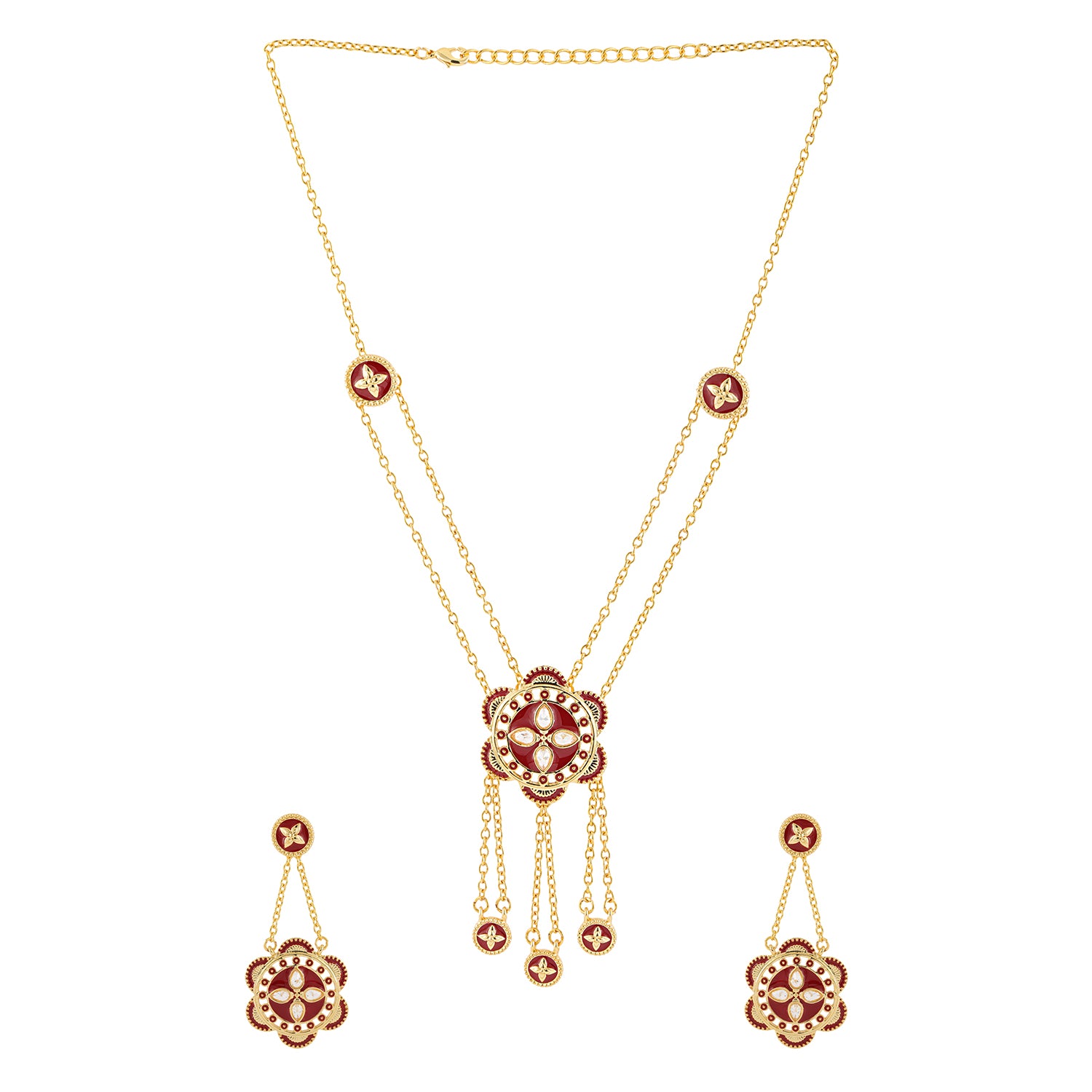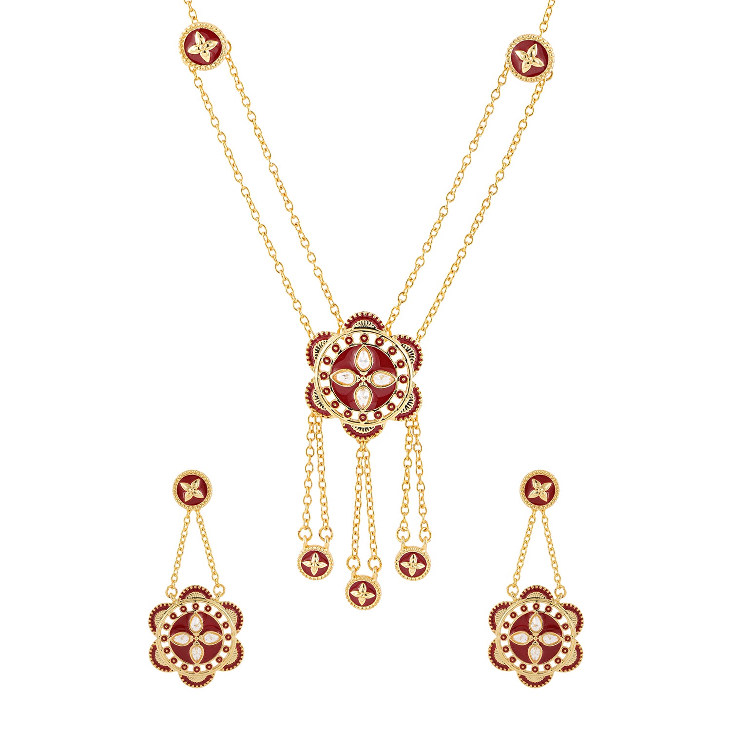 Step into royal elegance with the Gota Patti Surkhphool Necklace Set, a breathtaking enameled ethnic necklace set that combines timeless tradition with modern chic. Crafted in brass and finished with vibrant red enamel work, this ethnic enamel necklace set is inspired by the grandeur of Rajasthan’s Gota Patti embroidery. The bold floral pendant with sparkling reverse AD stones, delicate chain tassels, and matching earrings makes this the ultimate festive jewellery necklace set for weddings, poojas, and celebrations. Perfect as a wedding enamel necklace set or a festive style necklace set, it effortlessly elevates any bridal or festive look. The rich red and gold tones highlight its regal charm, making it a versatile wedding ethnic necklace set that pairs beautifully with lehengas, sarees, or Indo-western outfits. Lightweight yet statement-making, this piece is not just a necklace but a reflection of royal artistry, an heirloom-worthy ethnic fashion necklace set that doubles as a memorable jewellery gift for women. Whether you are the bride, her sister, or the star guest, this festive statement necklace set ensures you shine at every celebration. It is also a thoughtful gift for her, be it a gift for girlfriend, wife, or mother.