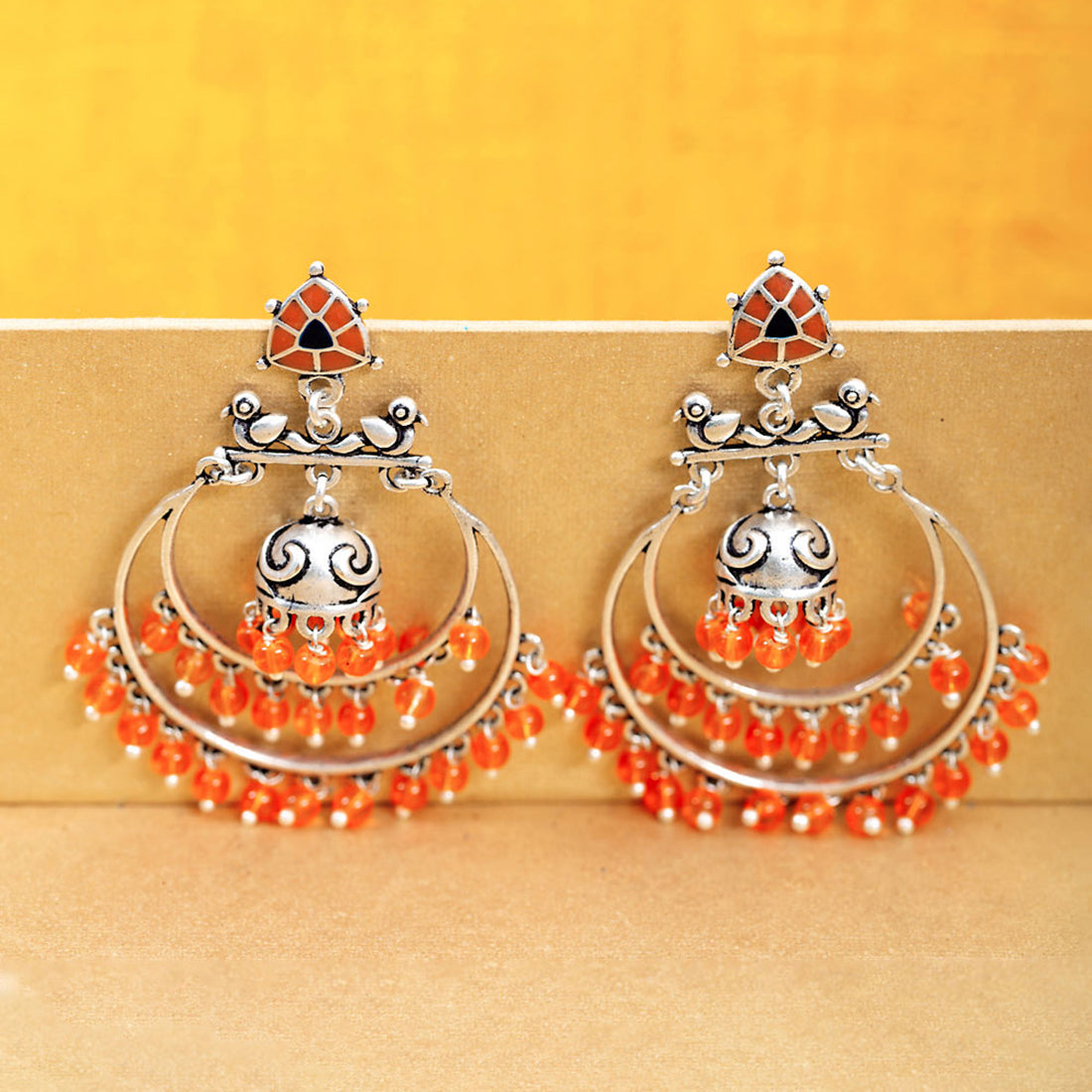 Hoop earrings with jhumka drops, embellished with orange beads and made from brass. Wear the oxidised silver plated earrings with ethnic attire.