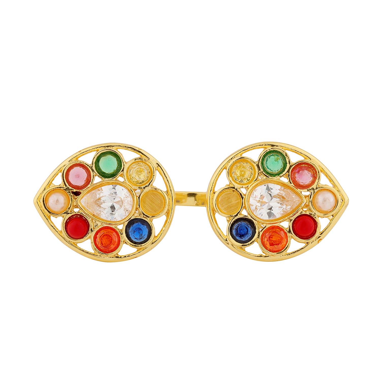 Grace your hands with the divine brilliance of the Navratan Pear of Divinity Two Finger Ring, an exquisite piece that blends heritage, symbolism, and modern artistry. Drawing inspiration from the celestial energy of the Navratan, the nine sacred gemstones that represent planetary harmony, protection, and prosperity. This ring from the Navratan Collection captures the essence of cosmic beauty in a bold, contemporary design. Crafted in brass and finished with a radiant yellow gold plating, this designer ring for women features twin pear-shaped motifs symbolizing divinity and renewal. Each segment is adorned with multicolored gemstones, including ruby red, emerald green, sapphire blue, and pearl white, perfectly arranged around a brilliant teardrop-shaped center stone. The design gracefully spans across two fingers, creating a statement look that’s both regal and refined. This gold ring is ideal for festive wear, weddings, or pooja ceremonies, adding an instant touch of grandeur to your outfit. Lightweight yet luxurious, it’s the perfect mix of culture and couture, crafted for the woman who carries her heritage with elegance and pride. It also makes a thoughtful gift for women, a beautiful gift for wife, or a special anniversary gift symbolizing harmony and everlasting love.