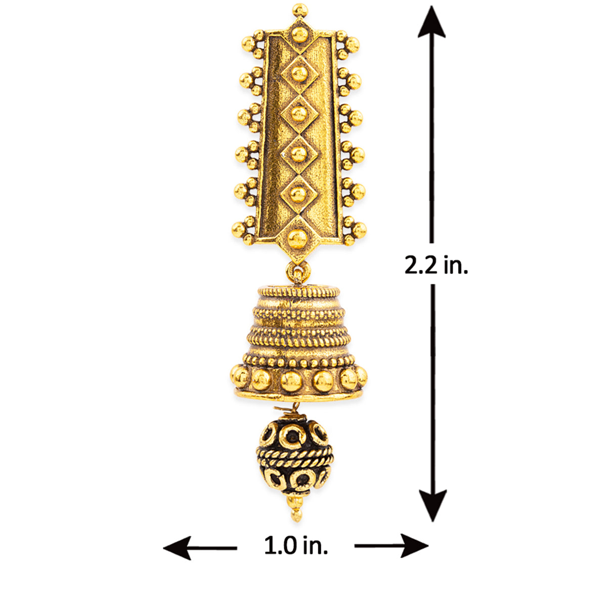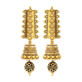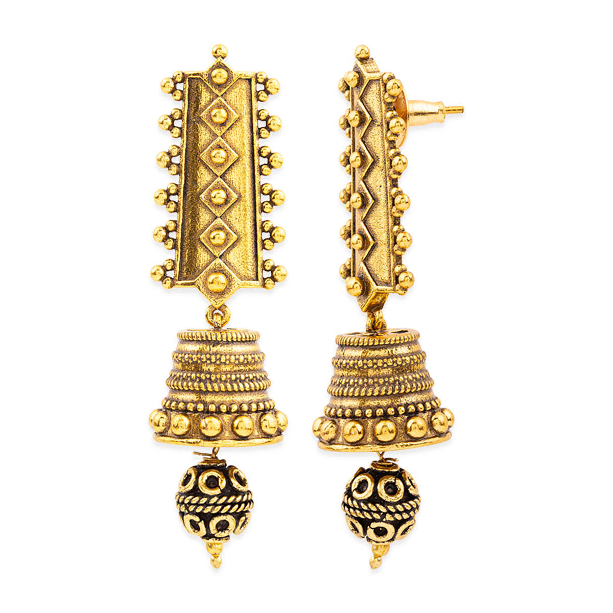 Stand out from the rest by donning these Rava Ball jhumki style earrings. These oxidized gold earrings have been crafted with brass. Pair them with a saree or suit.