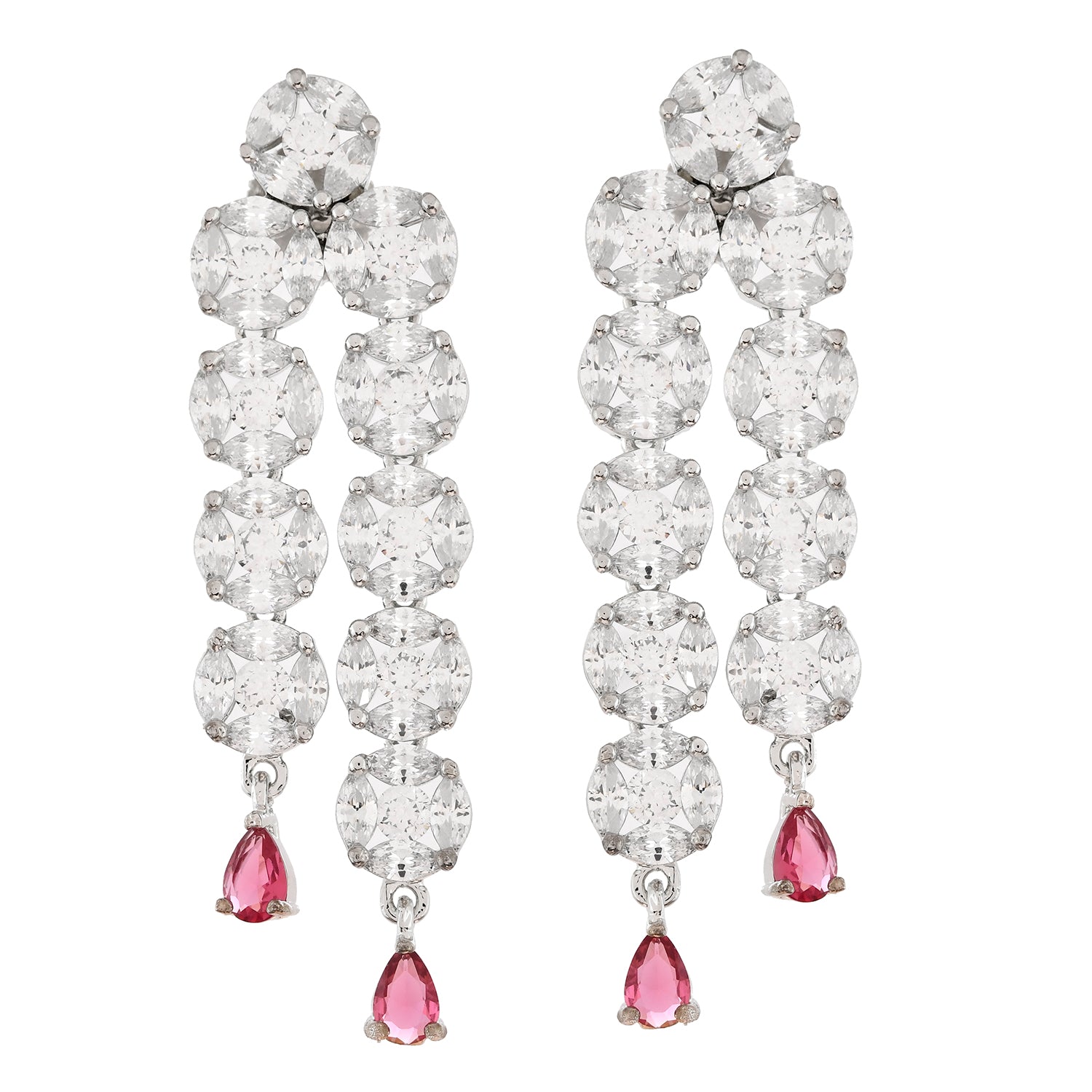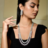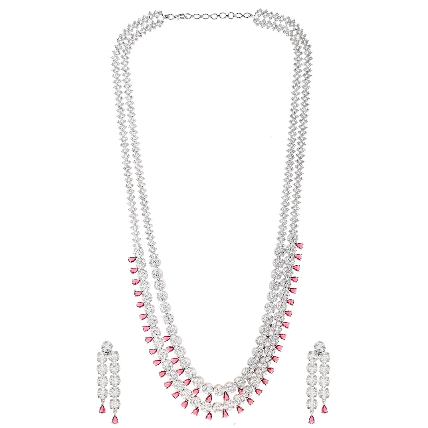 Elevate your elegance with the Voylla Women's Necklace Set, a stunning ensemble crafted from high-quality brass and plated with lustrous white rhodium. This exquisite set features two intricately designed necklaces adorned with sparkling American diamonds, each meticulously set to catch the light and dazzle with every movement. The necklaces are complemented by matching earrings, creating a harmonious and sophisticated look.The design showcases a beautiful arrangement of clear, round-cut American diamonds, accented with vibrant red gemstones that add a touch of color and luxury. The cascading layers of diamonds and gemstones create a mesmerizing effect, perfect for making a statement at any festive or special occasion.Ideal for party wear, weddings, festive celebrations like Diwali and Rakshabandhan, or as a thoughtful gift for Valentine's Day, Christmas, New Year, or Holi. This set makes a perfect gift for women, whether it's for a sister, girlfriend, wife, mother, or any special woman in your life. The Voylla Women's Necklace Set is not just jewelry; it's a timeless piece that embodies grace and sophistication, making it an ideal choice for gifting and personal adornment.