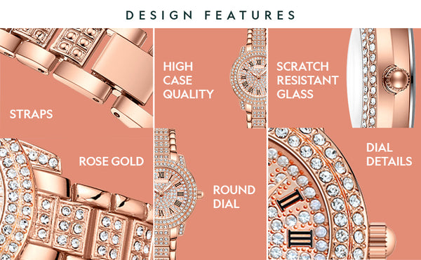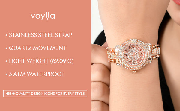 Women's luxurious analog watch studded with round cut gemstones. Made from brass and rose gold plated. Pair with any of your favourite formal outfits.