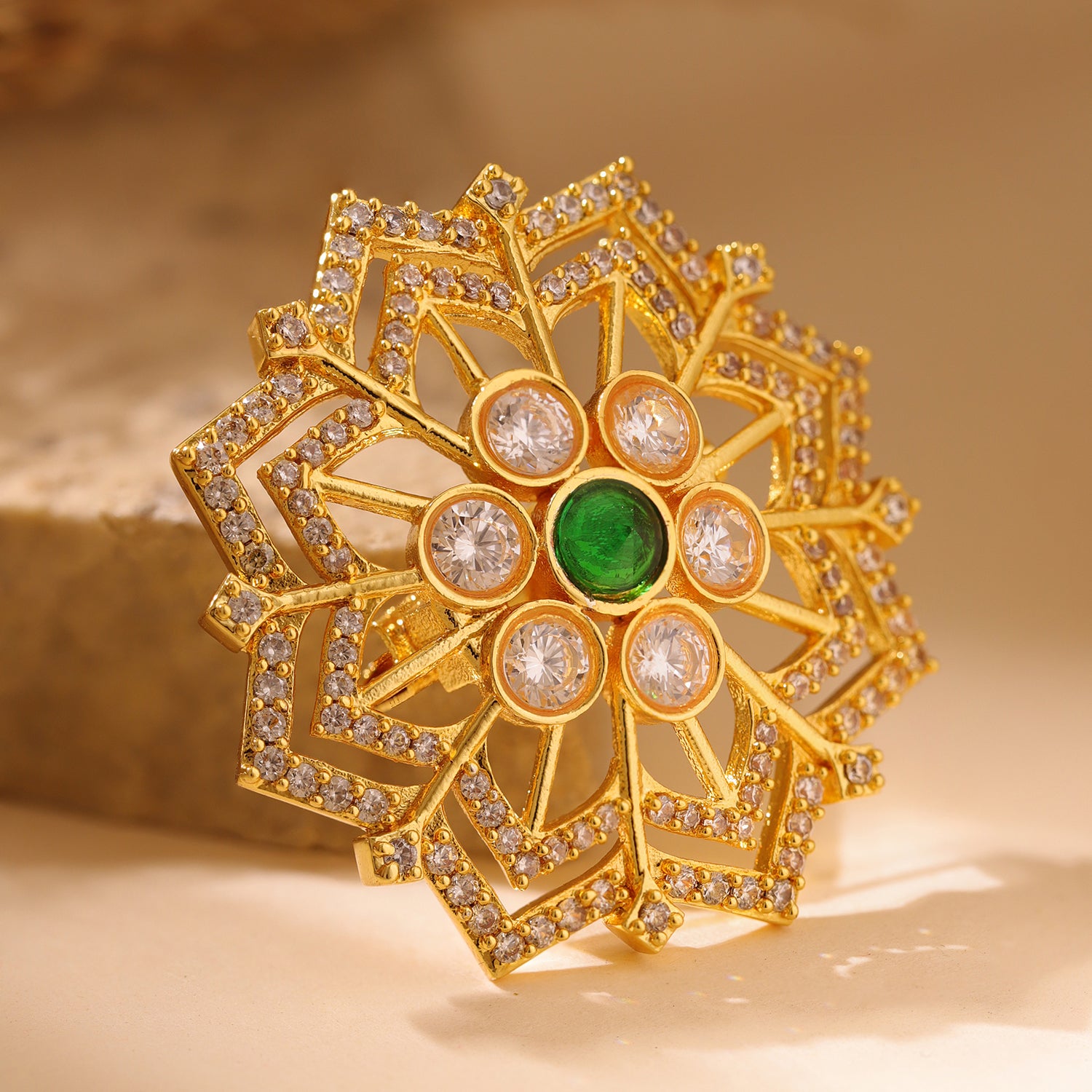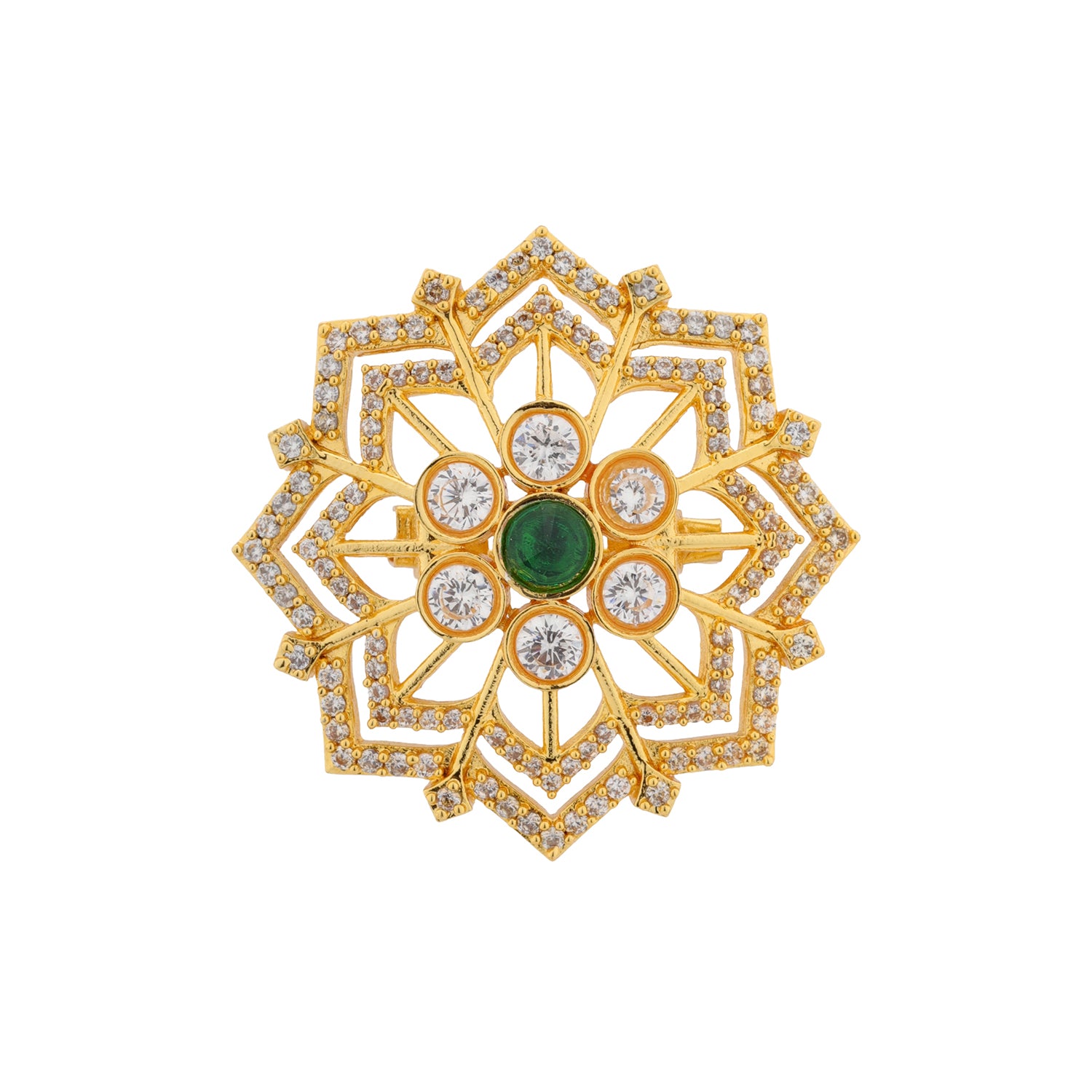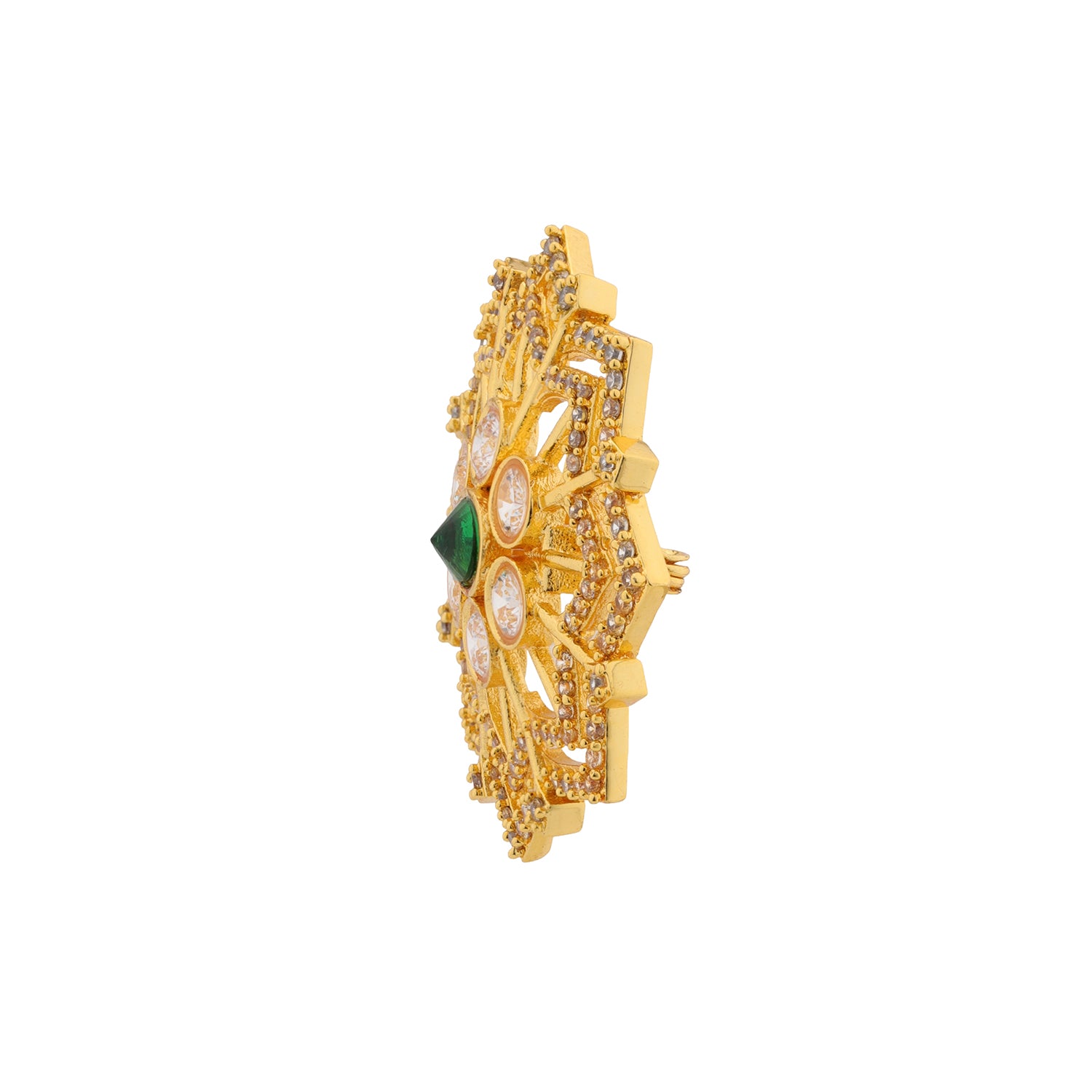 The Kings of Rajasthan Rajveer Brooch is a striking symbol of royal valor and timeless elegance, inspired by the regal insignias worn by Rajasthan’s legendary kings. A proud creation from the distinguished Kings of Rajasthan collection, this brooch is designed for modern grooms and men who wish to carry tradition, strength, and sophistication in every detail. Crafted in premium brass and finished with radiant yellow gold plating, the Rajveer Brooch features an intricate geometric floral motif adorned with sparkling Kundan stones and a rich green centerpiece, representing prosperity and royal pride. Its bold yet balanced design makes it a powerful statement accessory that elevates sherwanis, bandhgalas, and tailored suits alike. Inspired by Rajasthan’s iconic kings and queens, this brooch is created for those who want their accessories to feel meaningful, deeply rooted in heritage yet effortless to wear. Whether worn as a sherwani brooch by the dulha, styled as a lapel pin for formal occasions, or chosen as a thoughtful gift for groom, the Rajveer Brooch adds a majestic finishing touch to every celebration.