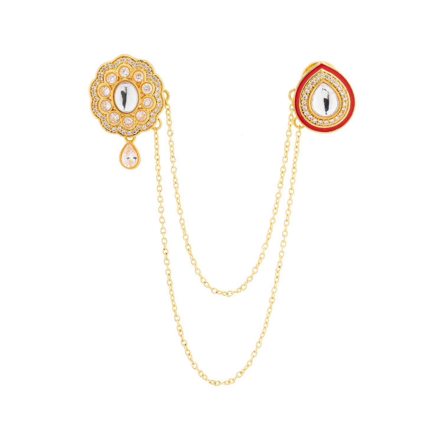 The Kings of Rajasthan Rudraj Brooch is a refined symbol of royal masculinity, inspired by the ceremonial adornments worn by the kings and nobles of Rajasthan. Part of the distinguished Kings of Rajasthan collection, this brooch is designed for modern grooms and men who value heritage, elegance, and meaningful detailing in their accessories. Crafted in premium brass and finished with luxurious yellow gold plating, the Rudraj Brooch features classic Kundan craftsmanship accented with rich enamel detailing. The dual-motif design connected by a graceful chain reflects traditional Rajputana styling, adding a regal touch to sherwanis, bandhgalas, and even tailored suits. Inspired by Rajasthan’s iconic kings and queens, this brooch is created for men who want their accessories to feel rooted in tradition yet effortless to wear. Whether styled as a sherwani brooch for a wedding, worn as a lapel pin for formal occasions, or chosen as a thoughtful gift for groom, the Rudraj Brooch brings timeless royal charm to every celebration.