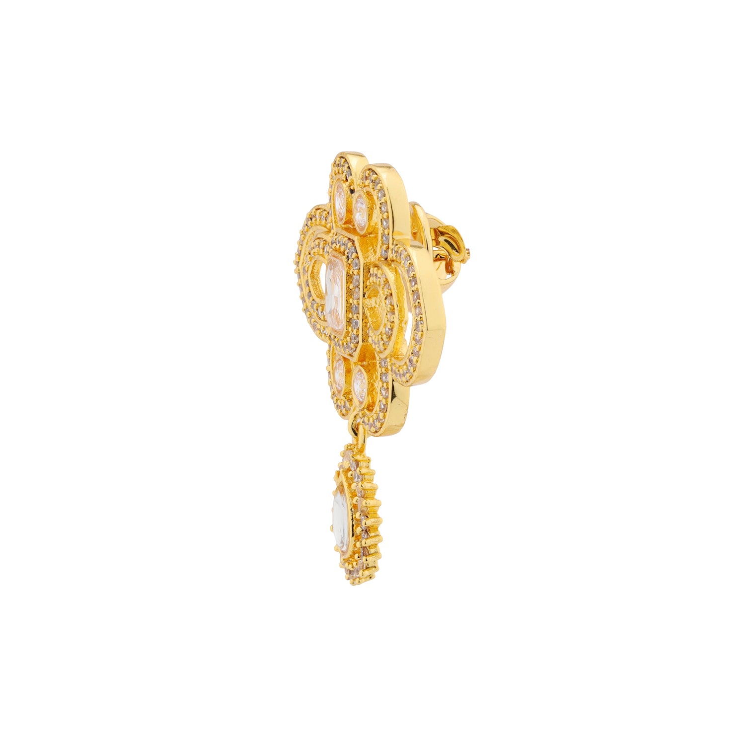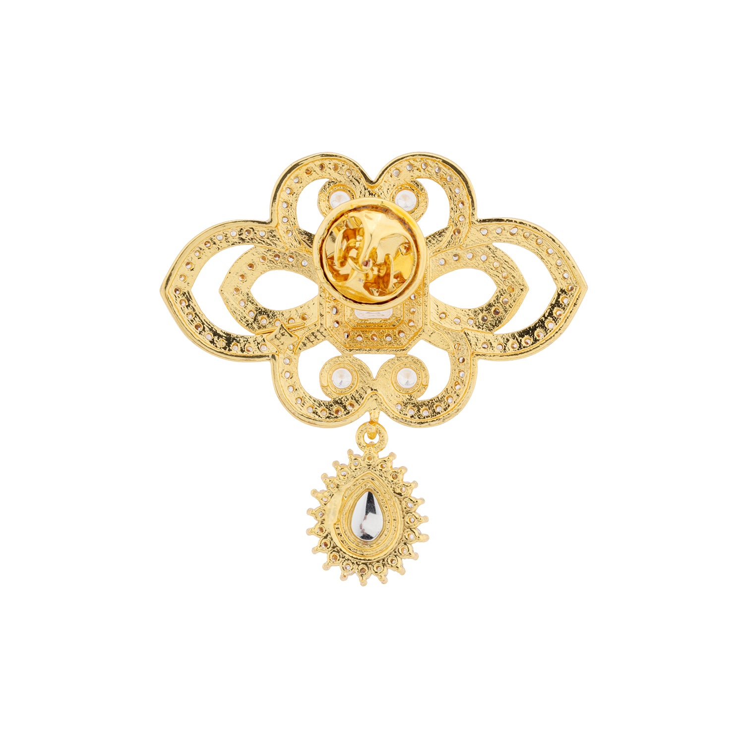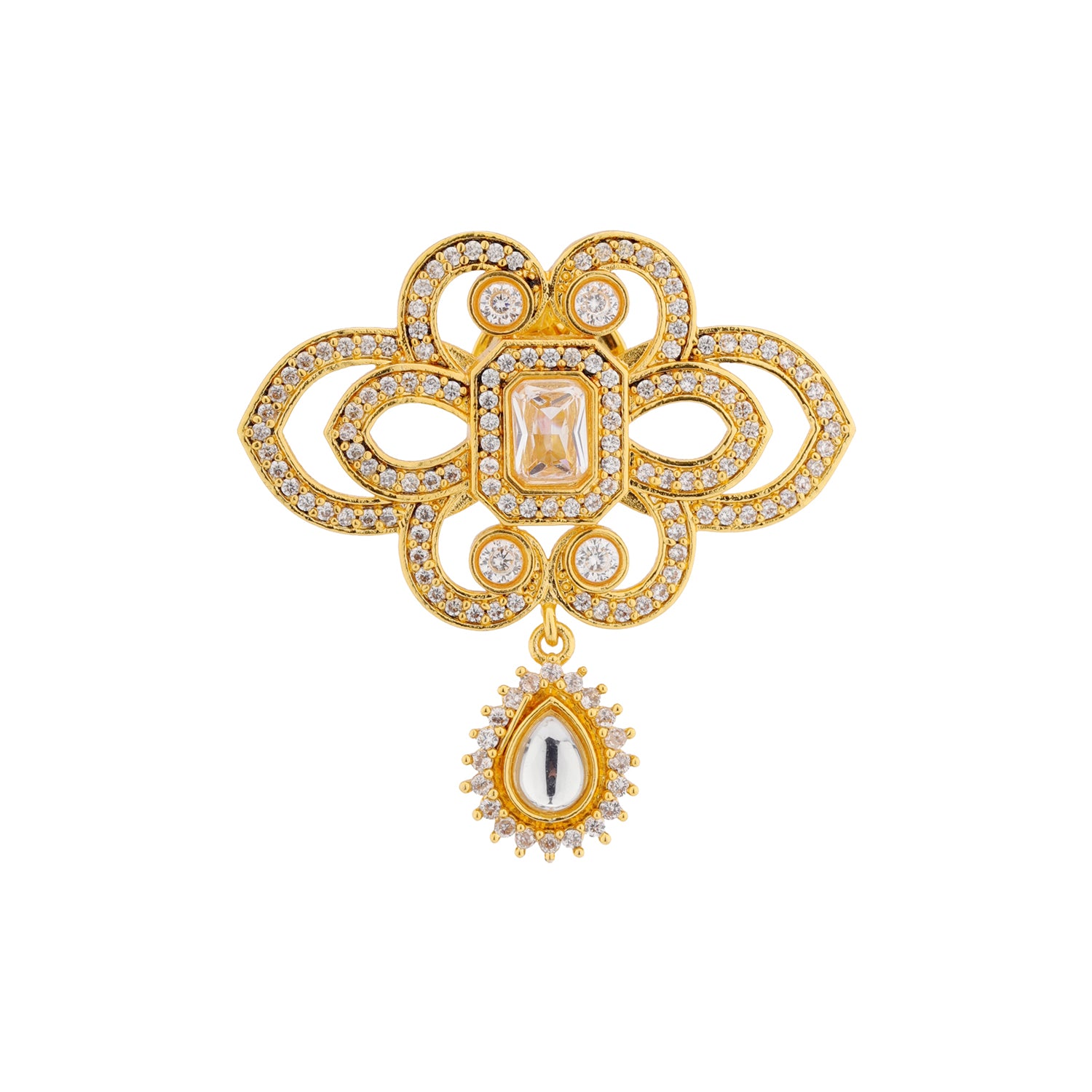 The Kings of Rajasthan Suryaveer Brooch is a radiant emblem of strength, honor, and royal elegance, drawn from the ceremonial adornments worn by Rajasthan’s valiant kings. Part of the distinguished Kings of Rajasthan collection, this brooch is designed for modern grooms and men who appreciate heritage craftsmanship with a refined, contemporary finish. Expertly crafted in premium brass and finished with rich yellow gold plating, the Suryaveer Brooch features intricate Kundan work arranged in a regal floral-inspired motif with a graceful drop detail. The sculpted form and sparkling stones reflect Rajputi artistry while remaining lightweight and comfortable, perfect for weddings and formal celebrations. Inspired by Rajasthan’s iconic kings and queens, this brooch is created for men who want their accessories to feel meaningful, rooted in tradition yet effortless to wear. Whether styled as a sherwani brooch for the dulha, worn as a lapel pin on a tailored suit, or gifted as a memorable gift for groom, the Suryaveer Brooch adds a timeless royal statement to every ensemble.
