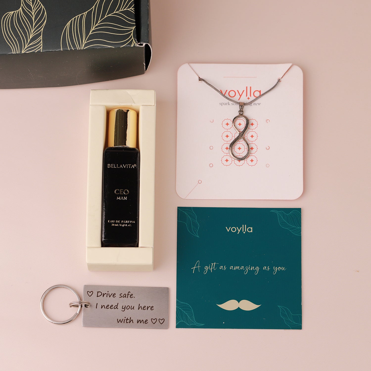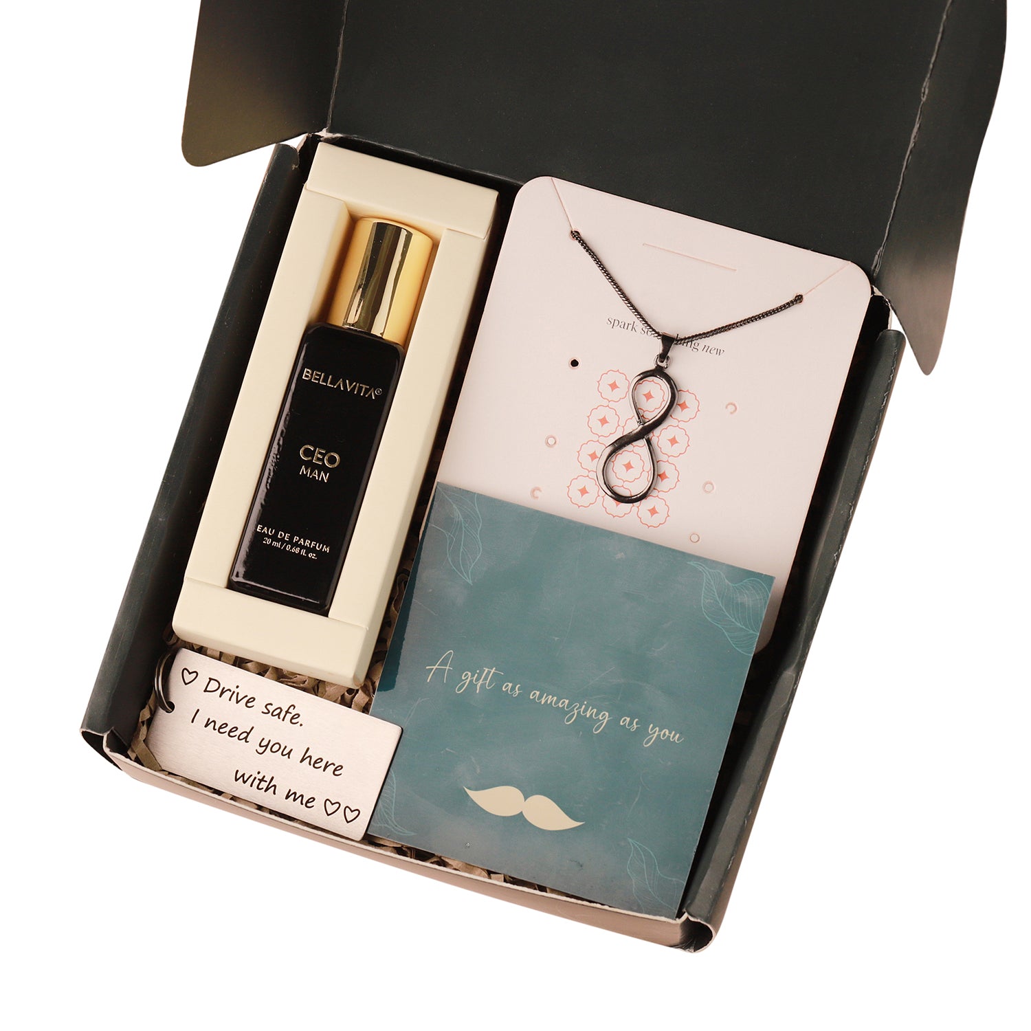 The Bestest Boyfriend Valentine Hamper is the epitome of love and elegance, perfect for showing your special someone just how much they mean to you. Included in this exquisite hamper are a Drive Safely Keychain, a 20 ML bottle of Bella Vita Perfume for Men, an Eclipse Statement Infinity Black Men's Pendant, and a card that reads "A gift as amazing as you." The Drive Safely Keychain is not only practical but serves as a daily reminder of your care. The Bella Vita Perfume, crafted with premium ingredients, offers a sophisticated fragrance perfect for any occasion. The Infinity Black Men's Pendant symbolizes eternal love, adding a touch of modern elegance to any outfit. This thoughtfully curated collection combines practicality and sentiment, making it a perfect Valentine's gift for your boyfriend, husband, or lover.