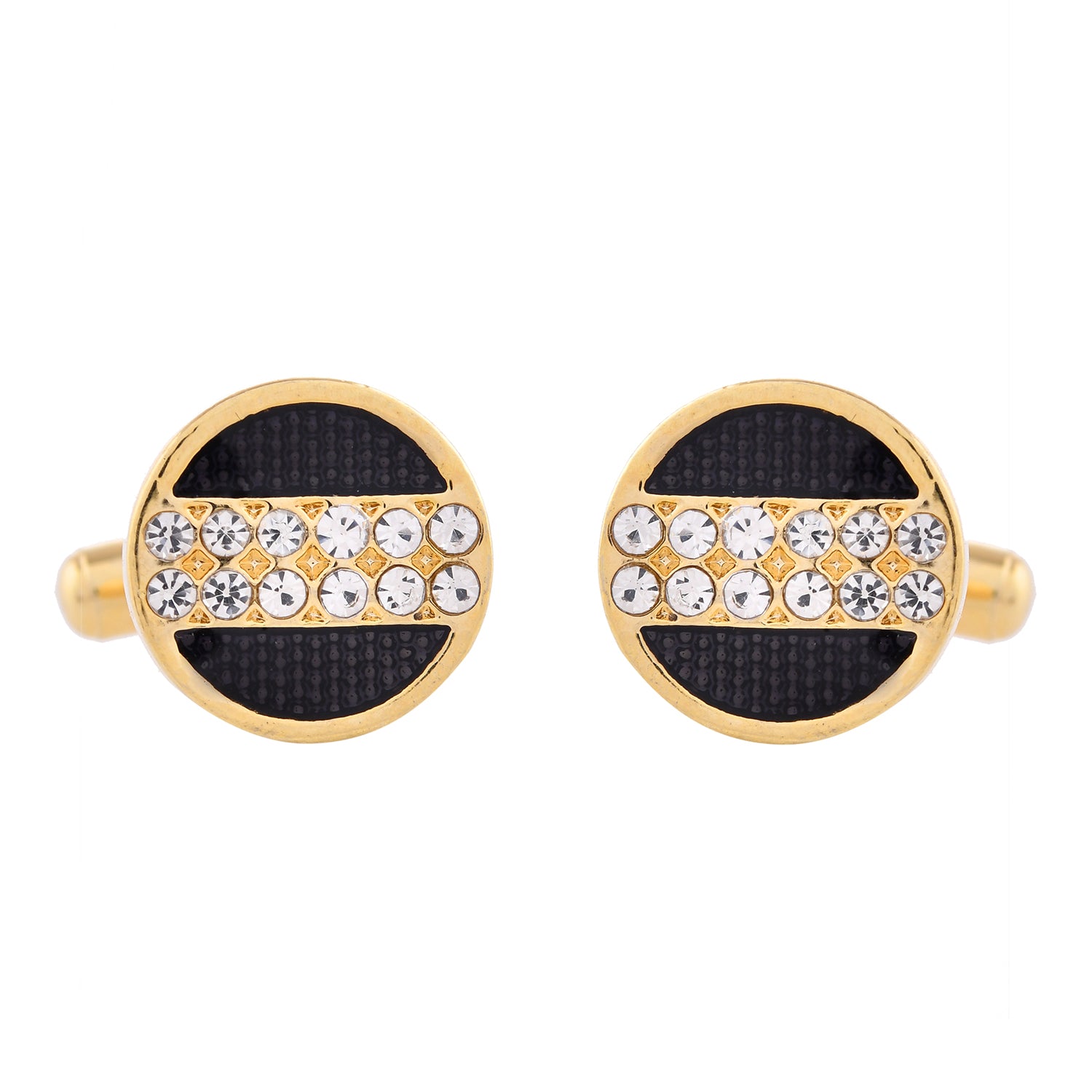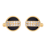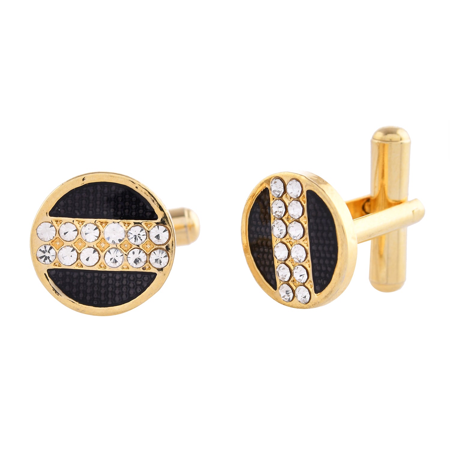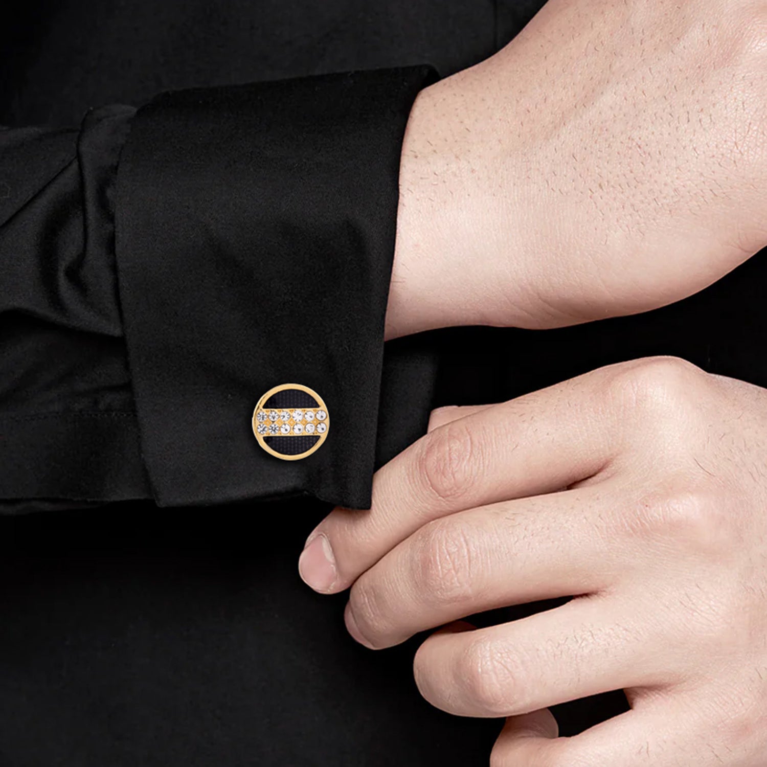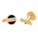 The Voylla's Titan Elite Men's Cufflinks from The Gentleman’s Club Collection are a stunning addition to any wardrobe, designed to exude sophistication and elegance. Crafted from high-quality alloy and plated with gold, these cufflinks feature a striking round design adorned with American diamonds. The intricate detailing includes a central vertical strip of sparkling diamonds flanked by textured black sections, creating a bold yet refined look. Perfect for both everyday wear and special occasions, these cufflinks are versatile enough to complement formal, festive, and chic outfits. Whether attending a wedding, a cocktail party, or a formal business meeting, these cufflinks make a statement of style and class. They also make an excellent gift for men, suitable for occasions such as Valentine's Day, Diwali, Rakshabandhan, Christmas, and New Year. Ideal for gifting to a boyfriend, husband, father, or brother, these cufflinks are a timeless piece of jewelry that will be cherished for years to come.