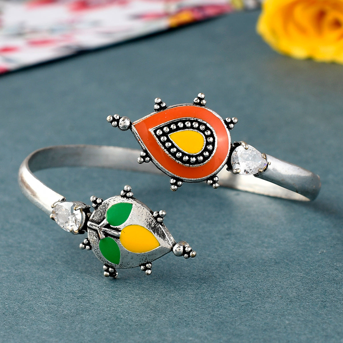 Tribal motifs brass bracelet inspired by the art and designs of block printing. Wear the silver plated bracelet with Indo-Western attire. This piece of jewelry comes with the Voylla assurance of quality and durability.